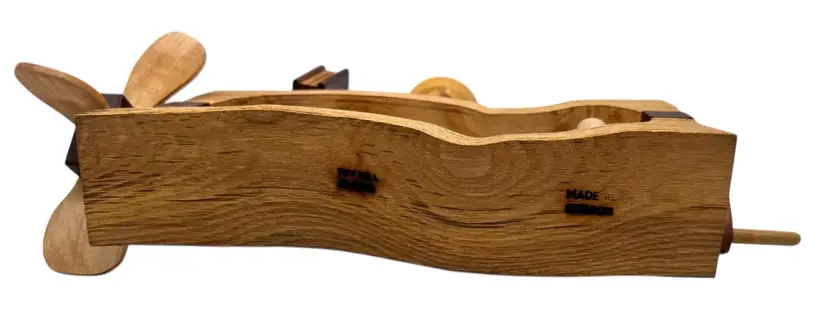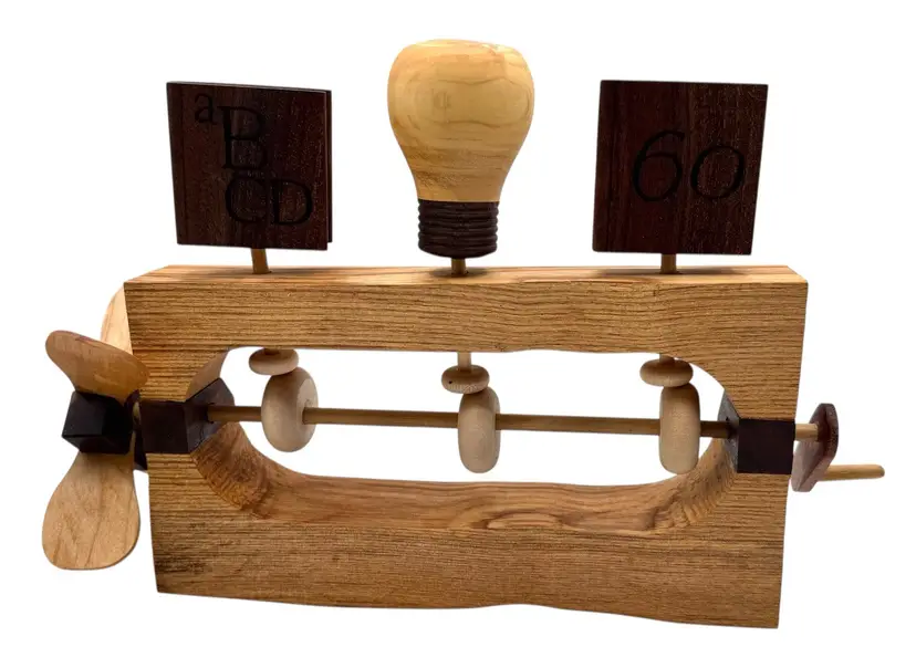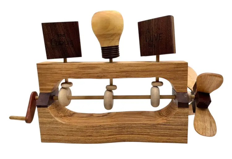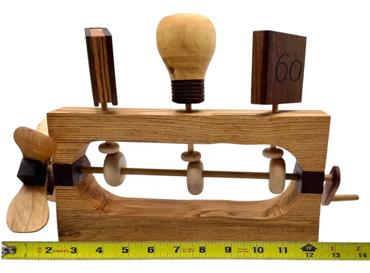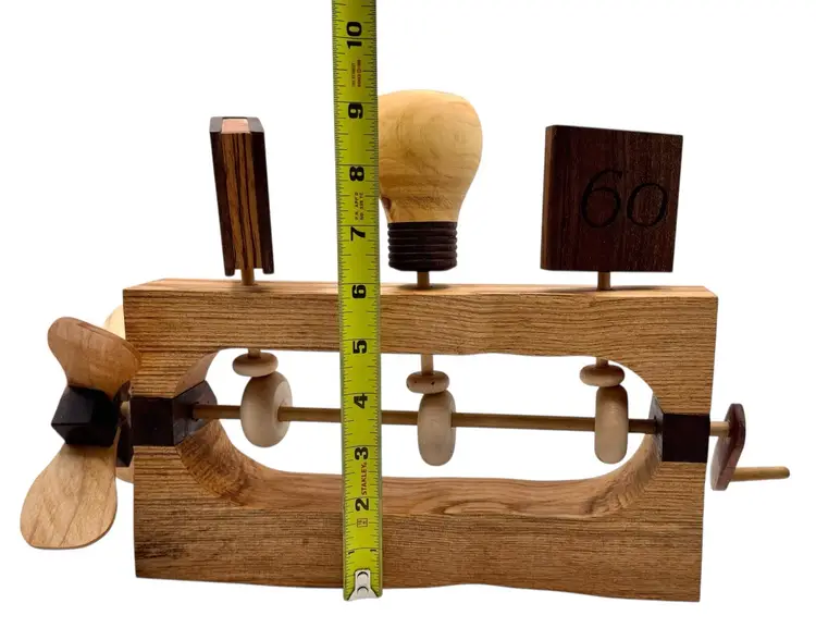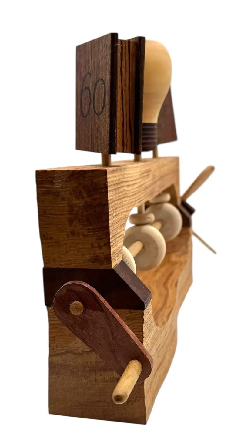 Handmade automata; the lightbulb and books spin when cranked. It is personalized ‘ABC+D’ ‘60 Years & Counting’, however this could be covered/ sanded and restained.