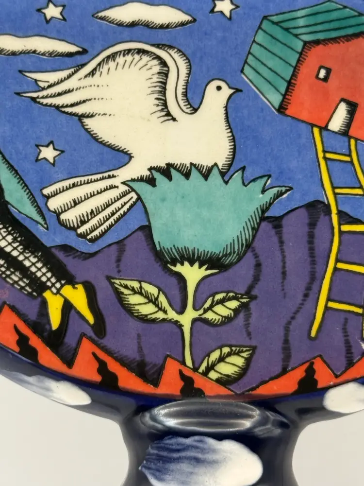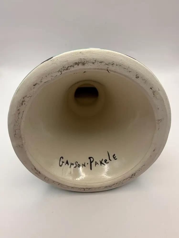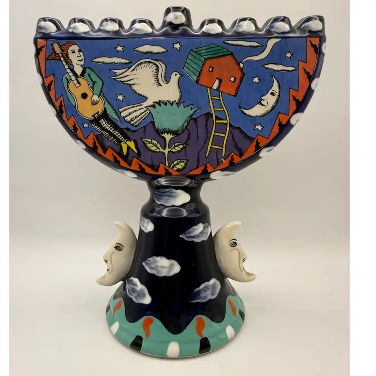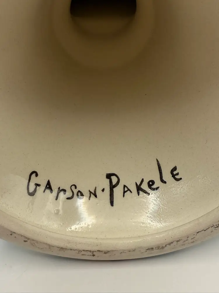 Garson-Pakele Hand Painted Menorah. Incredible hand painted image on cast porcelain Features a wonderful design on both sides. Susan Garson and Tom Pakele are a team who specialized in hand painted Judaica and tea pots Tom creates and casts the molds and Susan does the fine hand painting. Their work can be seen in galleries No chips or cracks 8.25H x 7.25W