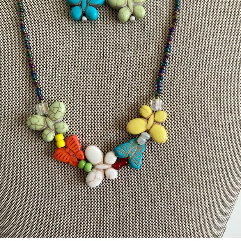 Vintage iridescent aurora borealis beaded necklace with carved Howlite butterflies with matching earrings. Length is adjustable from 20" to 20 1/2". Created by me using 100% vintage beads.