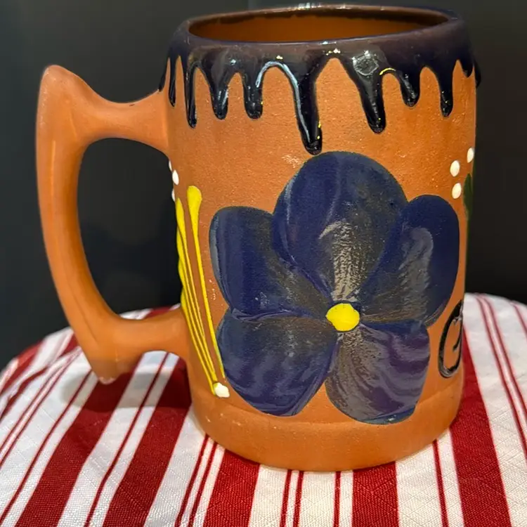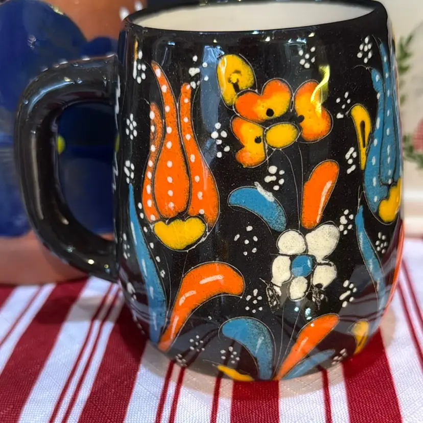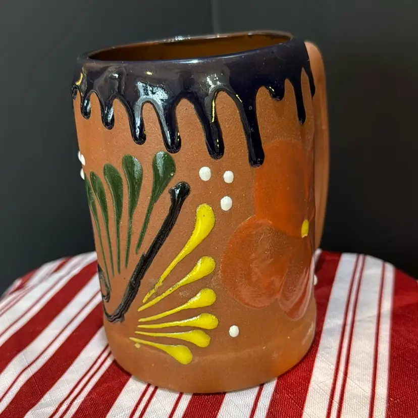 Variety of awesome mugs! The largest measures 5 1/4 inches tall. Hand painted. The Christmas mug measures 4 inches tall. And the hand painted black mug measures about 3 1/2 inches. It does have some crazing due to age. Would be great to add candy or a small plant to for gifting.