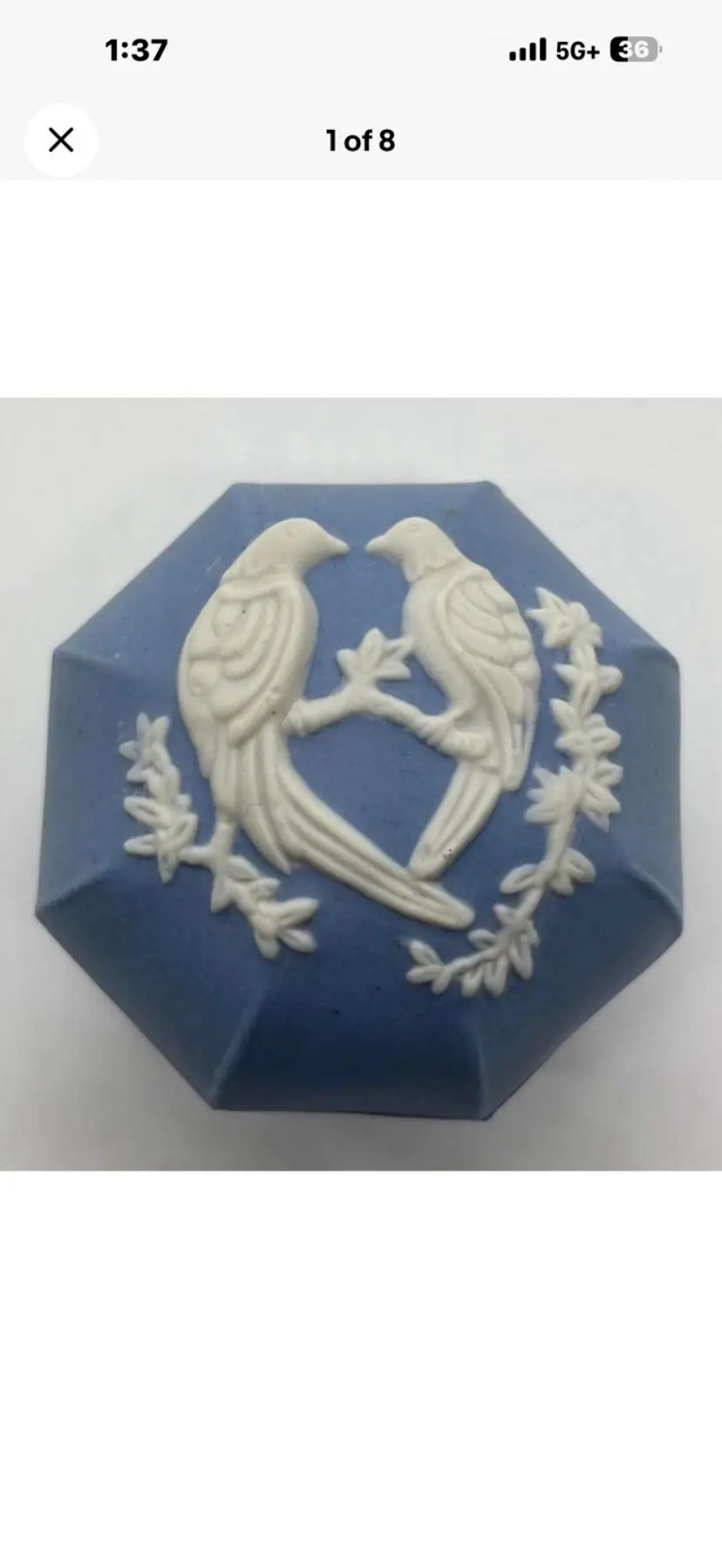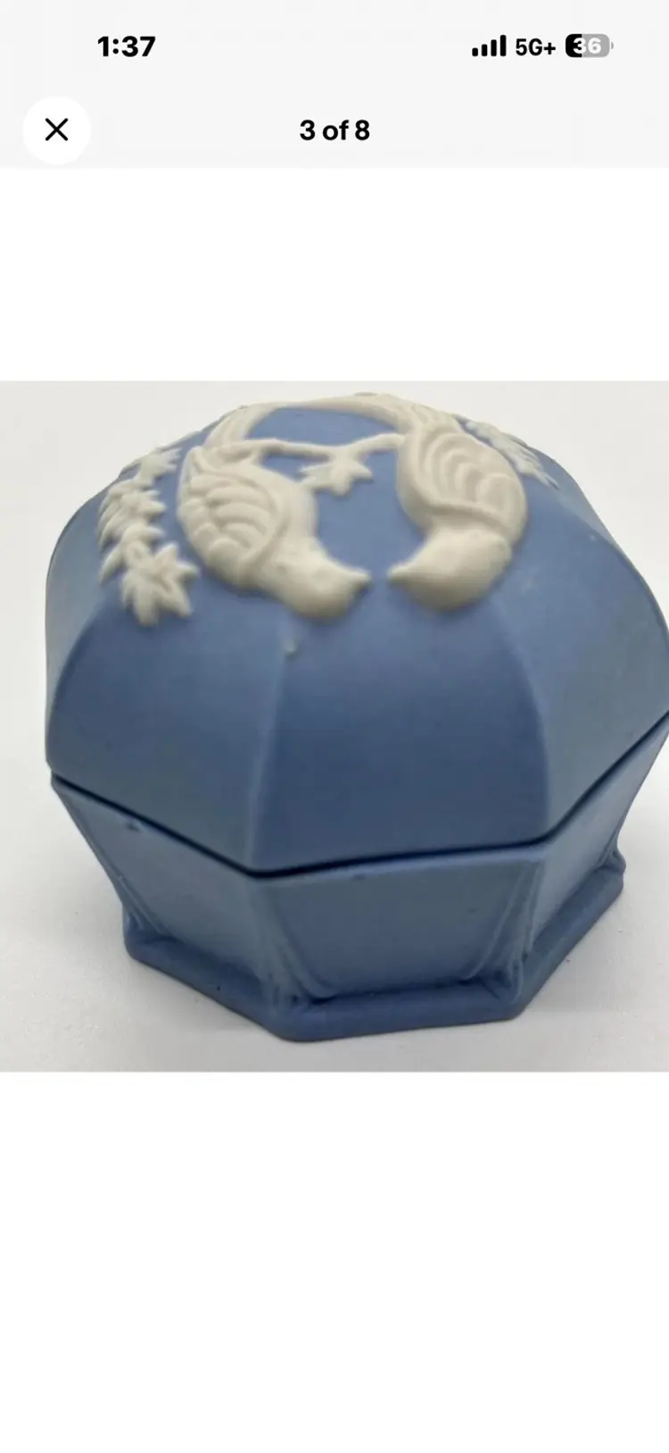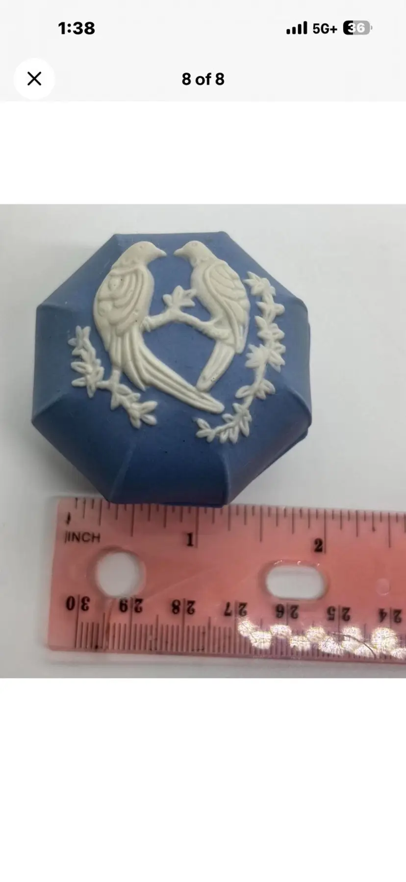 Cute small vintage blue and white geometric trinket box with 2 birds. Lid is completely removable. Excellent used condition. No chips or cracks.