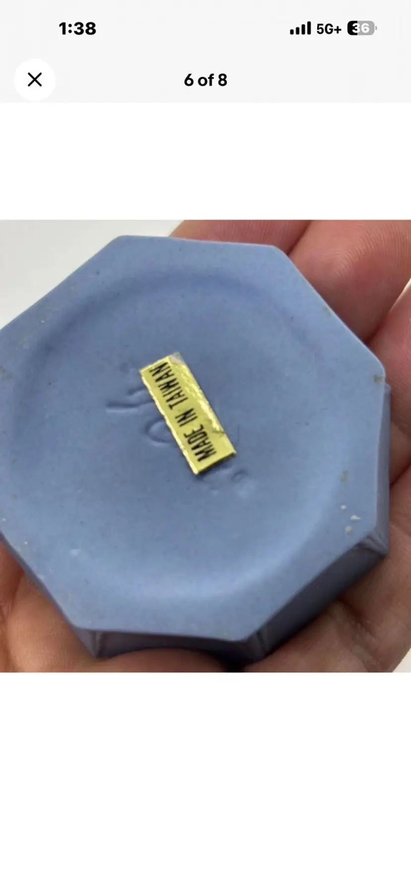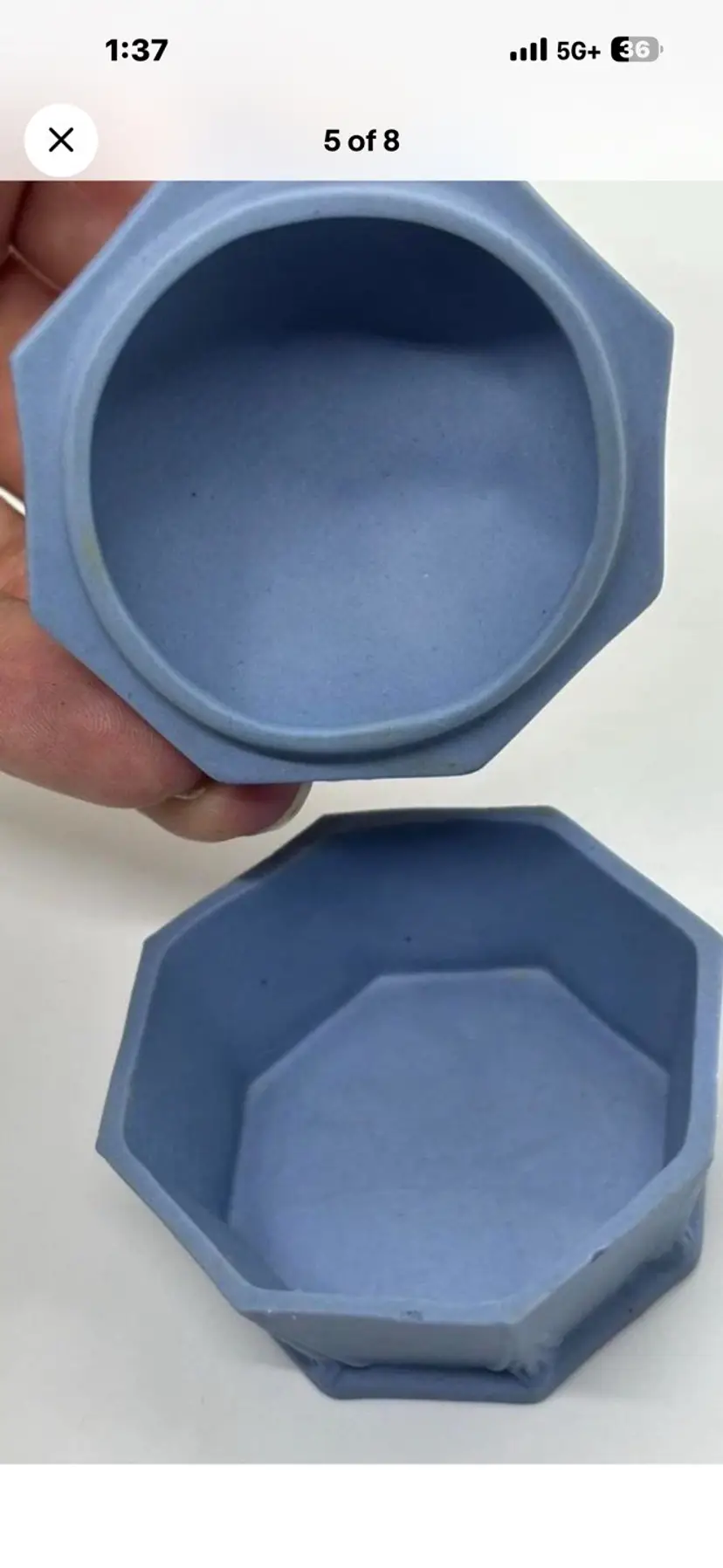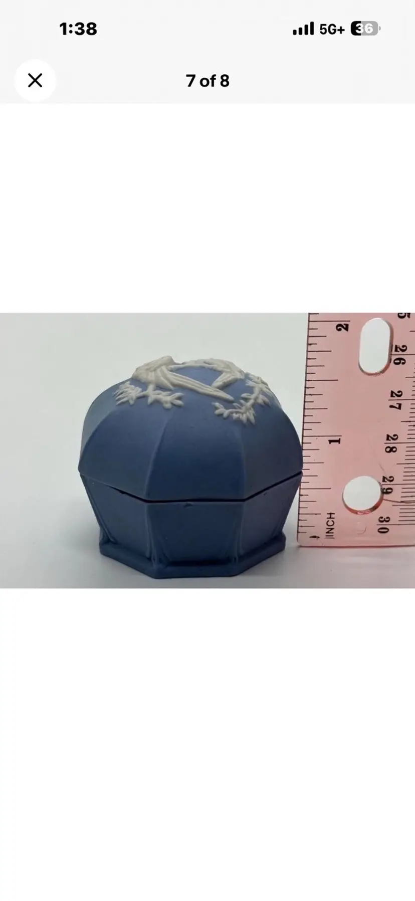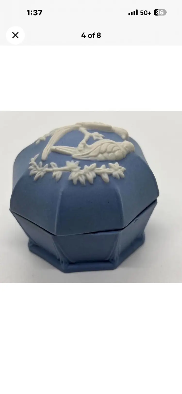 Cute small vintage blue and white geometric trinket box with 2 birds. Lid is completely removable. Excellent used condition. No chips or cracks.