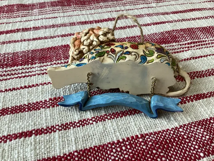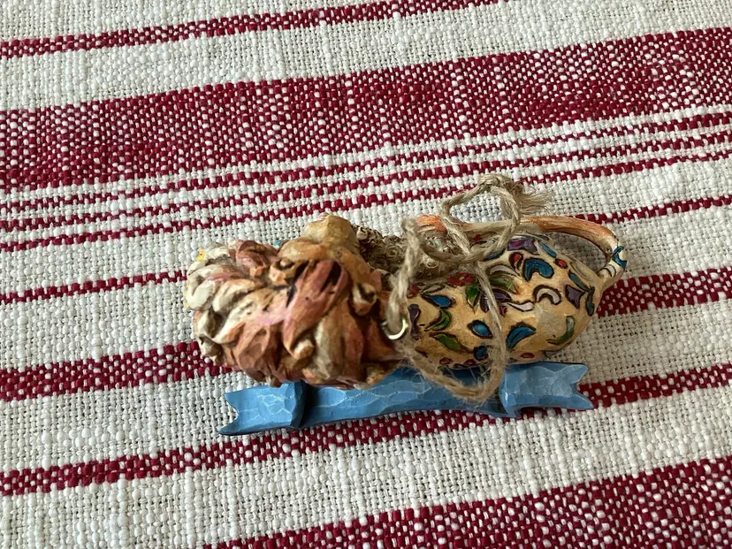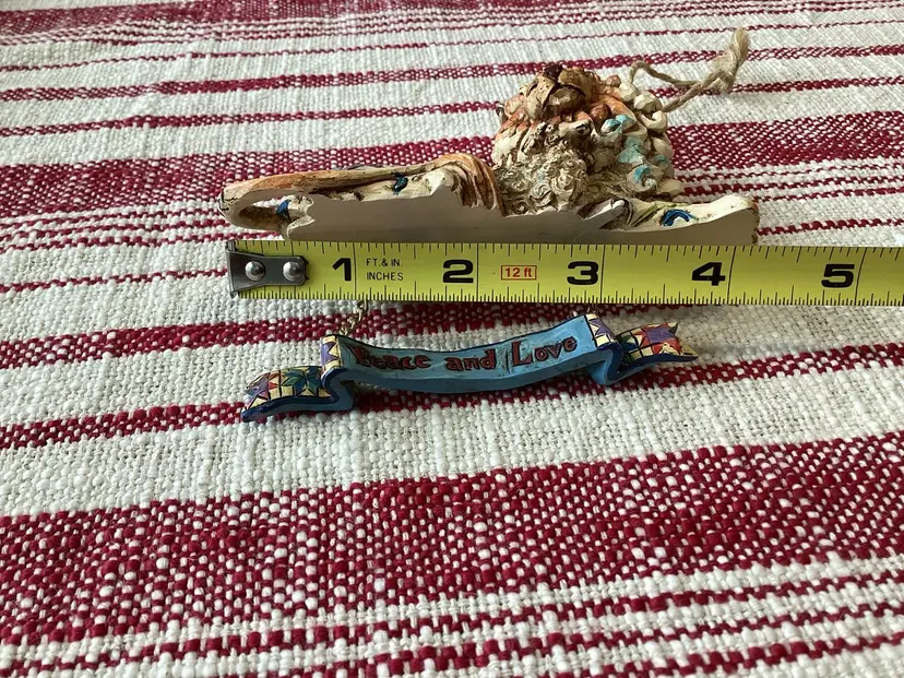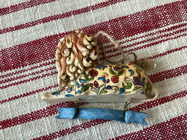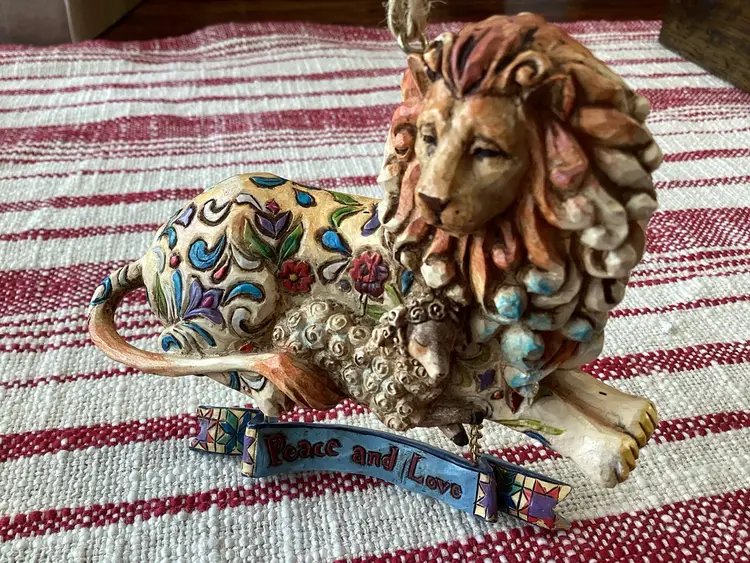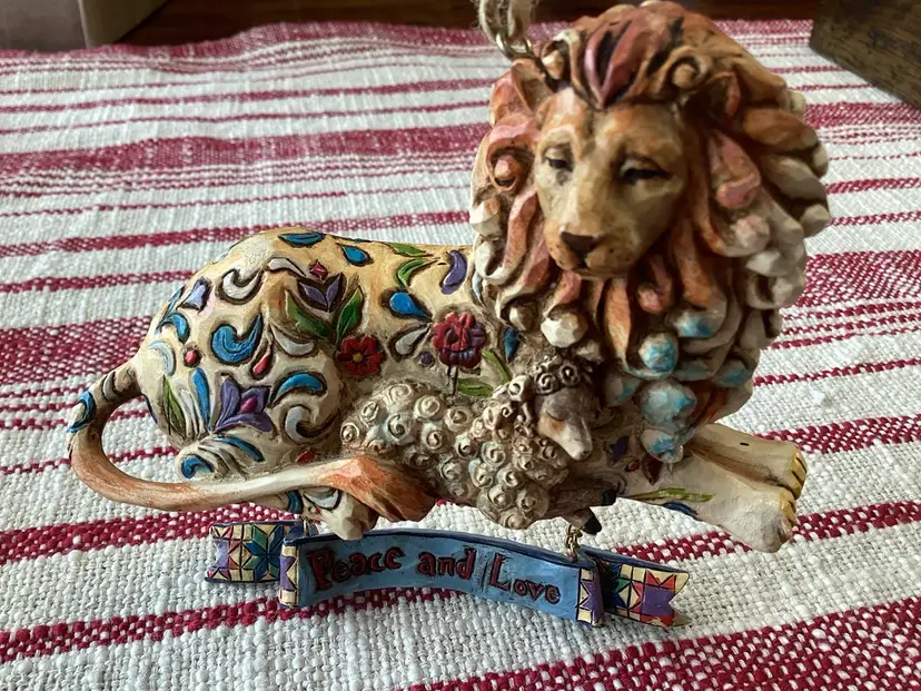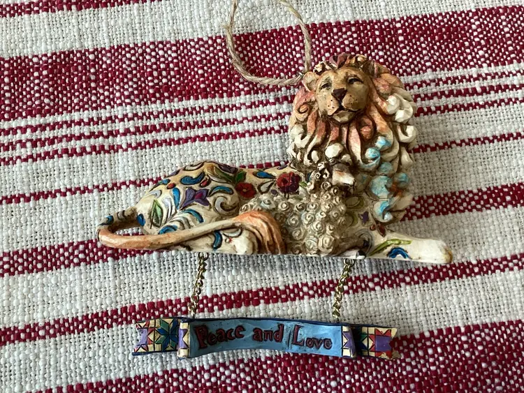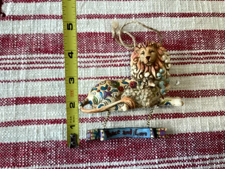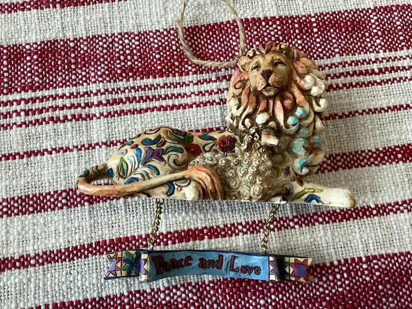 Ornament featuring the lion and Lamb. Beautiful multi color decorations. There is blue discoloration on the bottom of the lion underneath and a slight wear spot on the top as shown in the pictures.