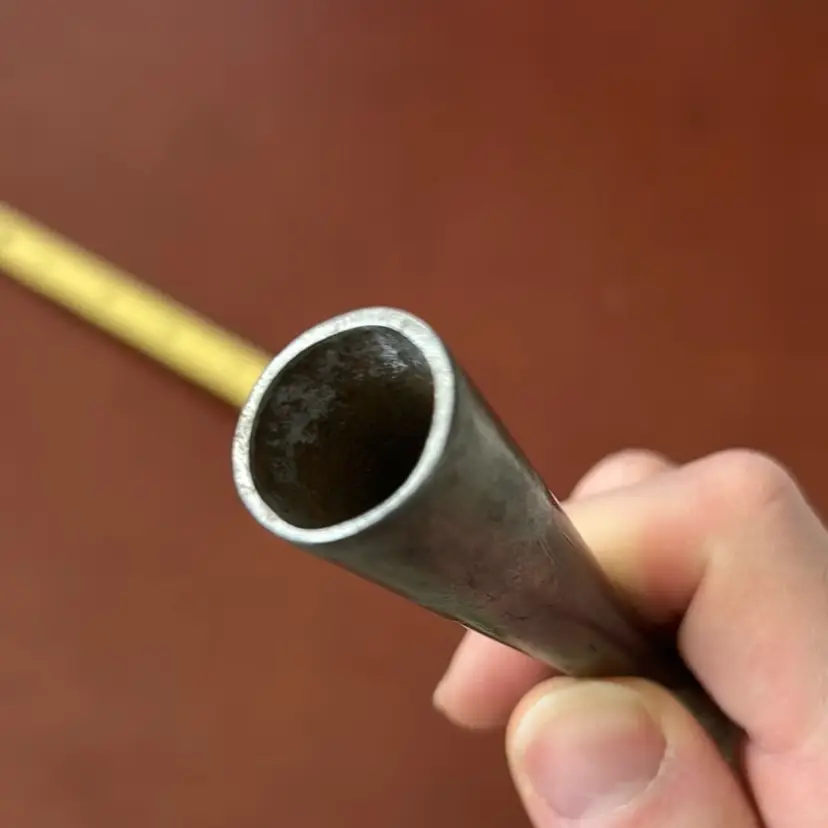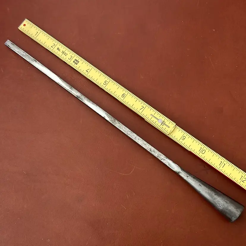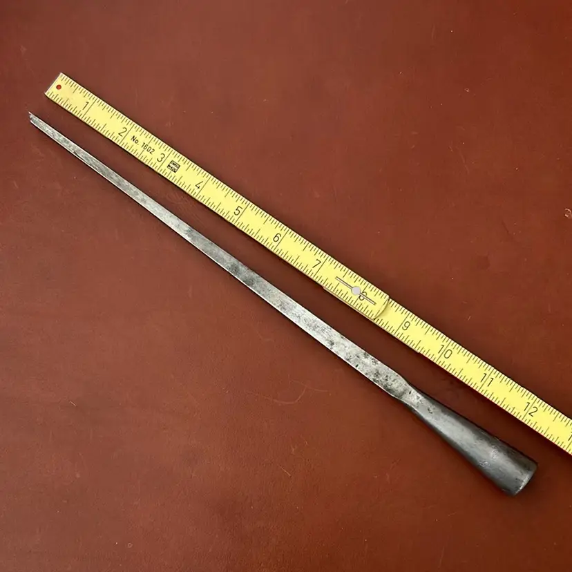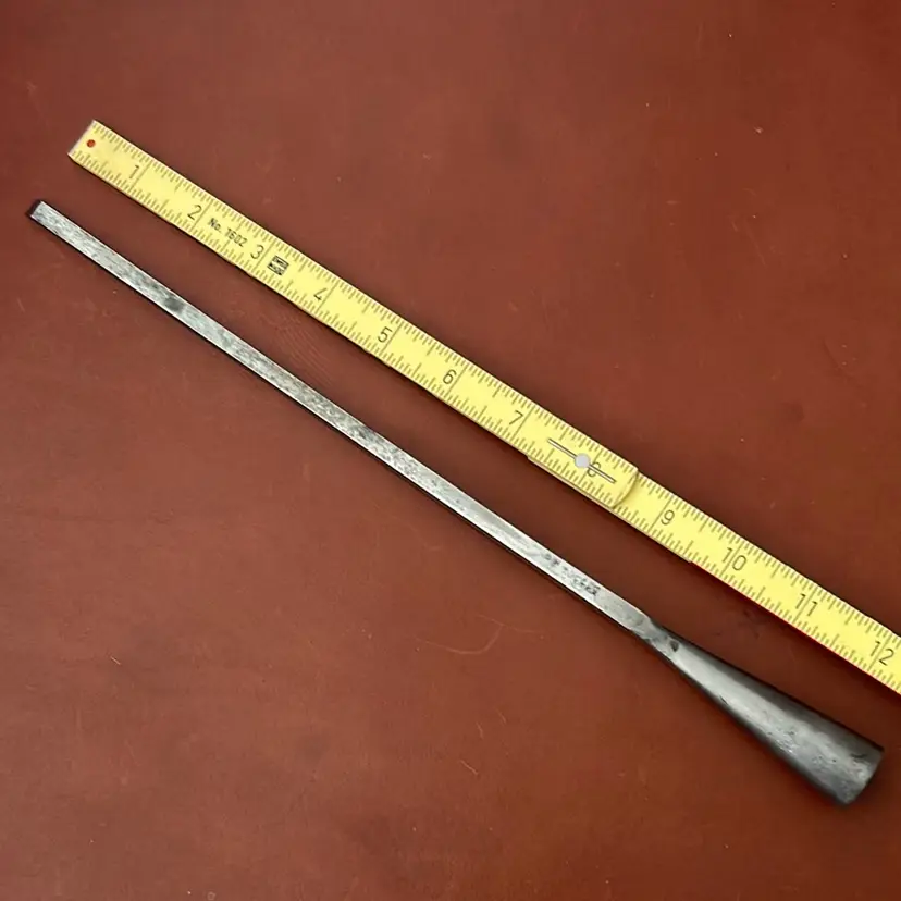 This is a specialty chisel for chopping deep mortises by hand. 1/4” wide but can reach 9” deep. I never had a handle with it, I just restored the edge profile and flattened the back a bit so it just needs a handle and secondary bevel to start working. I can’t read the makers mark.