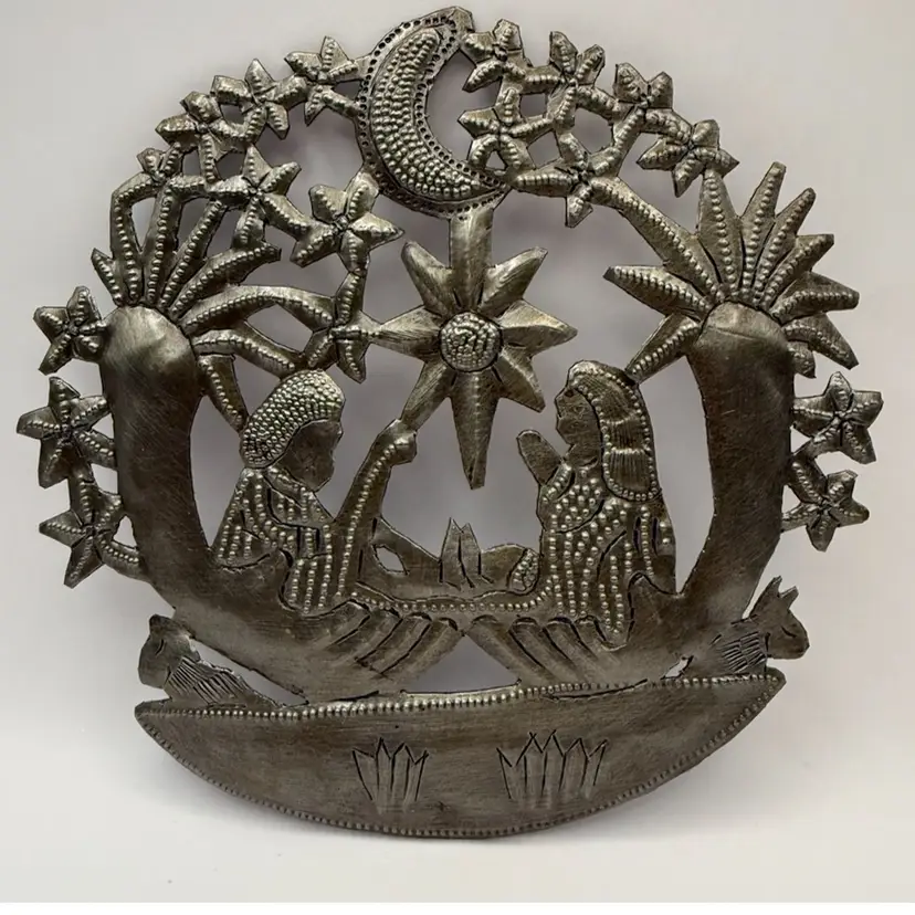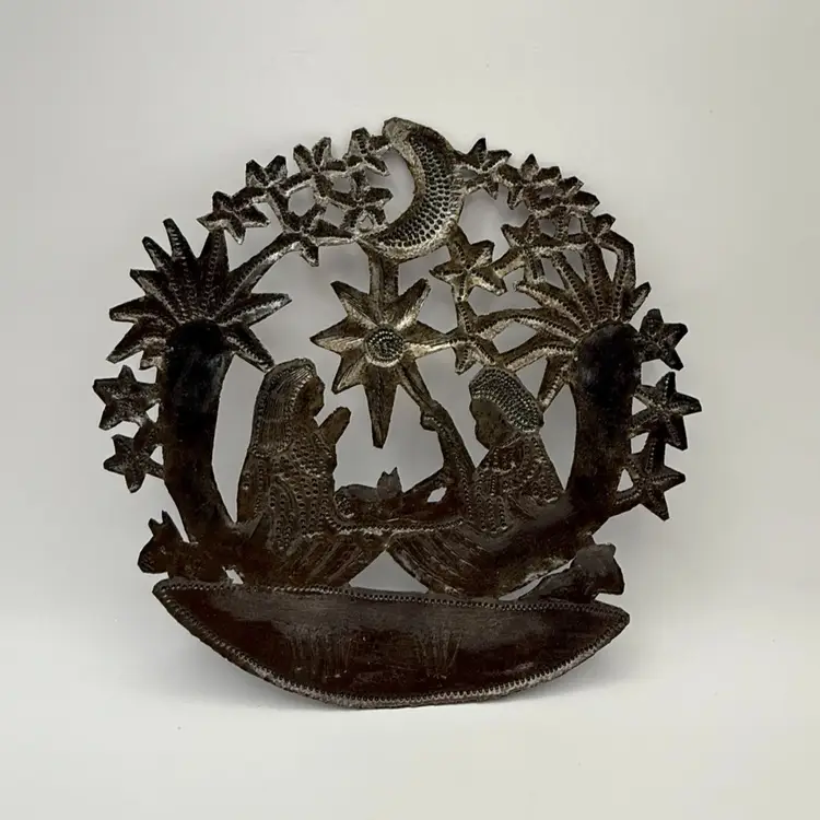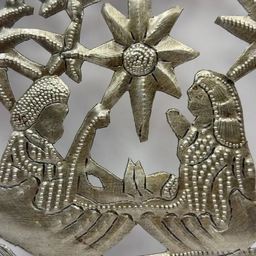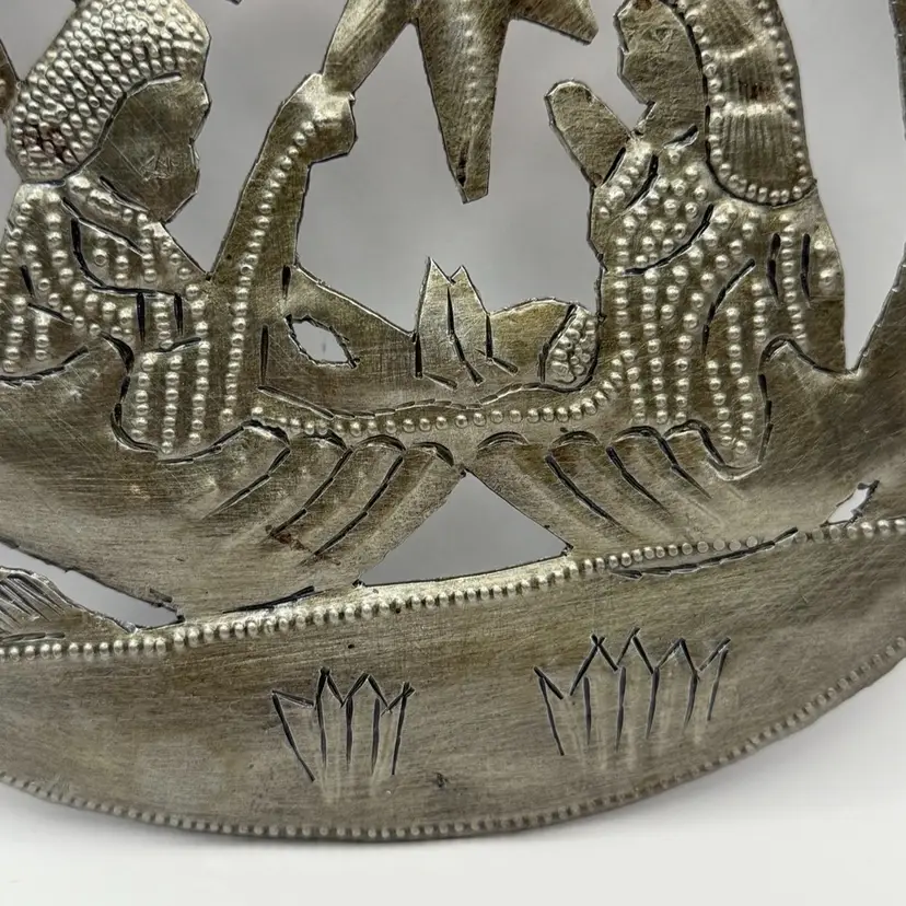 Wonderful example of handcrafted Mexican Tin Art. This scene depicts the holy family held up by the Fathers hands. Can be used on easel or a wall hanging. Made of heavy tin. Good condition About 7” in diameter