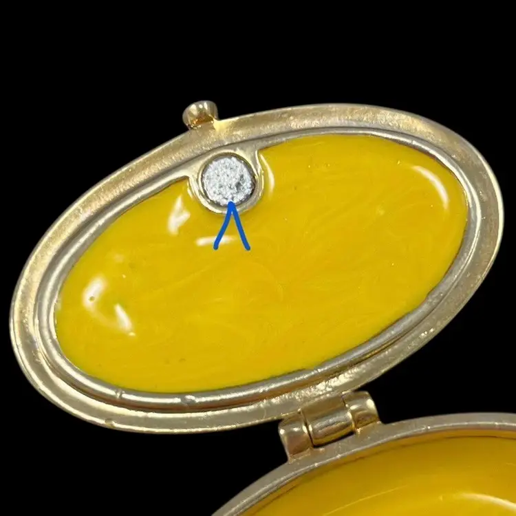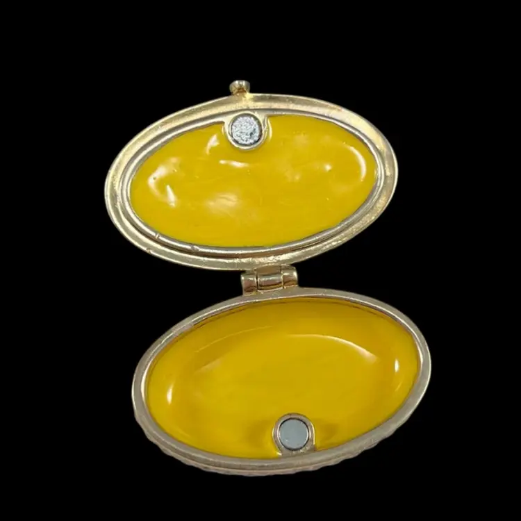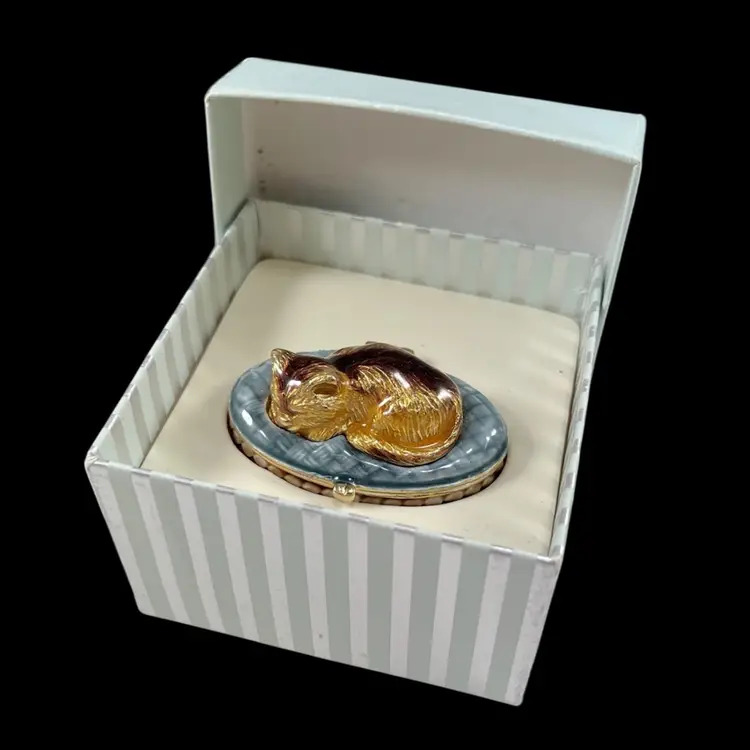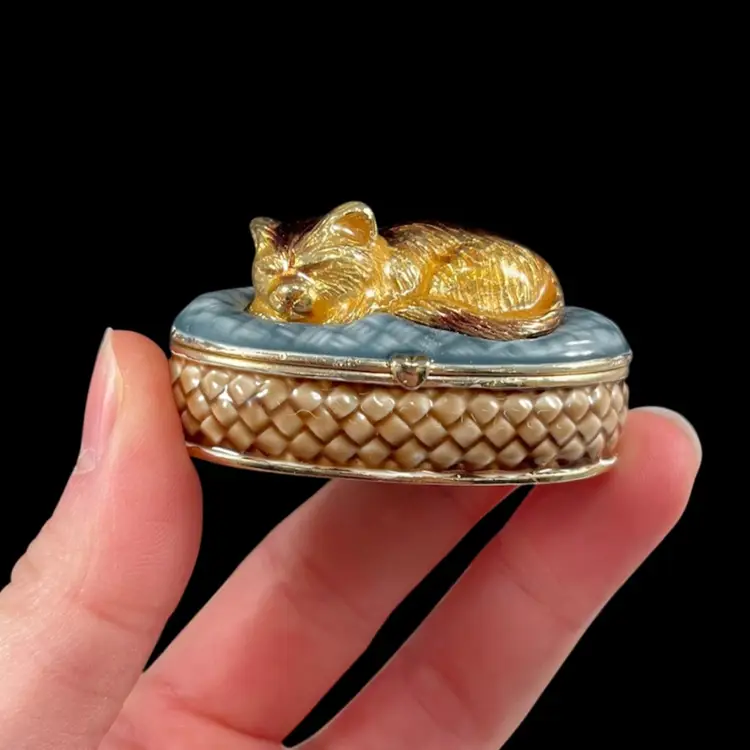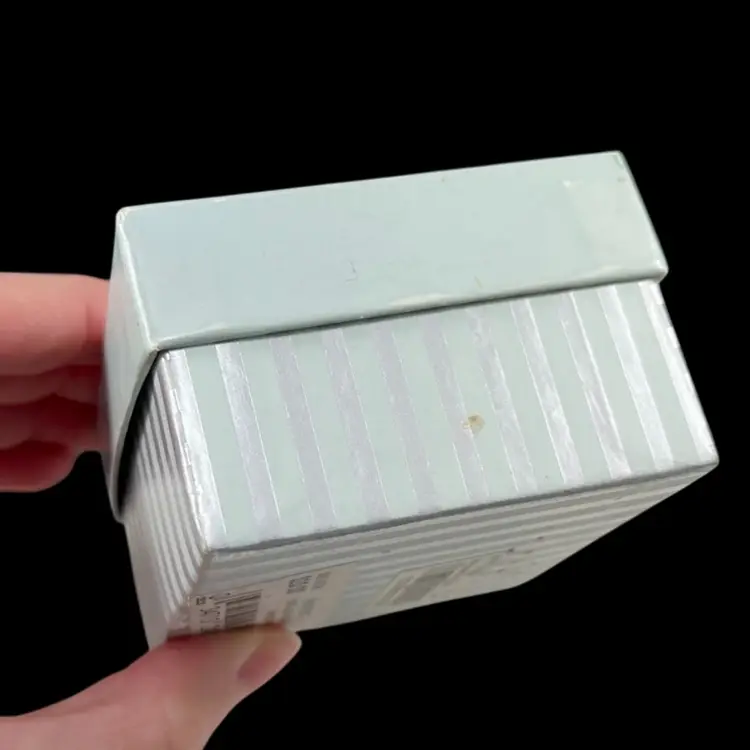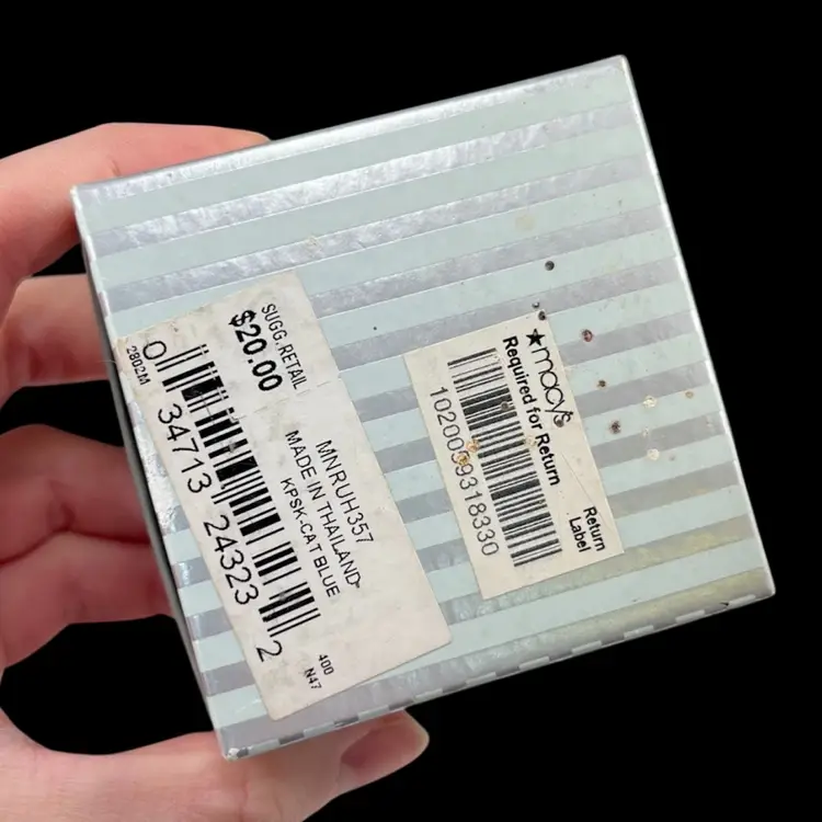 Trinket box is approximately 2” x 1.25” x 1”. Box itself is approximately 3” square and 1.75” deep. Hinge is slightly loose, but appears to be made that way. The top magnet has some light flaking to the coating. The box has original vintage tags and wear.