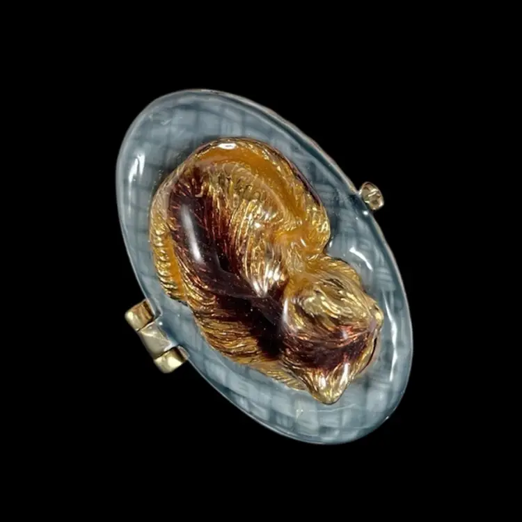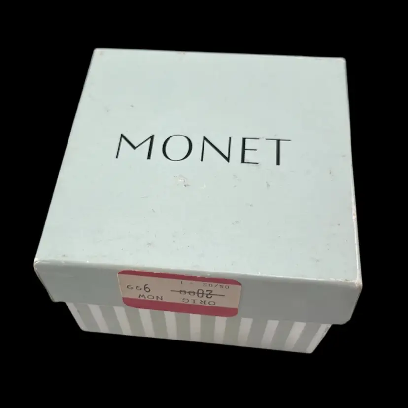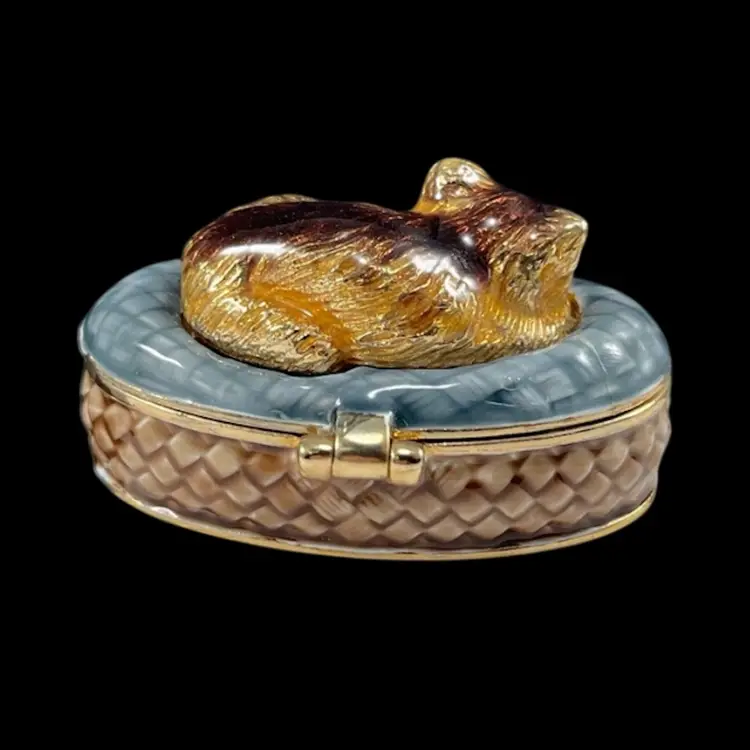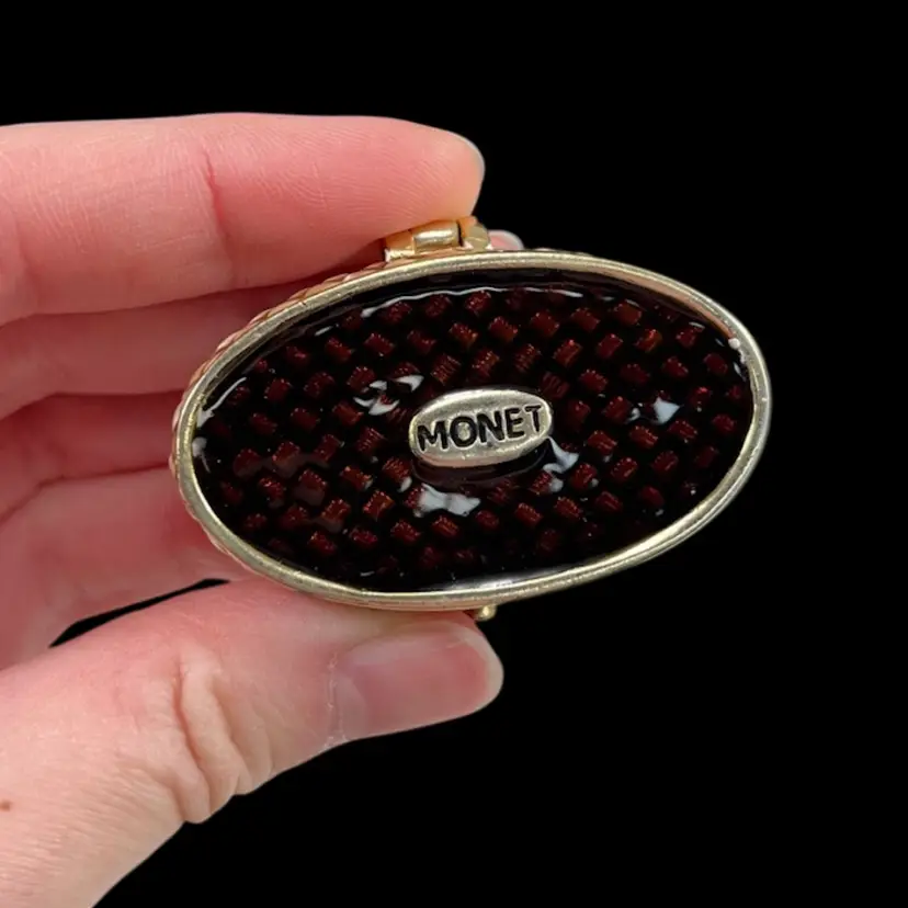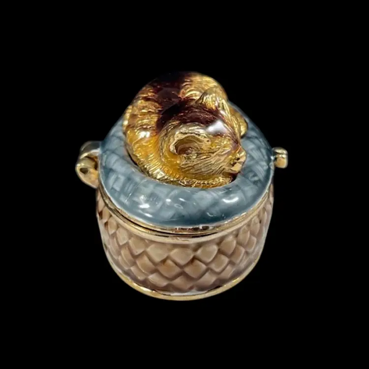 Trinket box is approximately 2” x 1.25” x 1”. Box itself is approximately 3” square and 1.75” deep. Hinge is slightly loose, but appears to be made that way. The top magnet has some light flaking to the coating. The box has original vintage tags and wear.