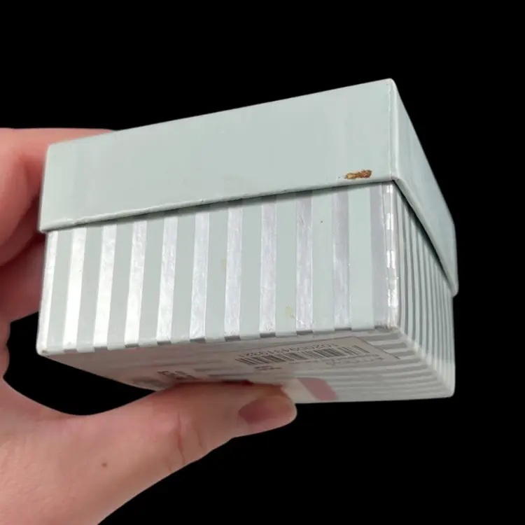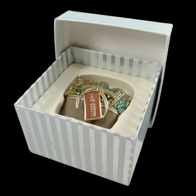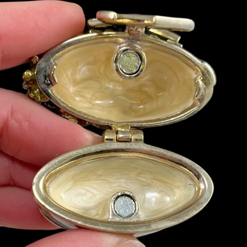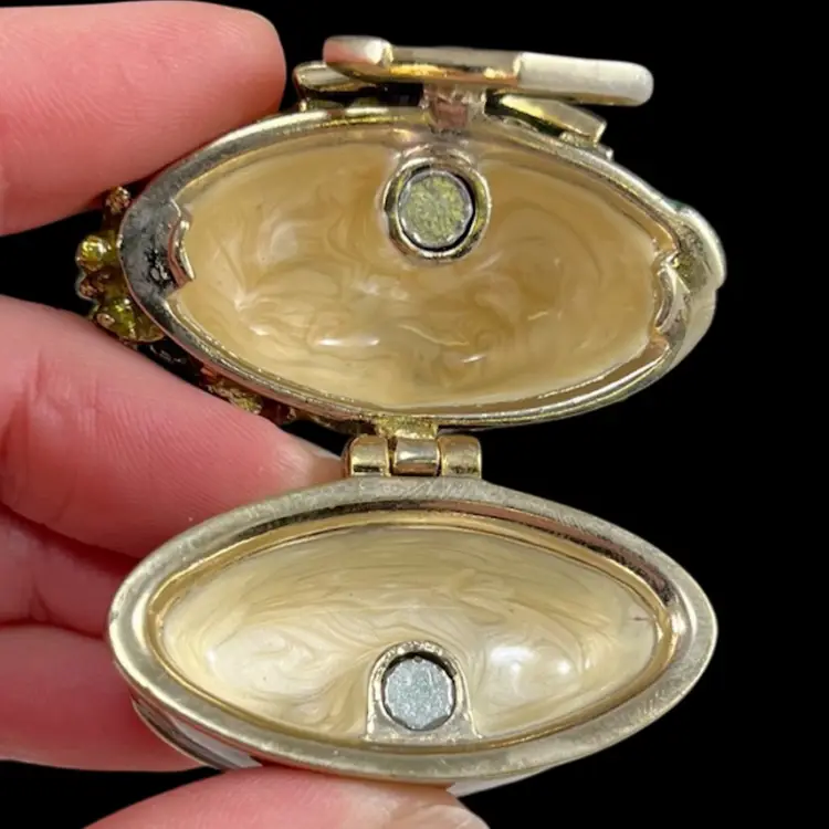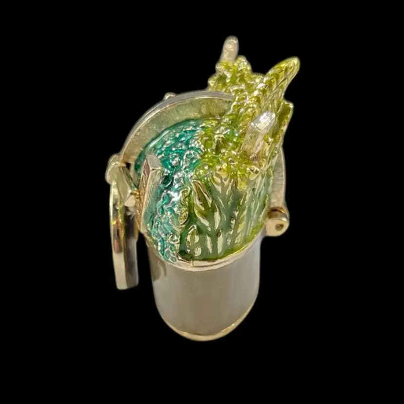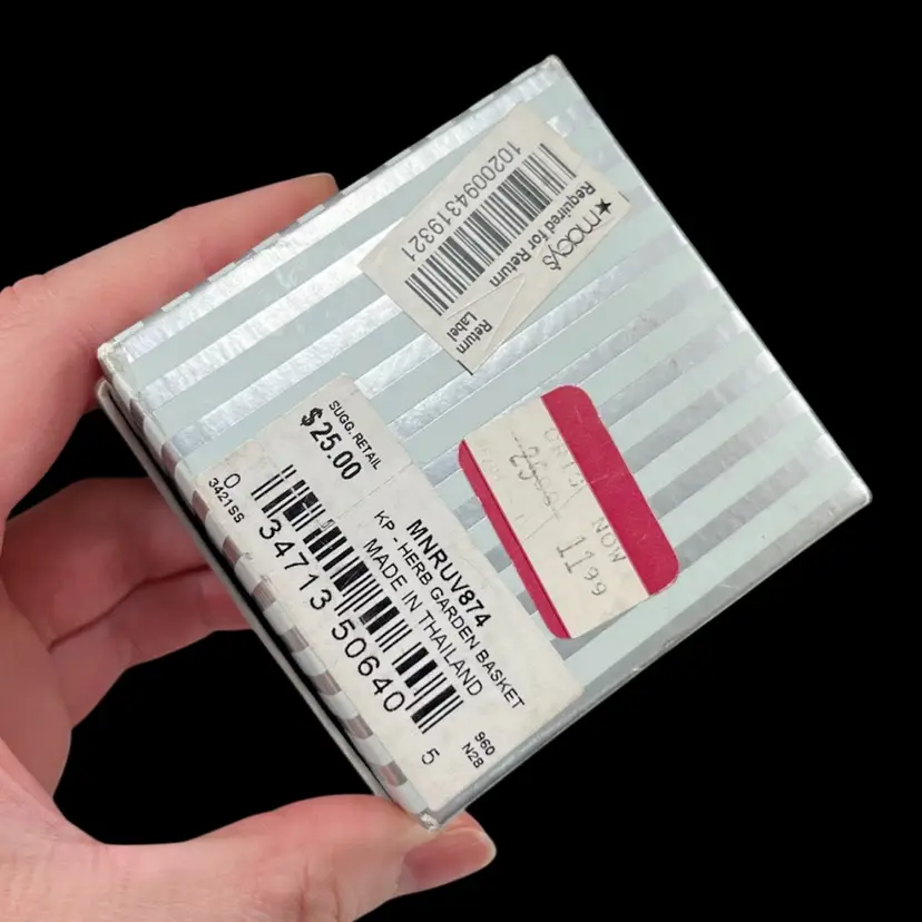 Herb garden is approximately 1.75” x 1” x 1.75”. Box is approximately 3” square and 1.75” deep. Good vintage condition. Some slight flaking to edges of magnet clasp. Hinge is slightly loose, but appears to be made that way. Box had original vintage tags and has wear.