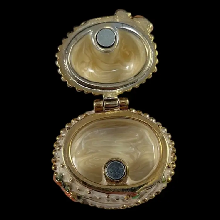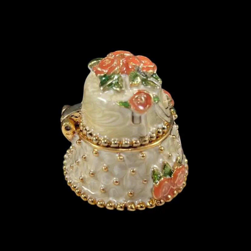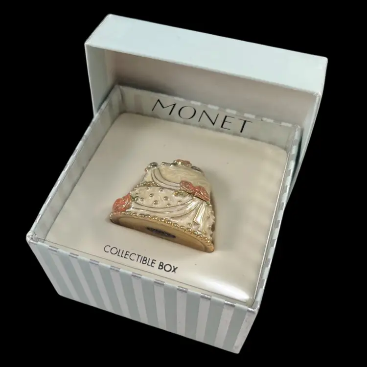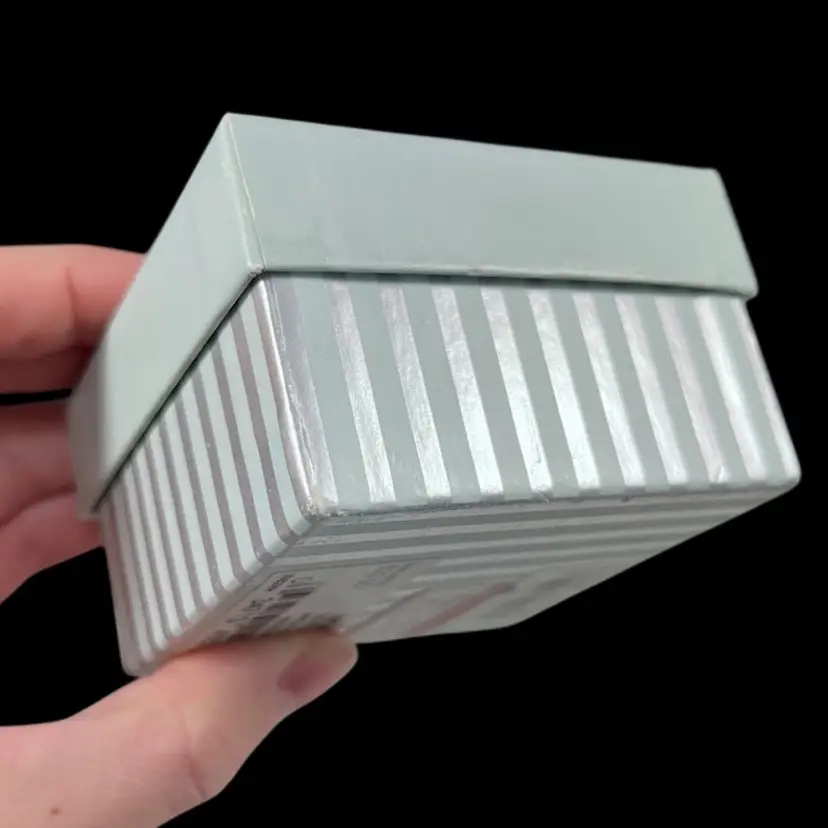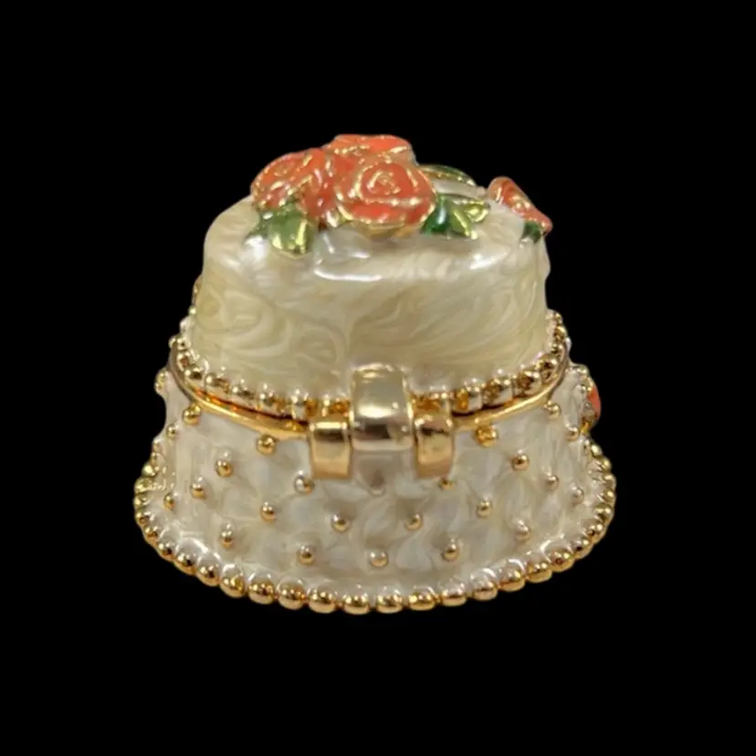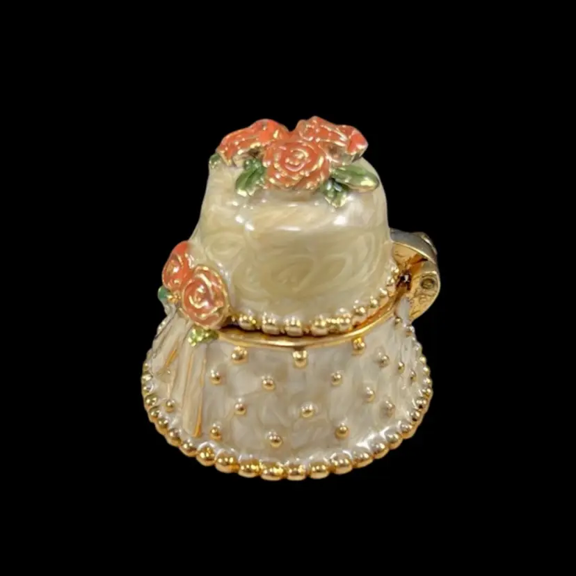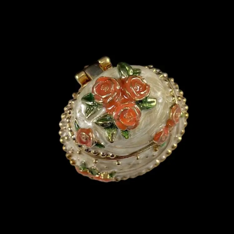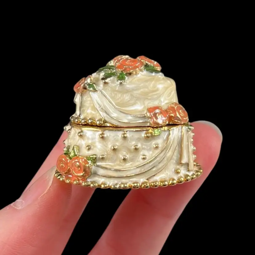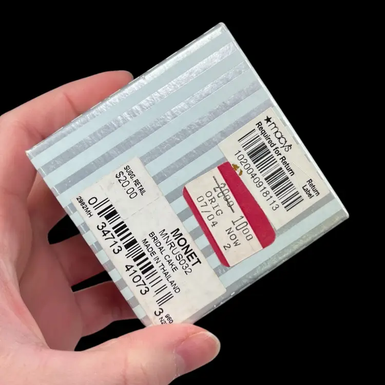 Cake is approximately 1.5” x 1.25” x 1.25”. Box is approximately 3” square and 1.75” deep. Good vintage condition. Hinge is slightly loose, but appears to be made that way. Box has original vintage tags and has wear.