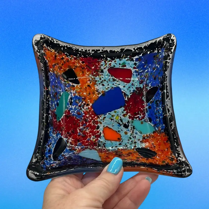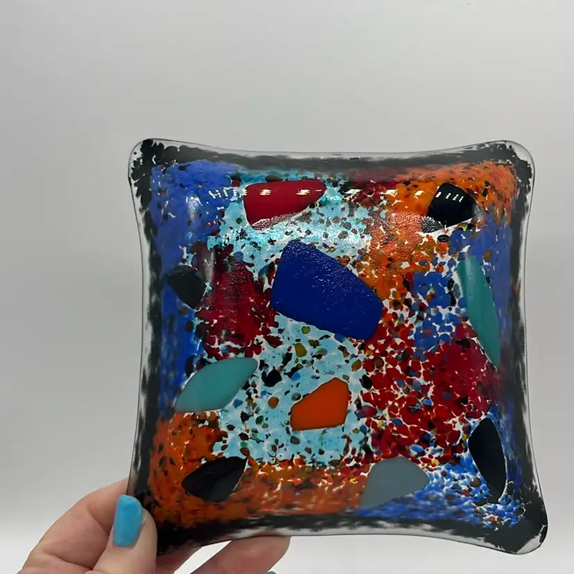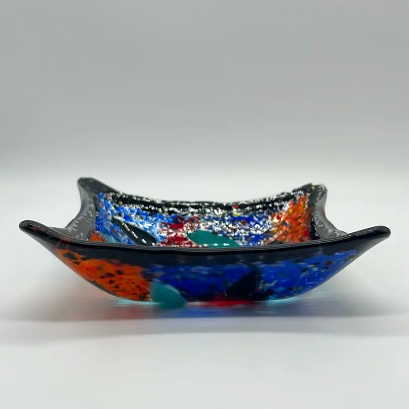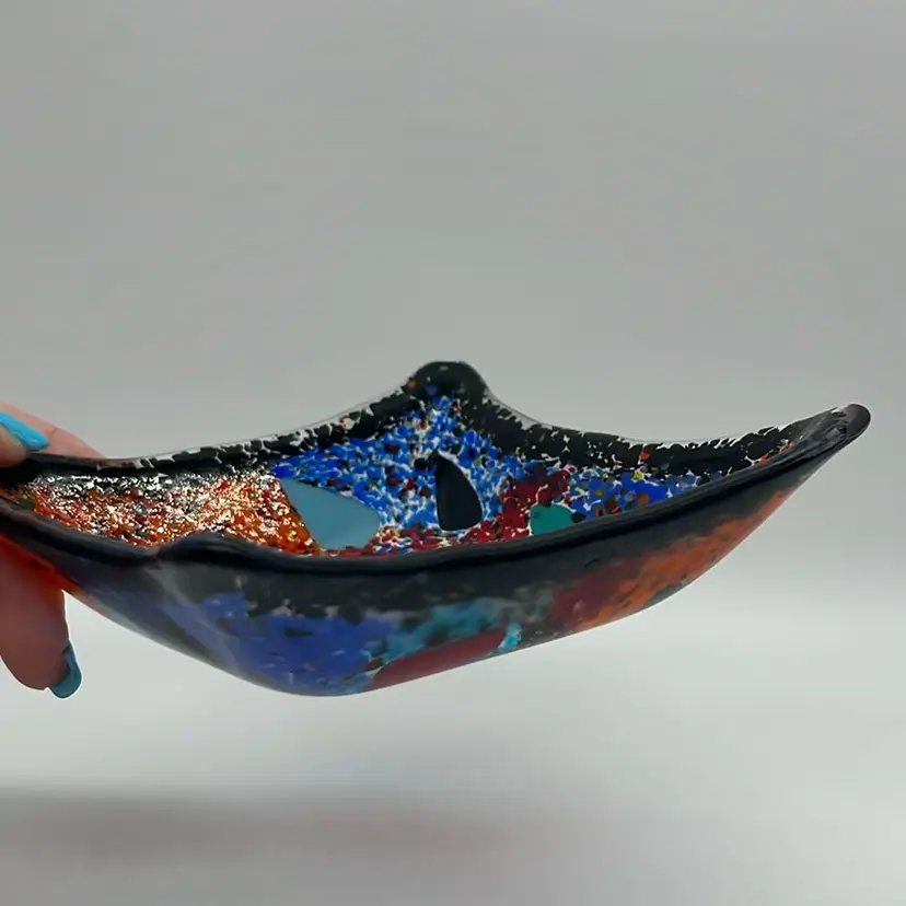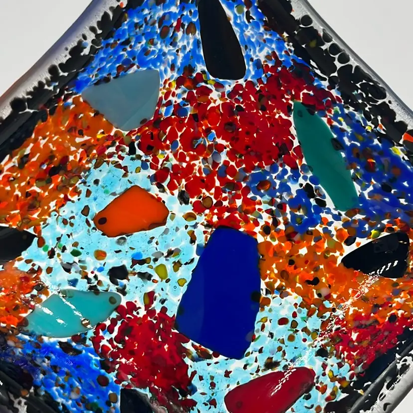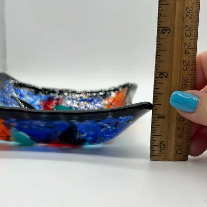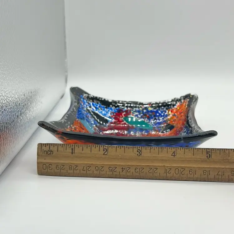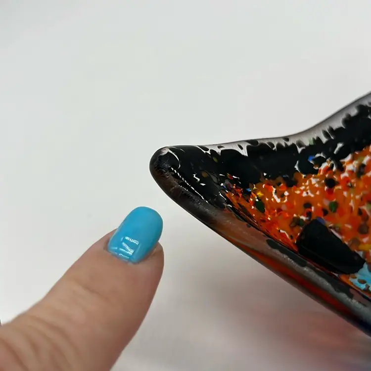 This piece is bursting with vibrant colors and very well done! Some textured areas and smooth which brings a unique design to the dish. Very small rough spot (see pic) No chips or cracks.