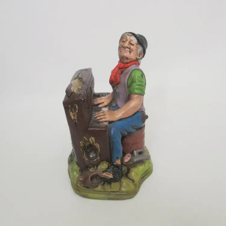 Naturecraft "Grand Finale" stoneware figure. Hobo playing a standing piano. Has tiny details, like a nest on side of piano. Painted in brighter colors than other versions. Measures about 6" tall. Made in England. No chips or cracks.