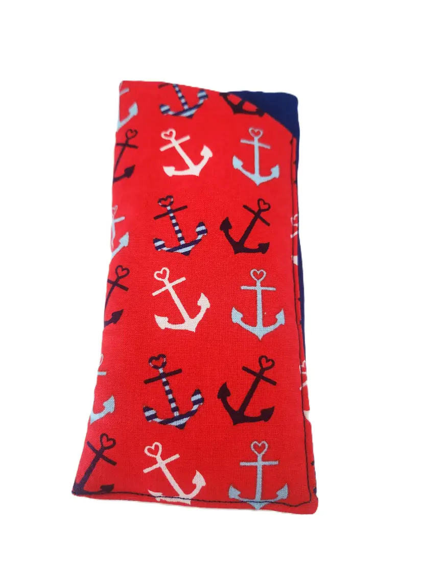This nautical case has a red background with anchors all over it. It is lined with coordinating blue fabric. The case is padded for extra protection for your eyewear. It measures 7 1/4 inches from top to bottom and almost 3 1/2 inches from side to side. It is well made and so cute.