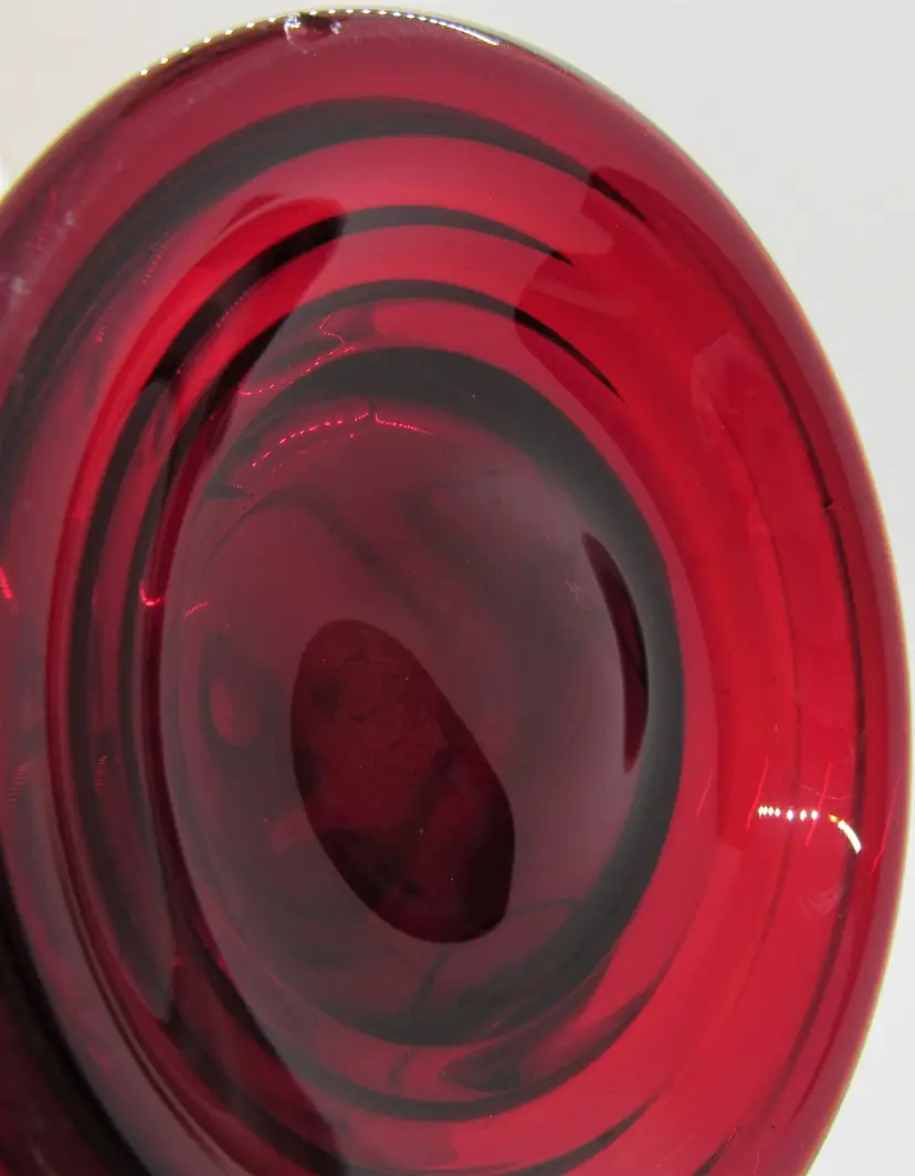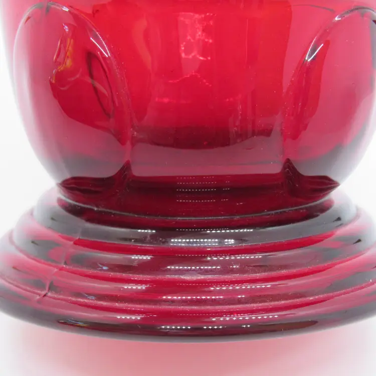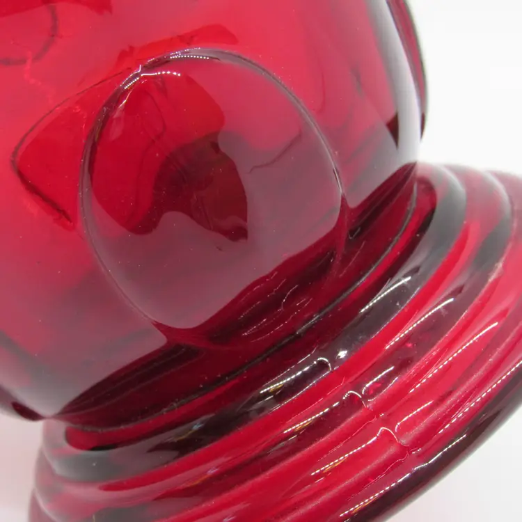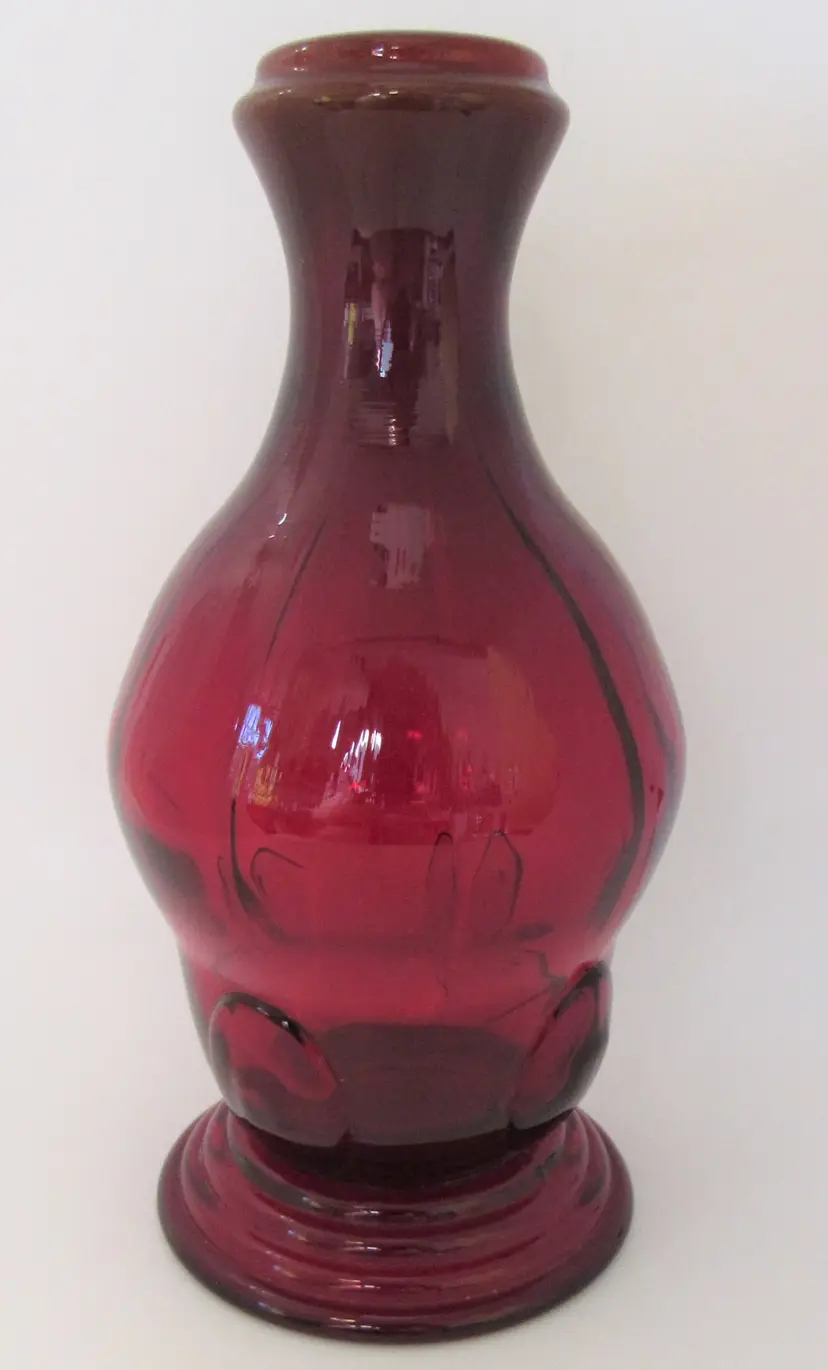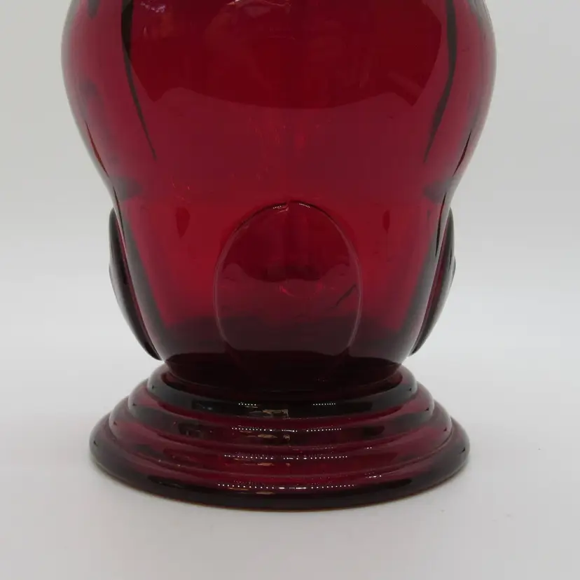 1932-1940 "Ruby Red Moondrops" decanter (without stopper) by New Martinsville Glass. Glass contains cadmium which fluoresces when under black light. Works well as a floral bud vase. Small chip on the edge of the foot (see photos). No other defects. Measures 7 1/8" tall x 3 1/2" wide (at widest point)