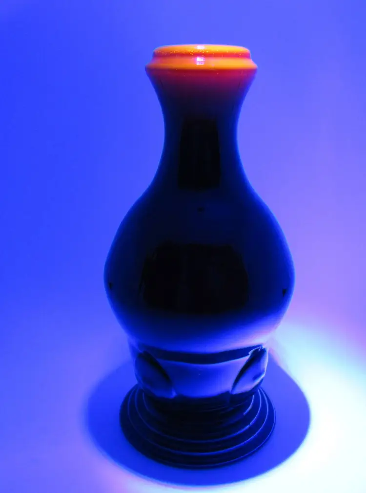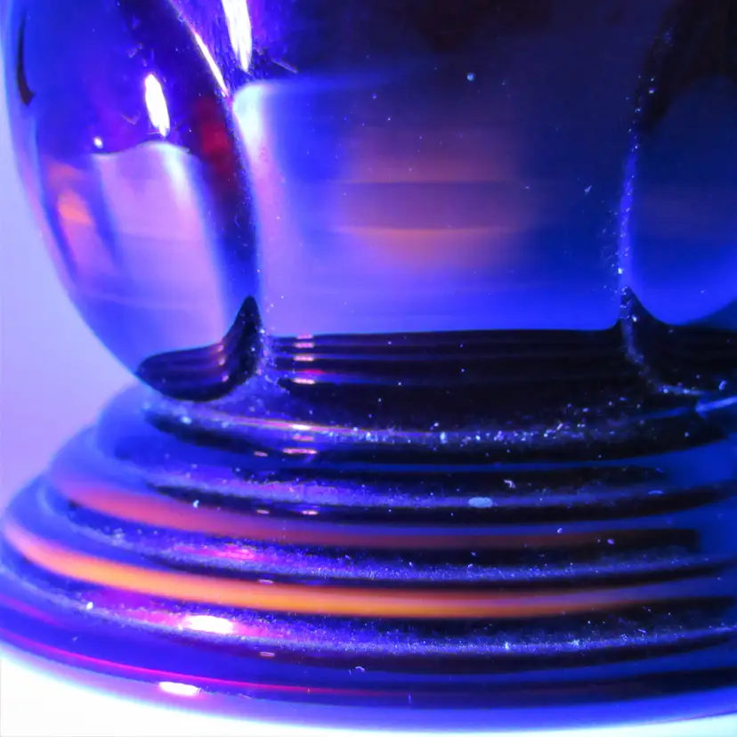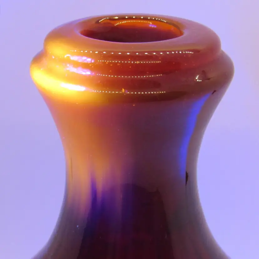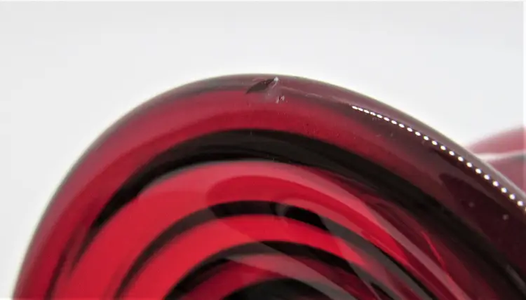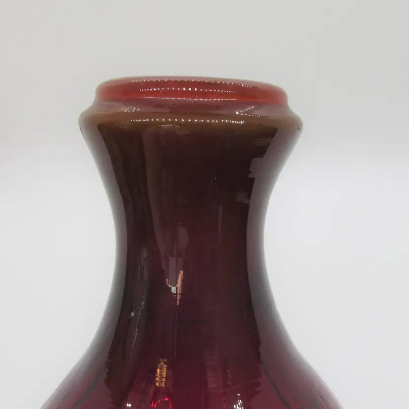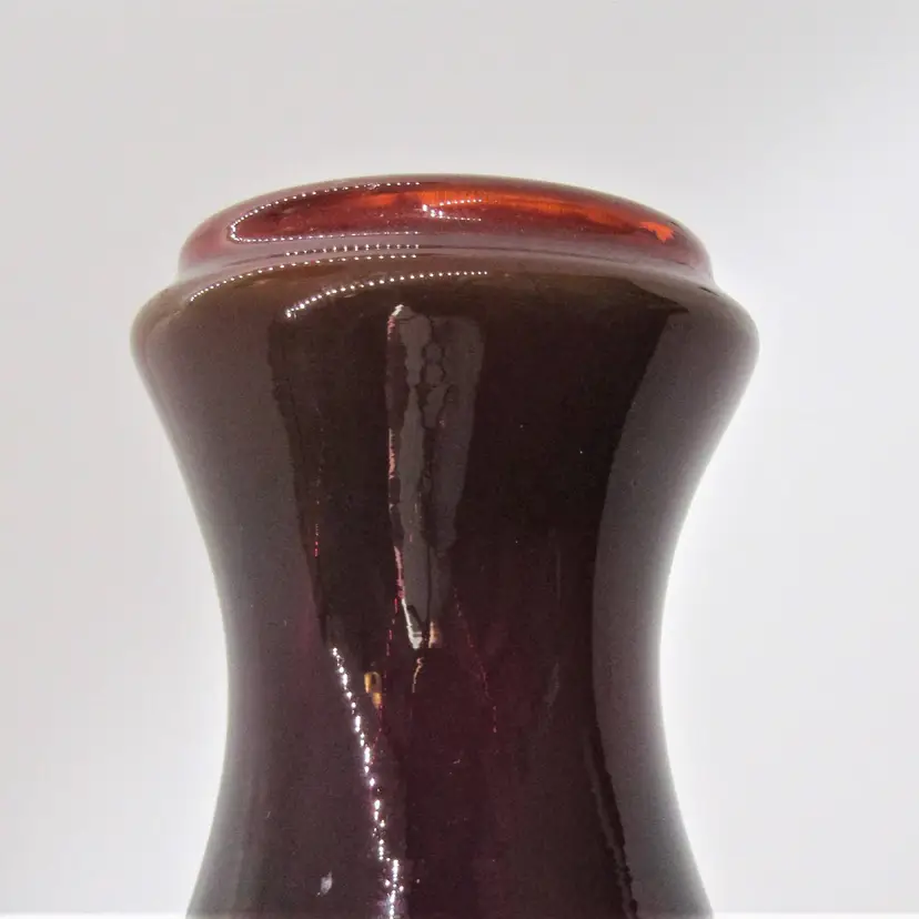1932-1940 "Ruby Red Moondrops" decanter (without stopper) by New Martinsville Glass. Glass contains cadmium which fluoresces when under black light. Works well as a floral bud vase. Small chip on the edge of the foot (see photos). No other defects. Measures 7 1/8" tall x 3 1/2" wide (at widest point)