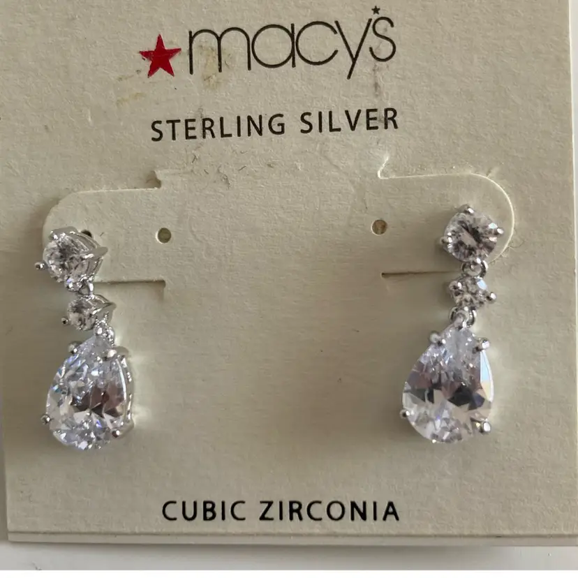 Macy’s new old stock sterling silver cubic zirconia teardrop earrings. Post backs. Drop is 3/4”.