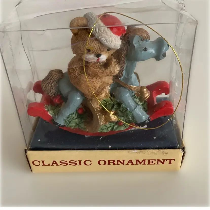 1990’s teddy bear riding a rocking horse. Tge irnamt is still dealed in its box so not sure what it is made from. It measures about 1” x 2 1/2” x 2” tall.