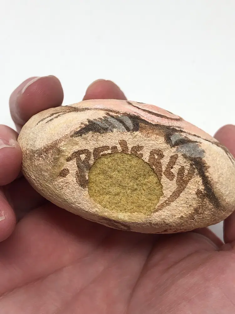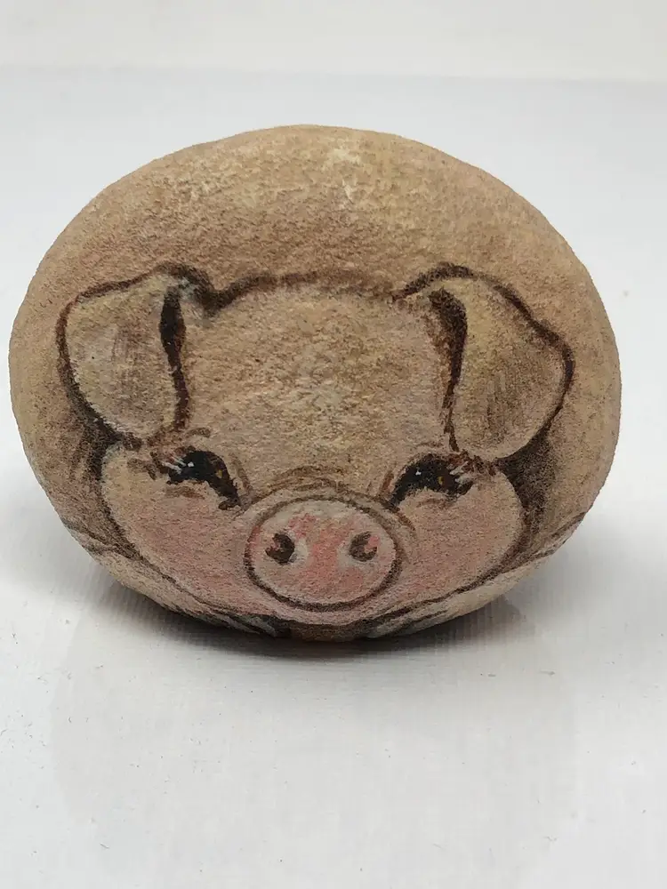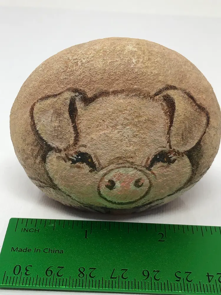 3" pig hand painted rock artist signed Beverly. Paint chip on the bottom as shown in photos.