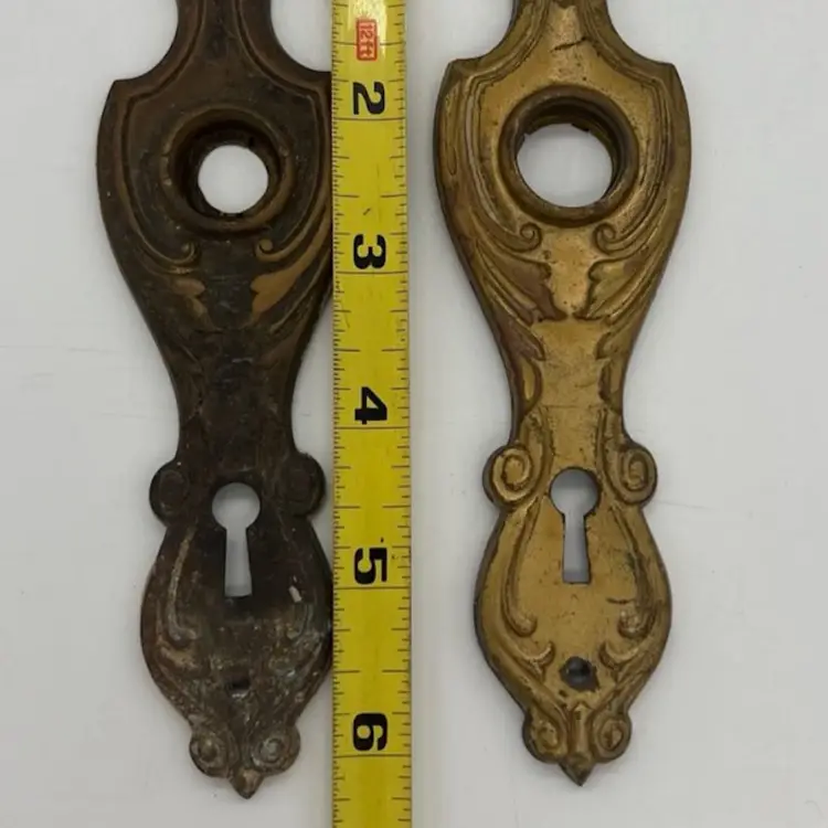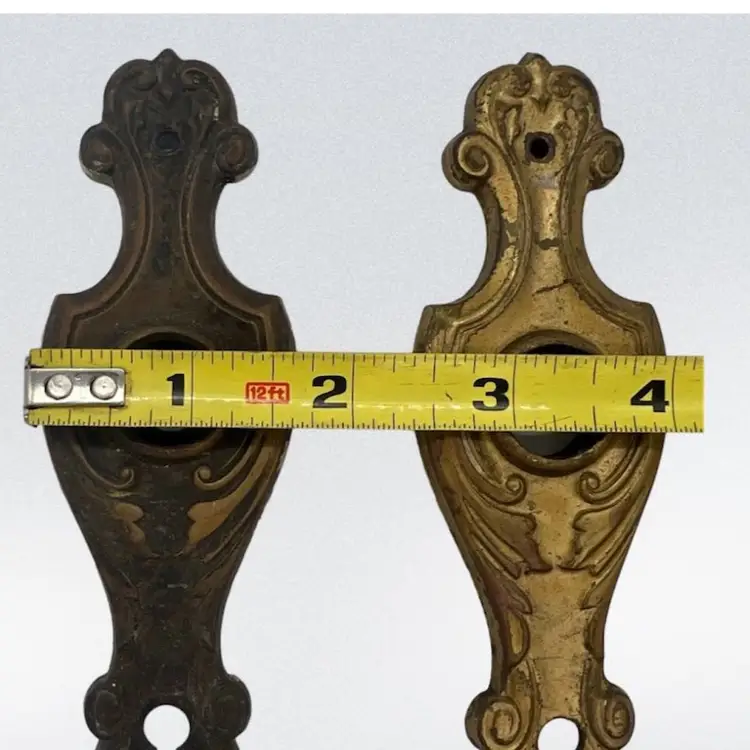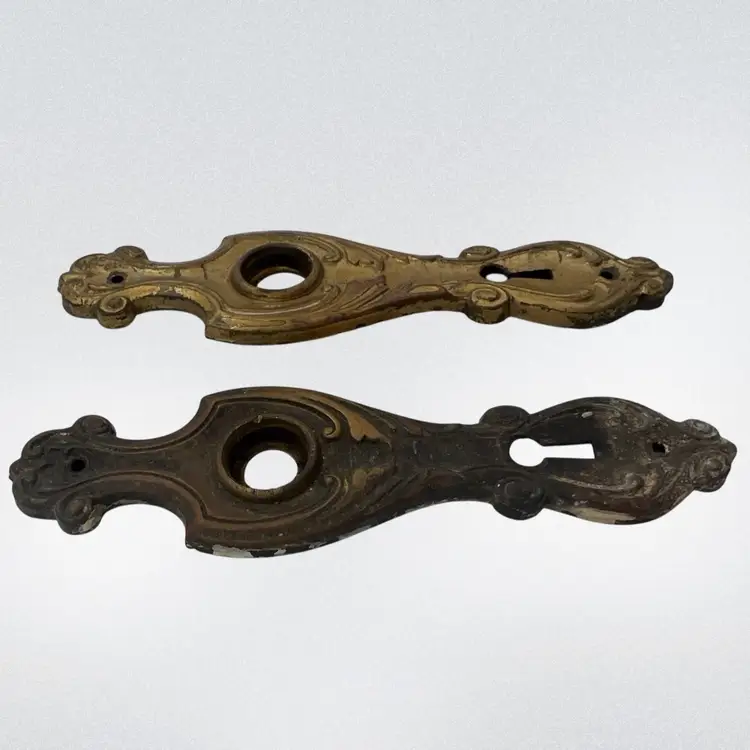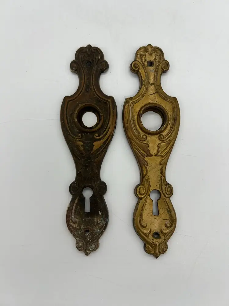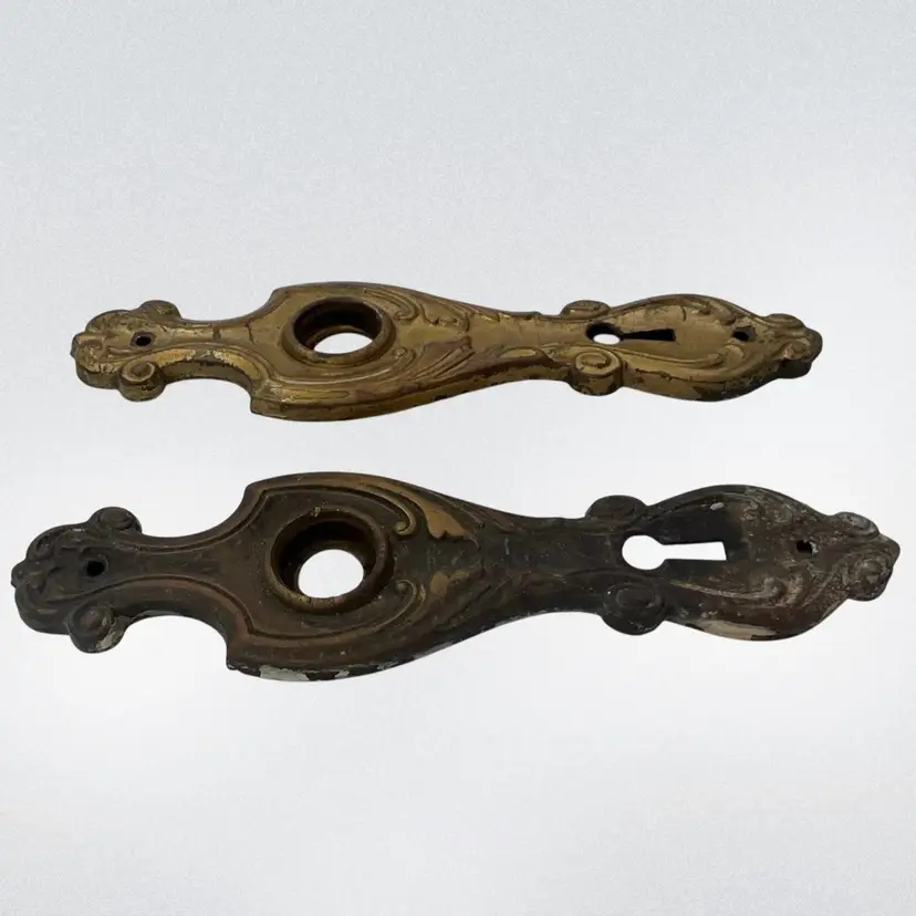 This pair of art nouveau door plates is gorgeous! I love that the one that was on the outside is weathered and has a gorgeous natural patina compared to the indoor one that still has most of its gold paint. I did not clean or attempt to restore at all for this reason. They are about 6” tall and about 1 3/4” wide.