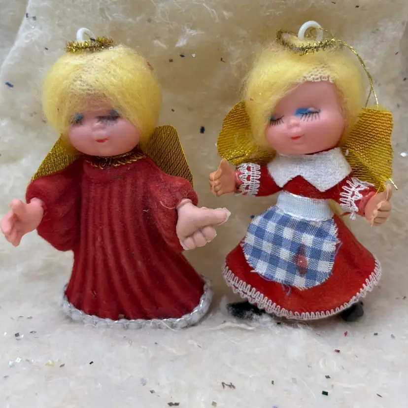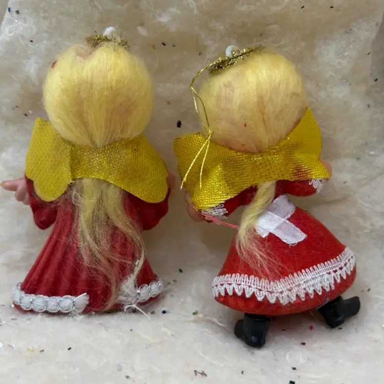Pair Of Vintage Christmas Derpy Angel Flocked Ornaments