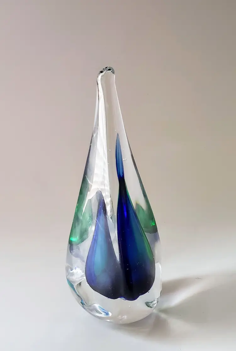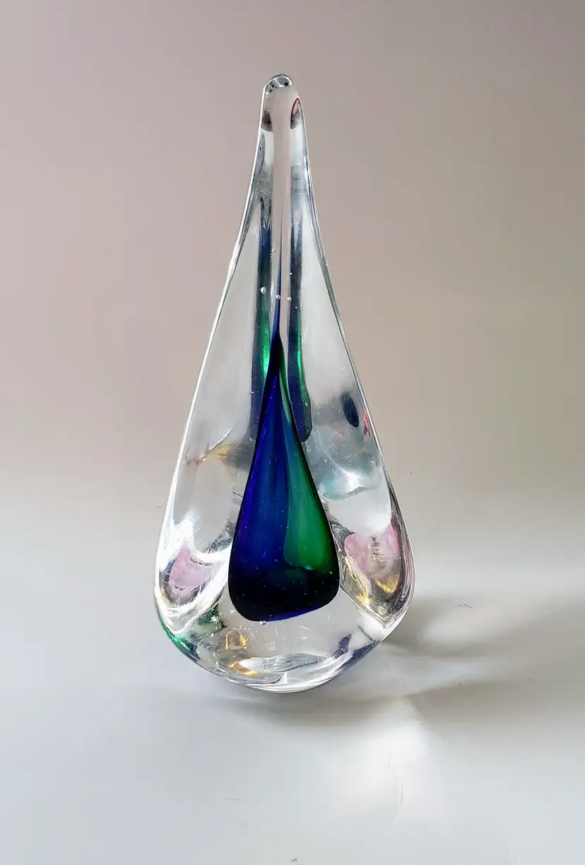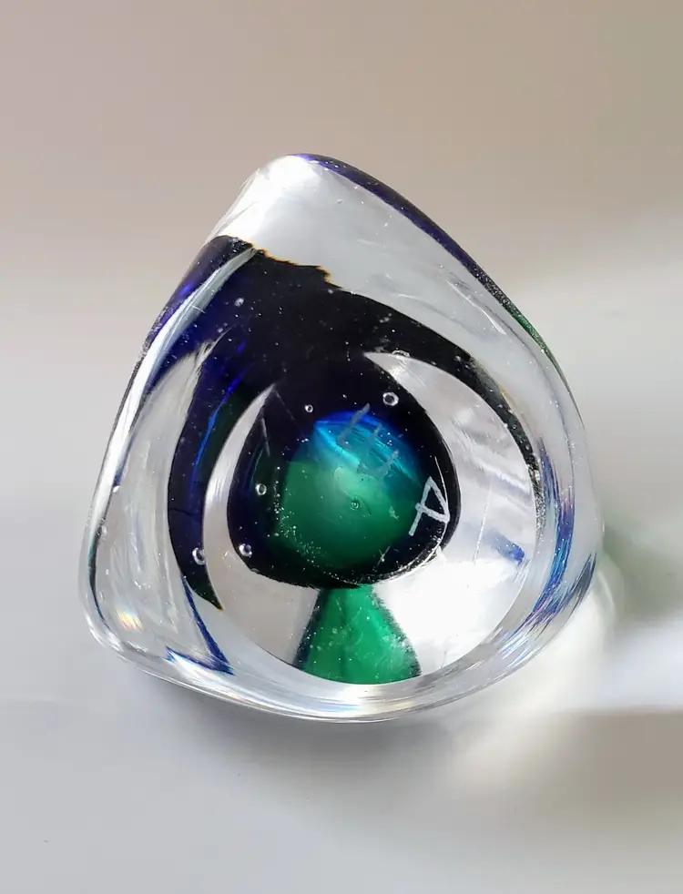 Beautiful Marian Pyrcak hand-blown art glass paperweight. Great condition, no chips or cracks. There is a small inclusion in the colored part of the glass that can be seen in the 4th picture. The "M" in Marian's signature is also inverted, possibly because this was a second due to a couple of air bubbles and the inclusion? I'm only speculating on that part.