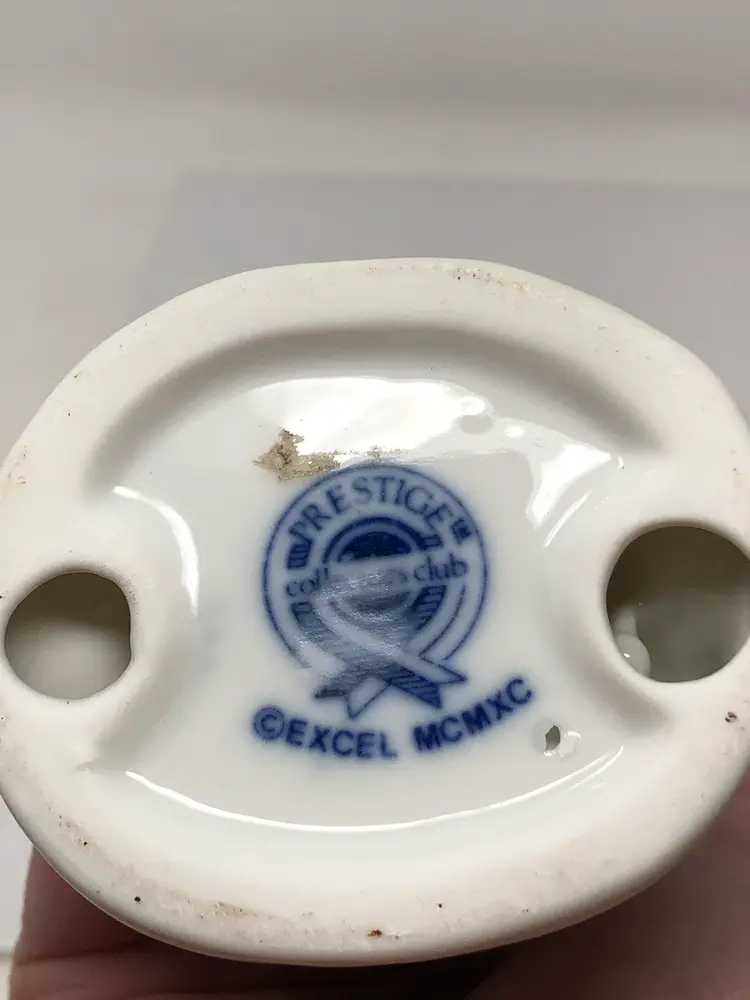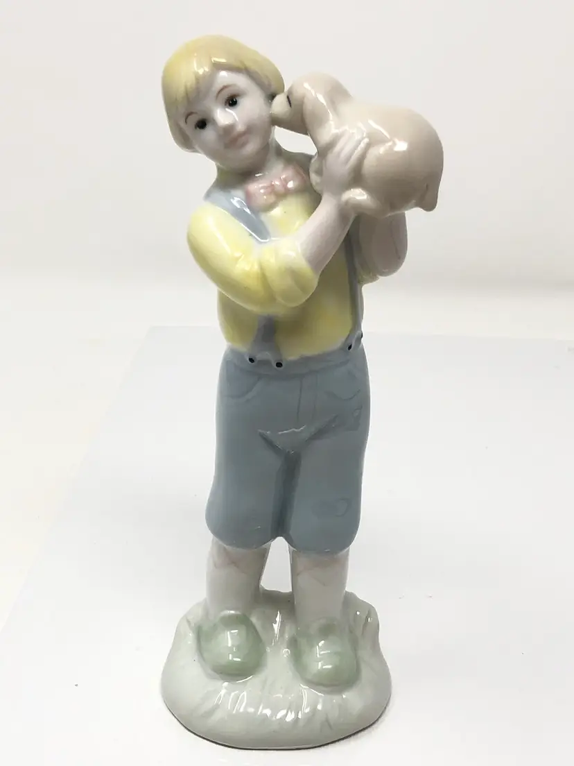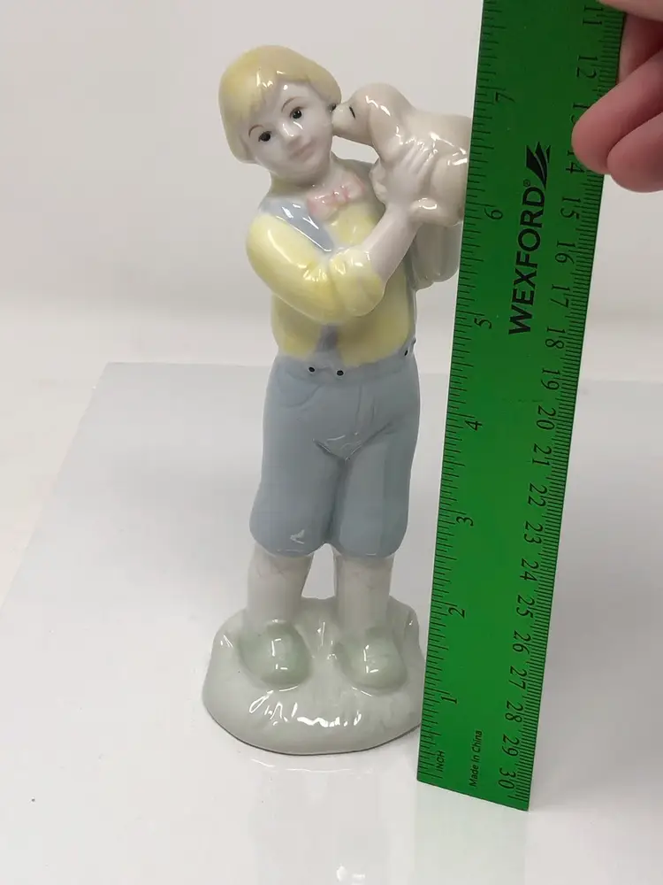 7" tall porcelain figurine of a young boy with a puppy. Marked Prestige Collectors Club Excel 1990 on the base. No chips or cracks