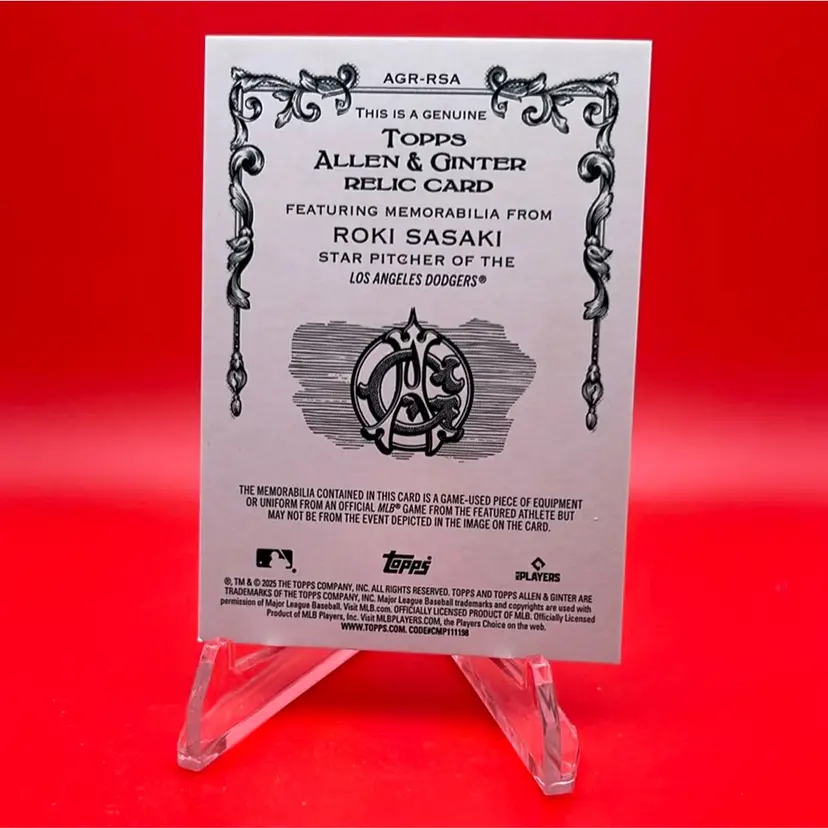 Roki Sasaki 2025 Topps Allen & Ginter RC Full Size Relic Los Angeles Dodgers