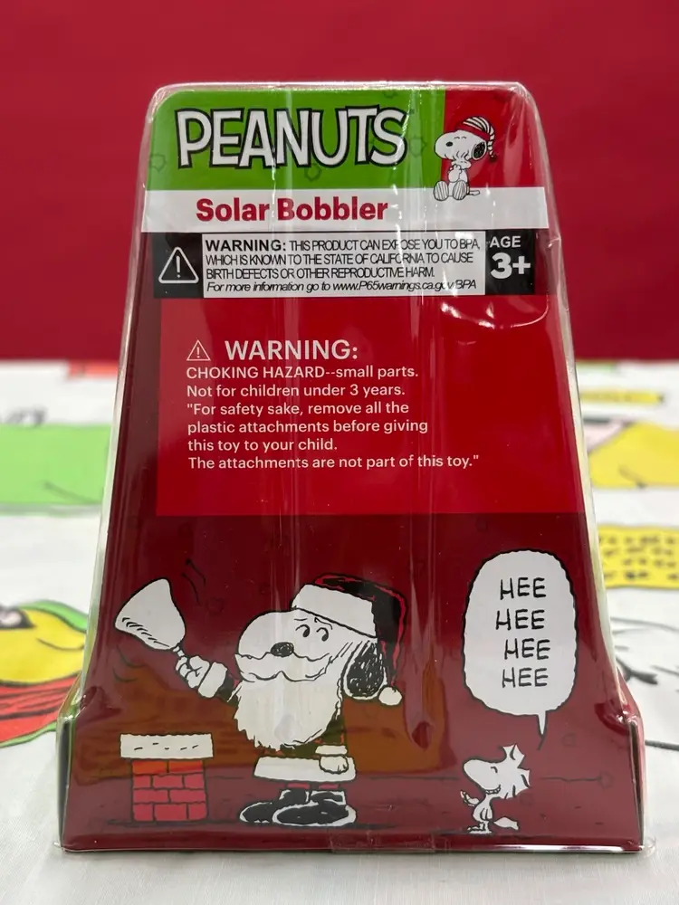 He may not come down your chimney, but this nodding solar bobbler Snoopy is all dressed up and ready for the holiday. New in package. His muzzle is blurry in the first photo because he was so excited to have his picture taken that he couldn’t stop nodding. The front corners of the plastic container are crunched a bit near Snoopy’s face, as seen in the photos. It’s not bad, just want to have full disclosure. Otherwise, he is in excellent condition.