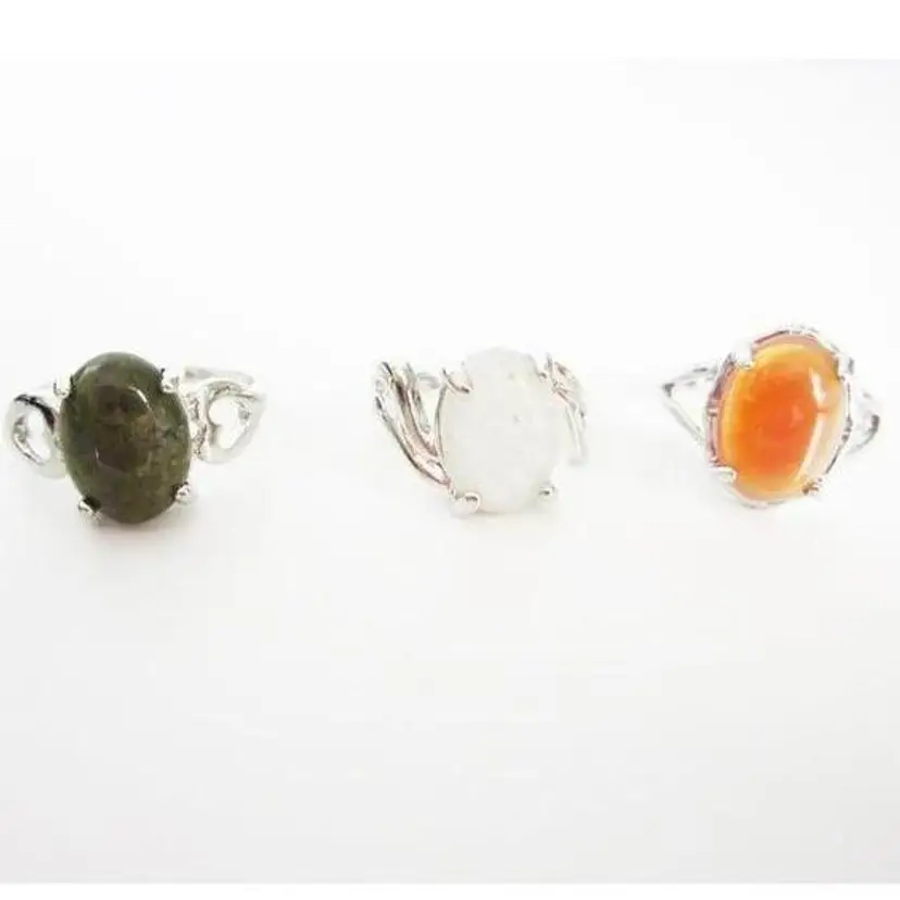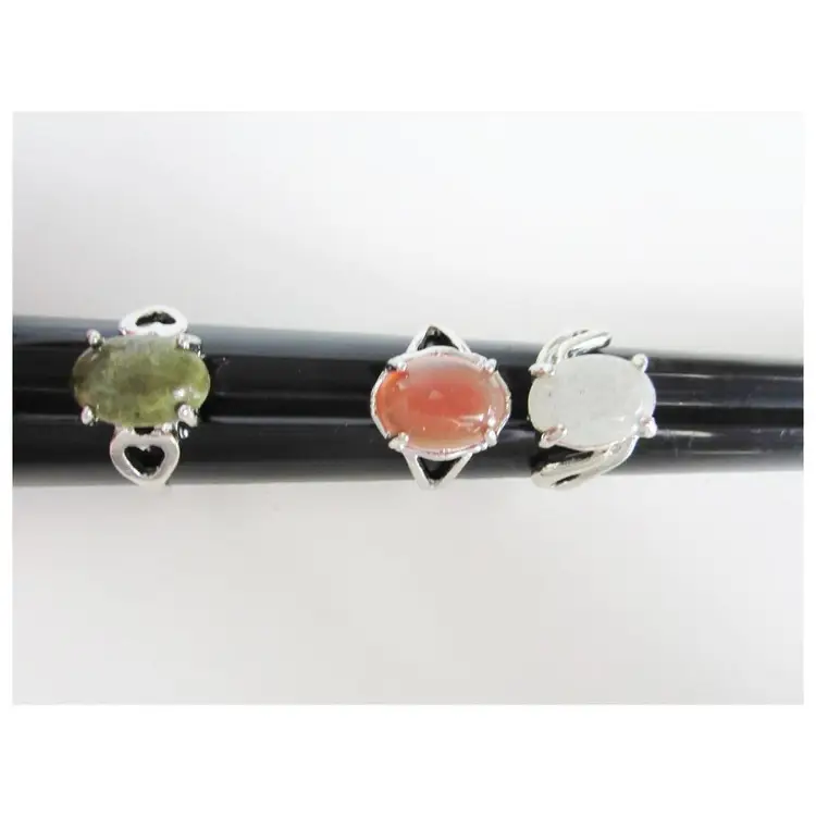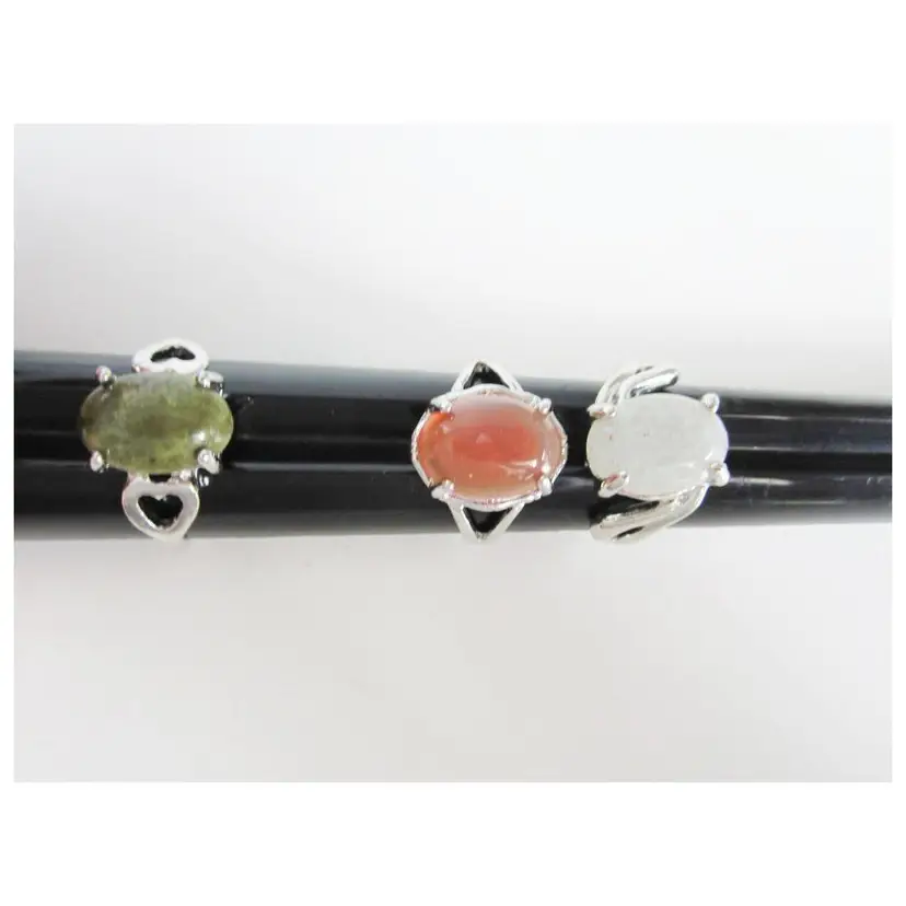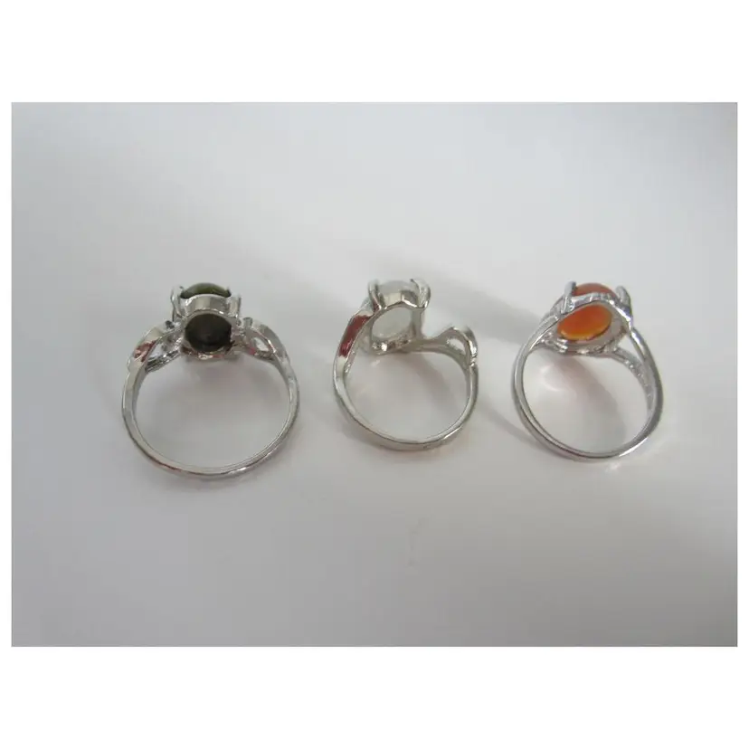Set of 3 vintage polished stone rings - There is one with Rock Crystal, Chalcedony and the third has Carnelian. Sizes are 7, 7 1/2 and 10 1/4. Metal is an alloy. I am identifying the stones by the information given to me.