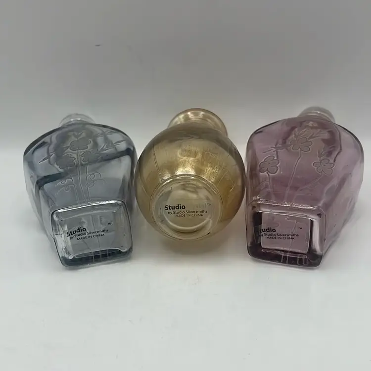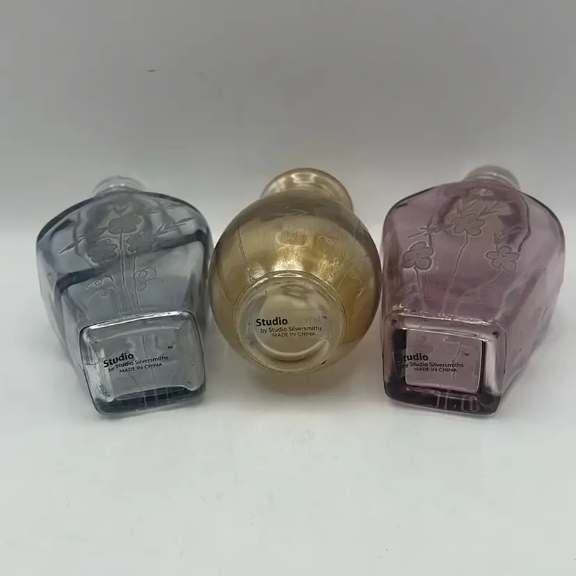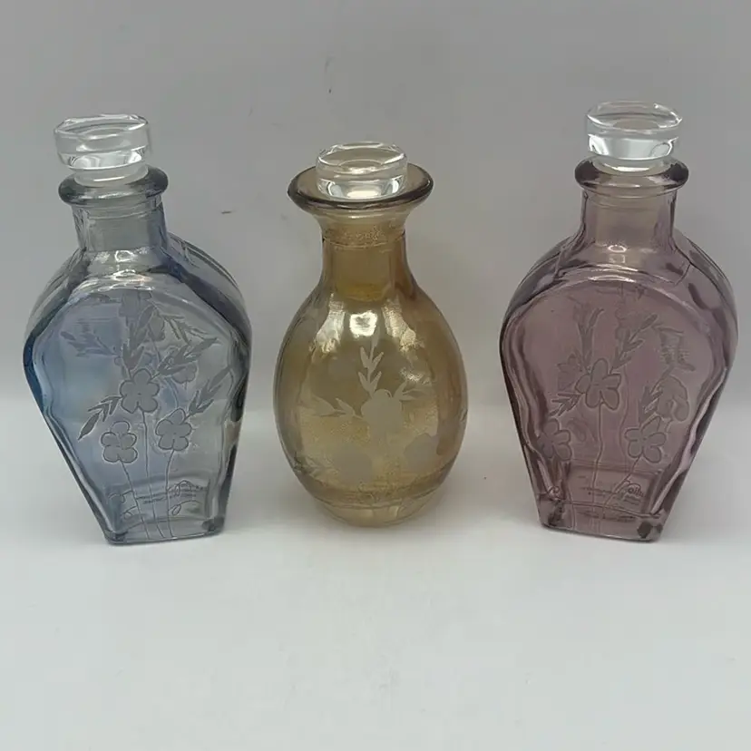 Each bottle features a delicate etched flower design in shades of purple, blue and gold. Excellent condition!