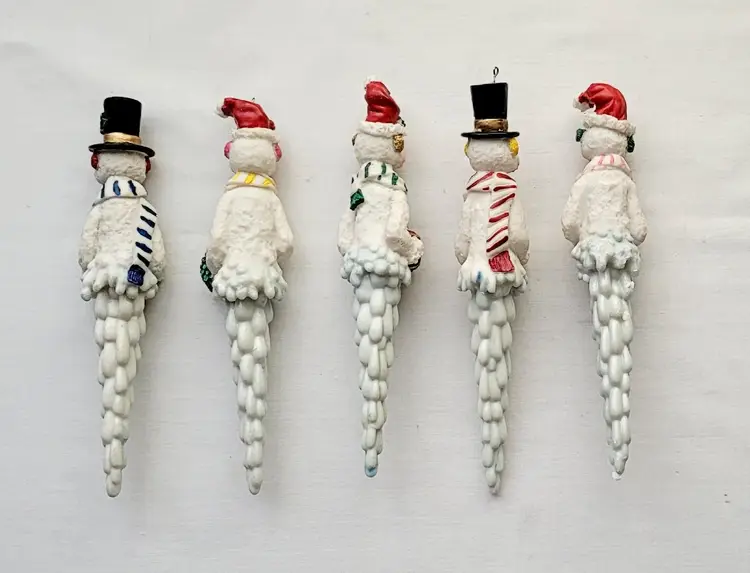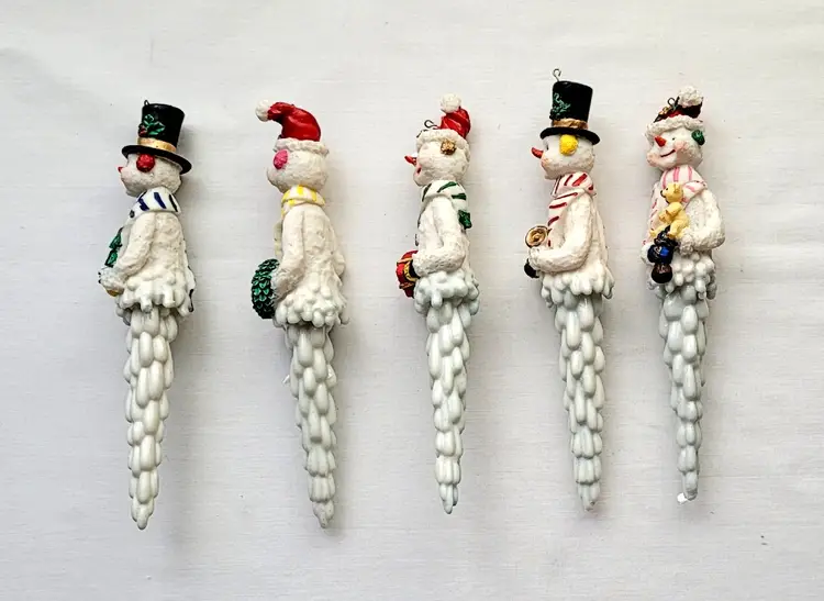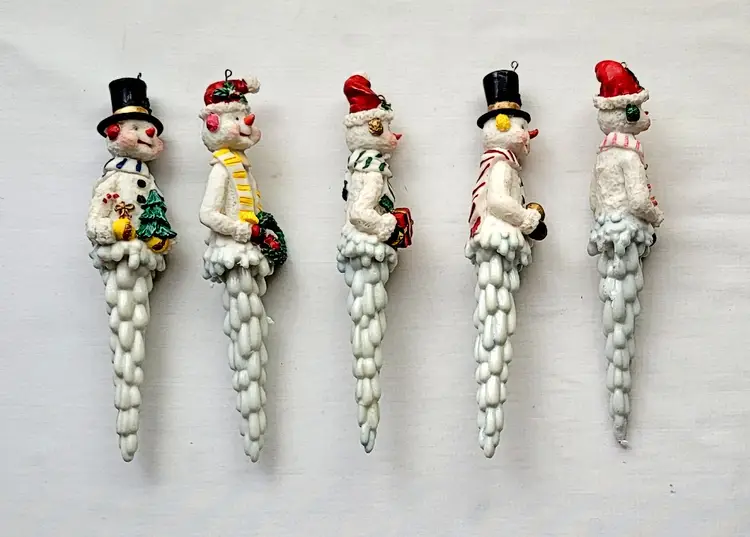 This preowned set is composed of 5 snowmen. Each has a different hat and each is holding a different item. They are each 6 1/2 in. long and about 1 1/2 in wide at widest part. They are in excellent condition.