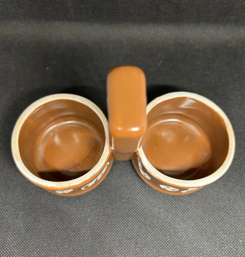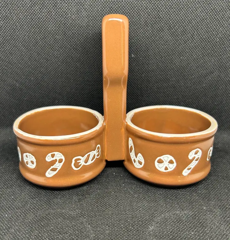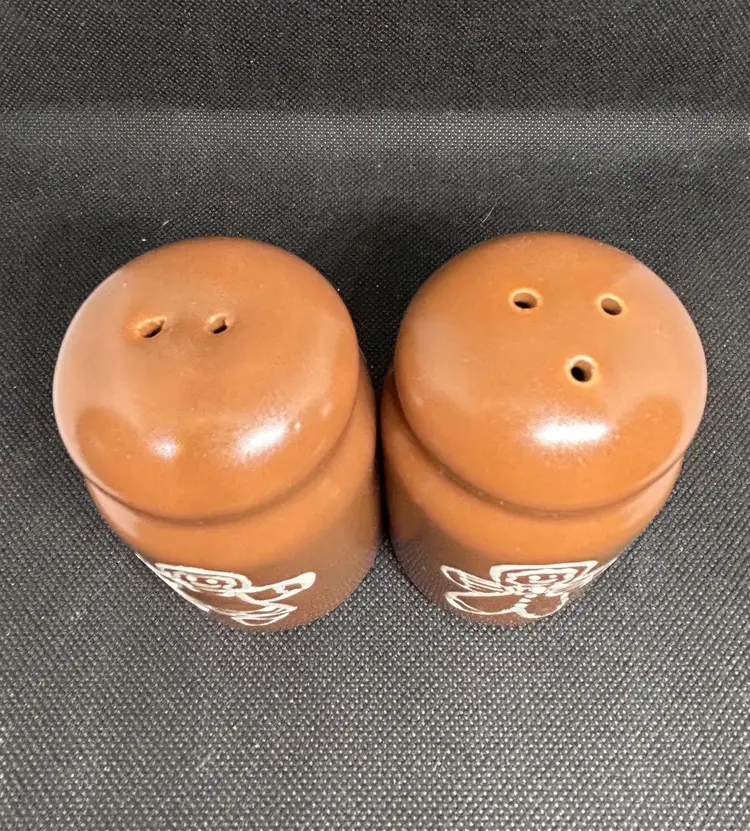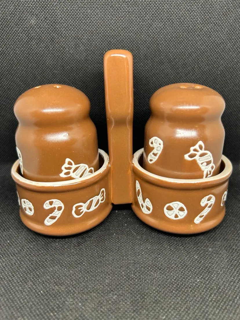 This is a brown ceramic set of salt and pepper shakers with a holder, decorated with gingerbread man and candy designs.