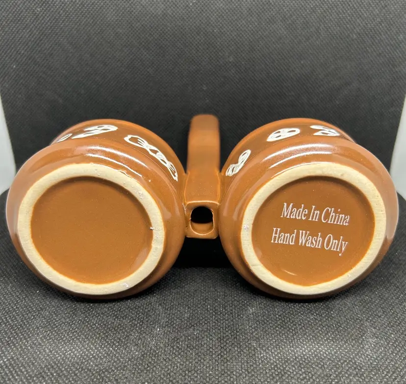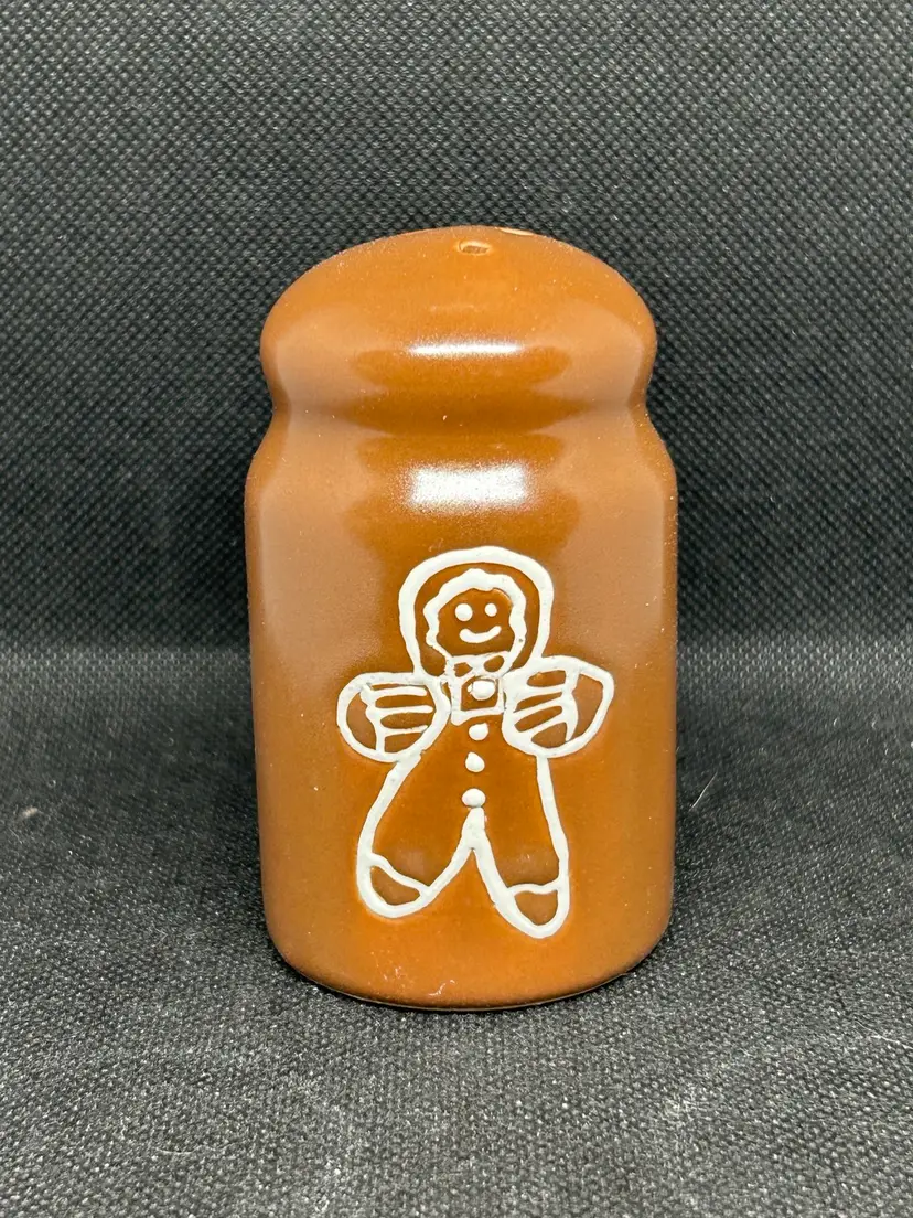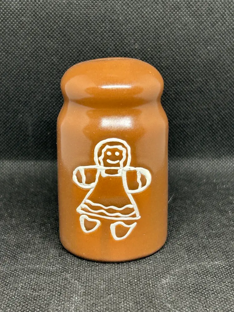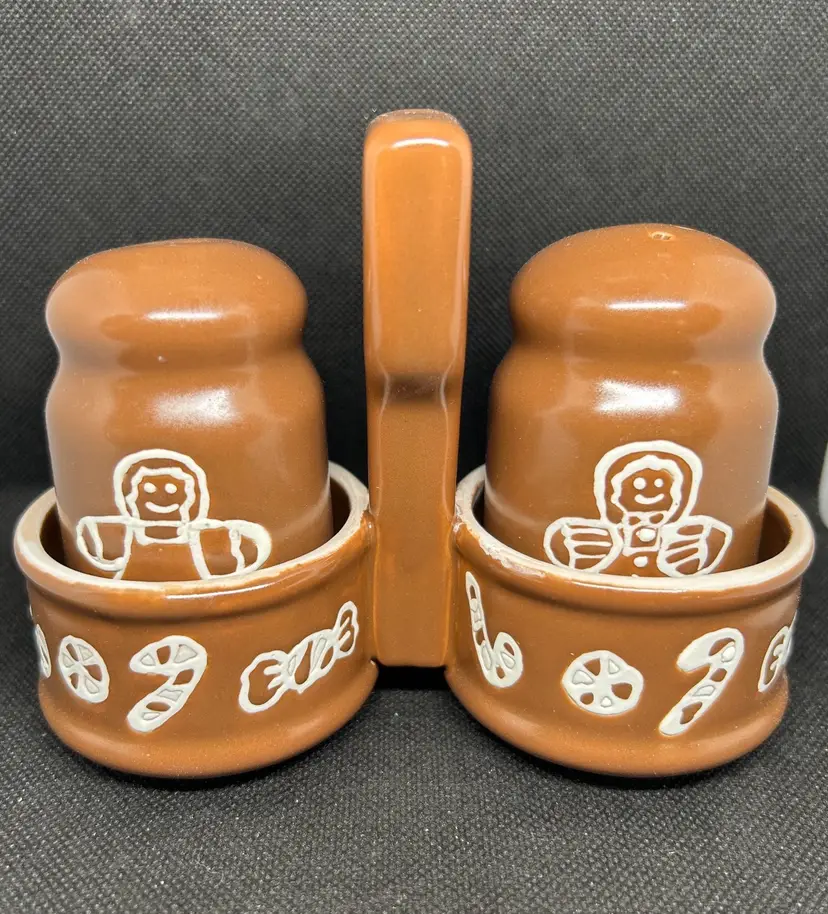 The shakers feature a brown glaze with white outlines of gingerbread figures and various candies.