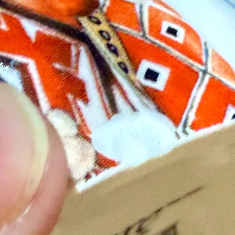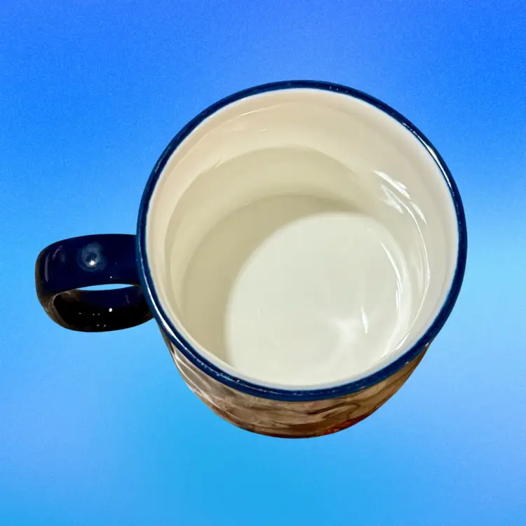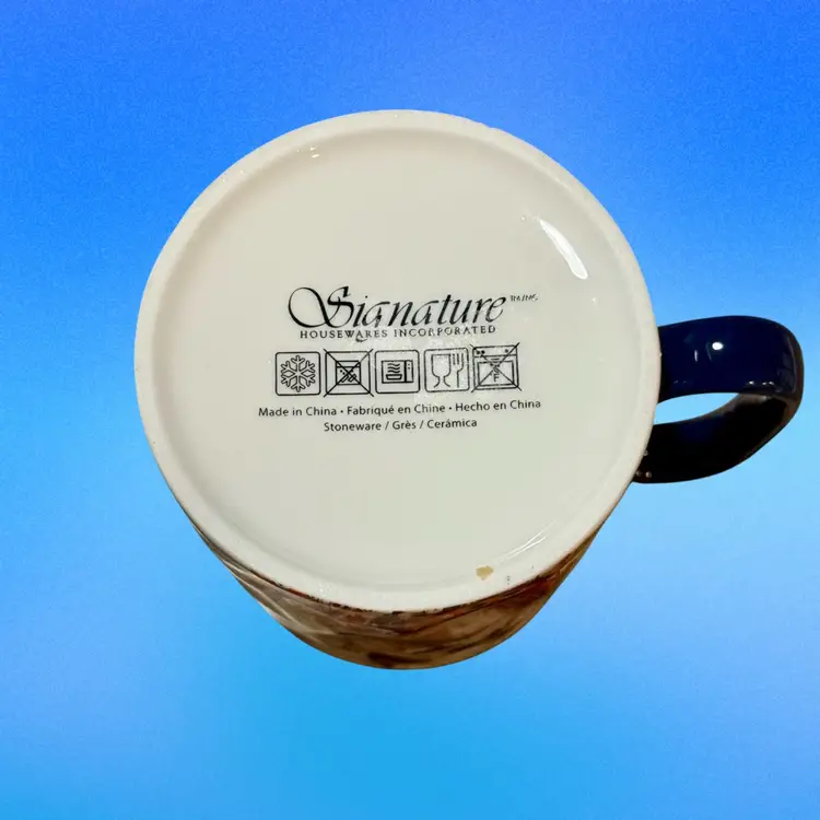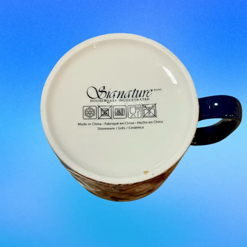 Approx 4”tall x 3.5” at mouth x 5” wide at handle; unsigned; good overall condition **other than chip at bottom edge, as seen in photo. Doesn’t affect the mug and is somewhat hard to notice (ahem, Walter, looking at you) given the overall design. Price reflects. Holds 14oz.
