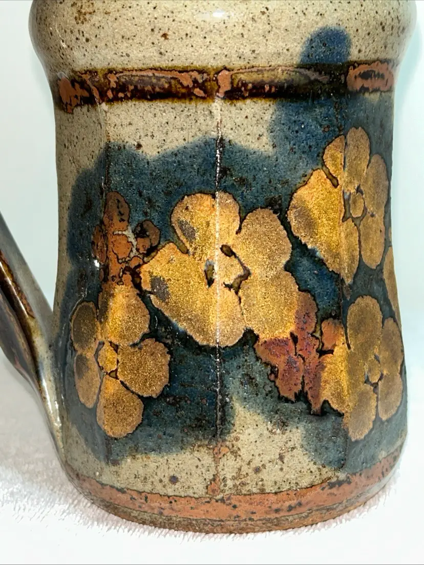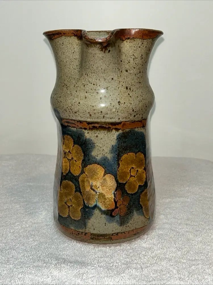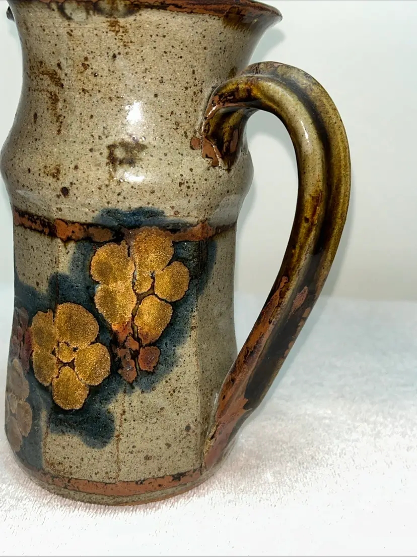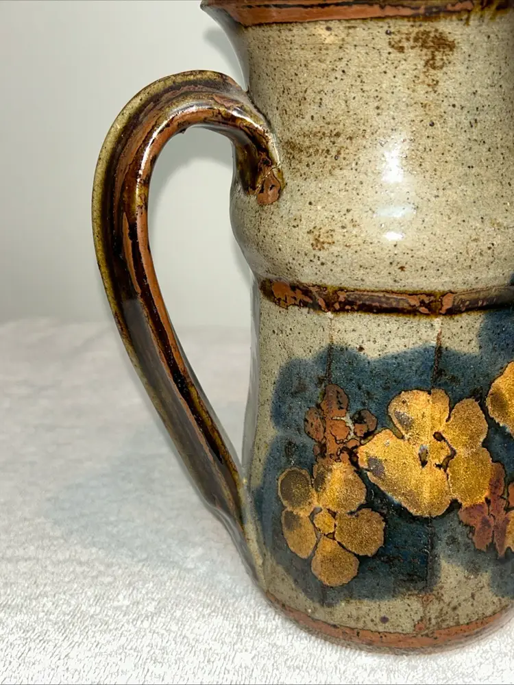 Large 7.5” high quality stoneware pottery pitcher features an abstract floral geometric pattern with a speckled glaze in earthy, autumnal tones of yellow, orange, navy, and brown. This handmade piece will certainly complement your farmhouse decor. Lovely pitcher for using as a flower vase on your kitchen table. Under the glaze crack at the handle, very secure. Signed Humphrey on the bottom; Mary Humphrey taught ceramics for many years in Michigan. 7 3/4"H x 9 1/2"W x 7 3/4"D In very good condition. Smoke/Pet free home. No repairs, cracks or chips. **I have many other listings including unique Artisan Pottery, mugs, etc.