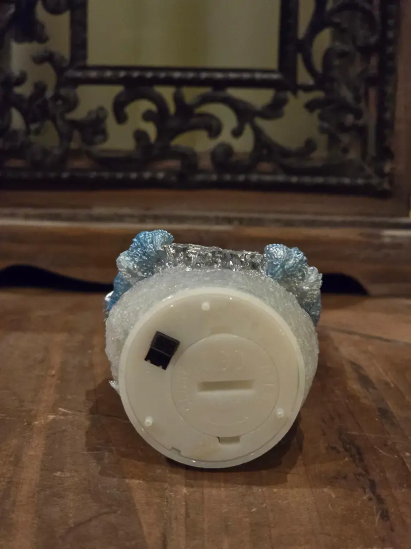Hand crafted 5"x3.5" snowman with light. Light batteries are replaceable. Battery included.