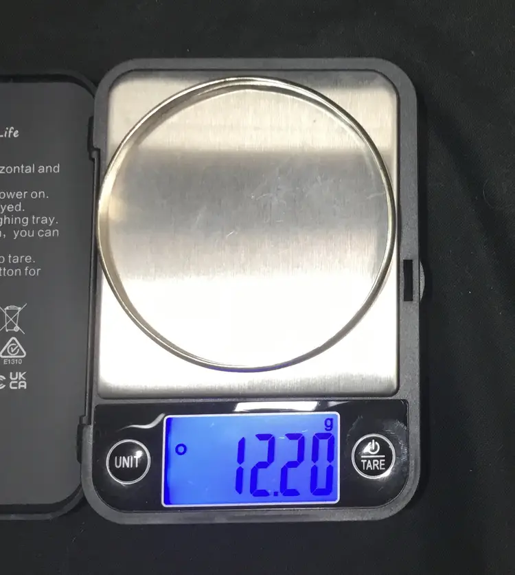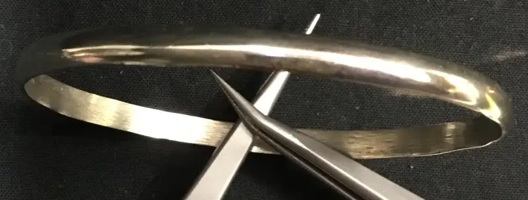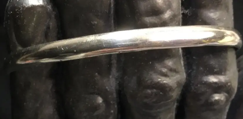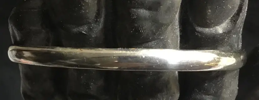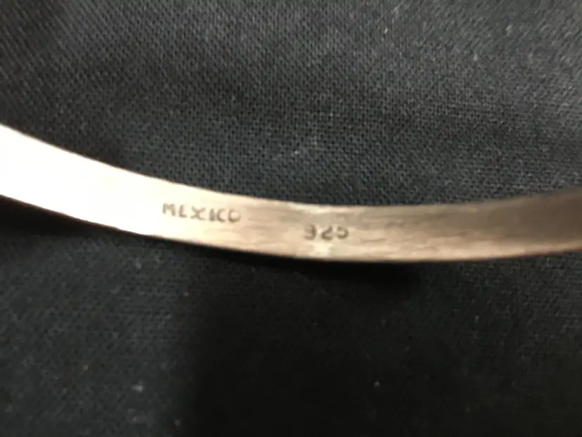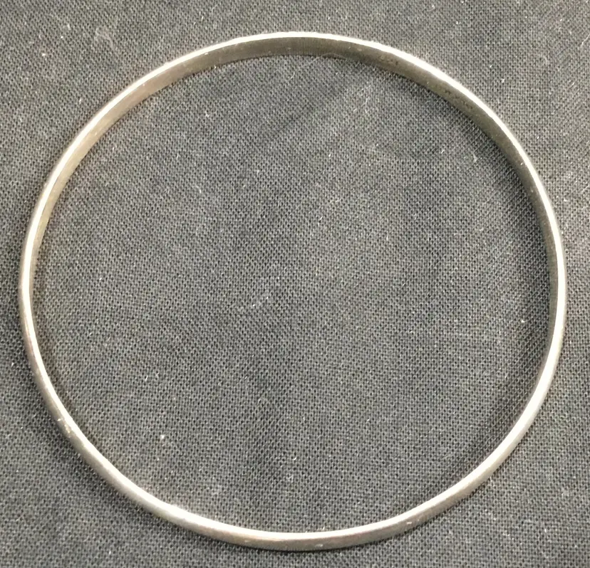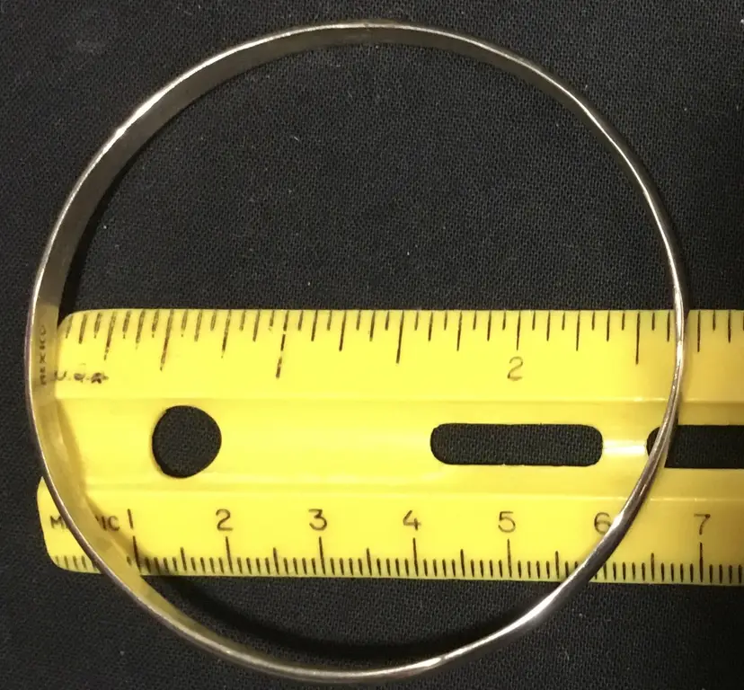 2.625 inches in diameter (Size 8) 5mm wide, solid sterling bangle from Mexico. No embellishments on bracelet, just plain sterling bangle. 12.2 grams weight. Minute scratches, tiny bits of tarnish (See all photos)