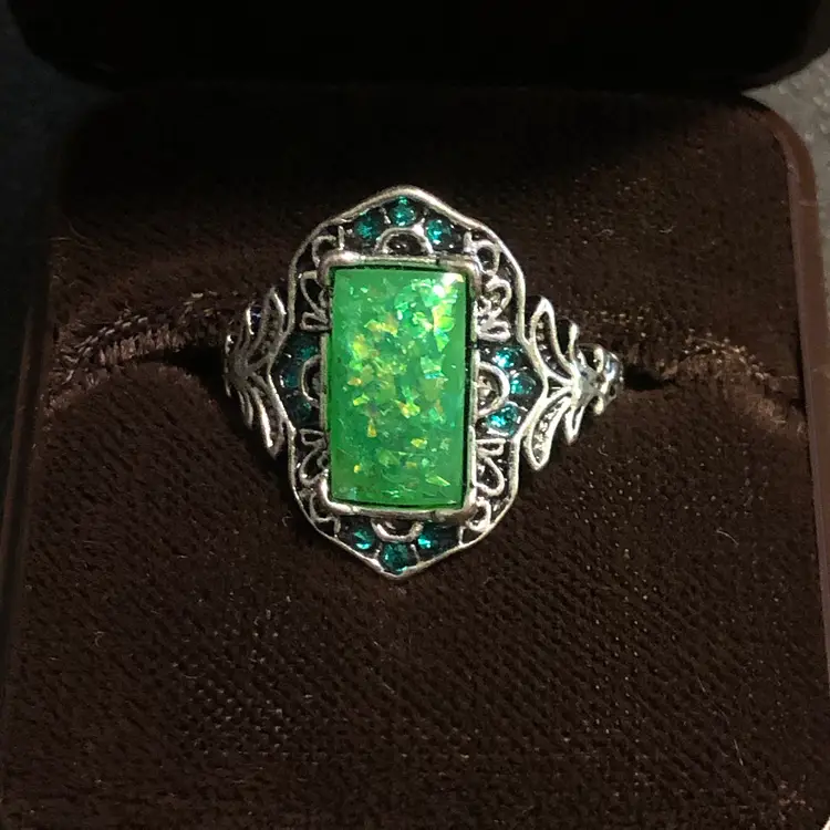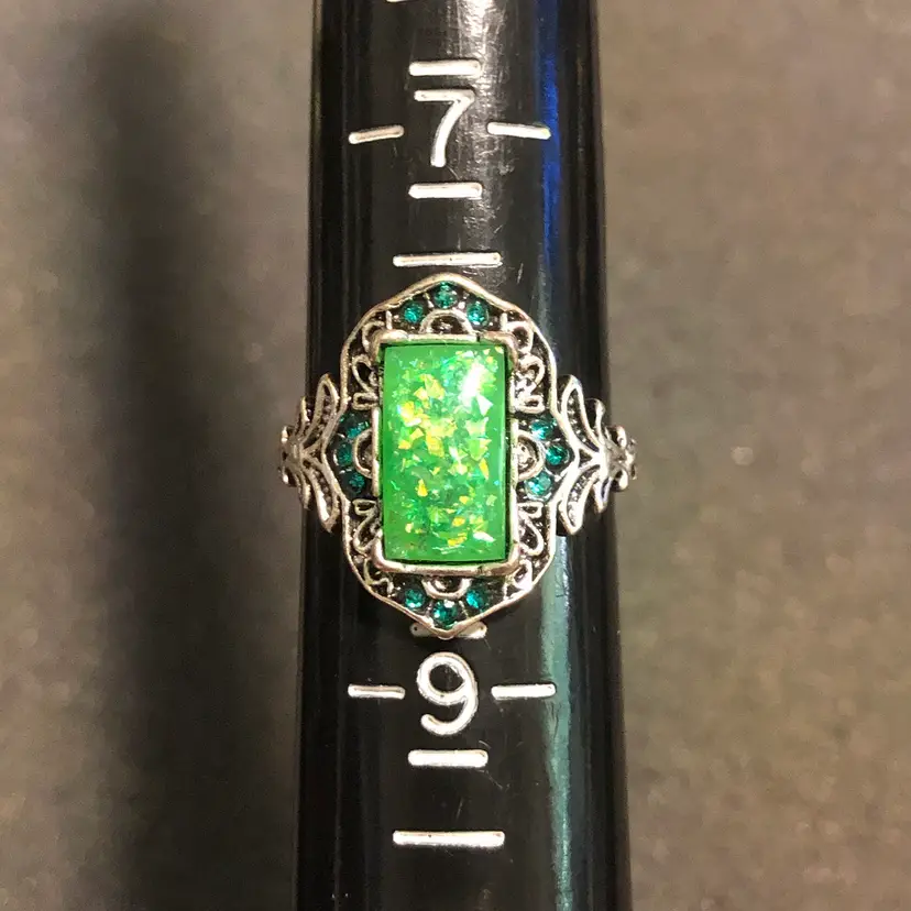 Synthetic Green Fire Opal Silver-Tone Size 8 Ring