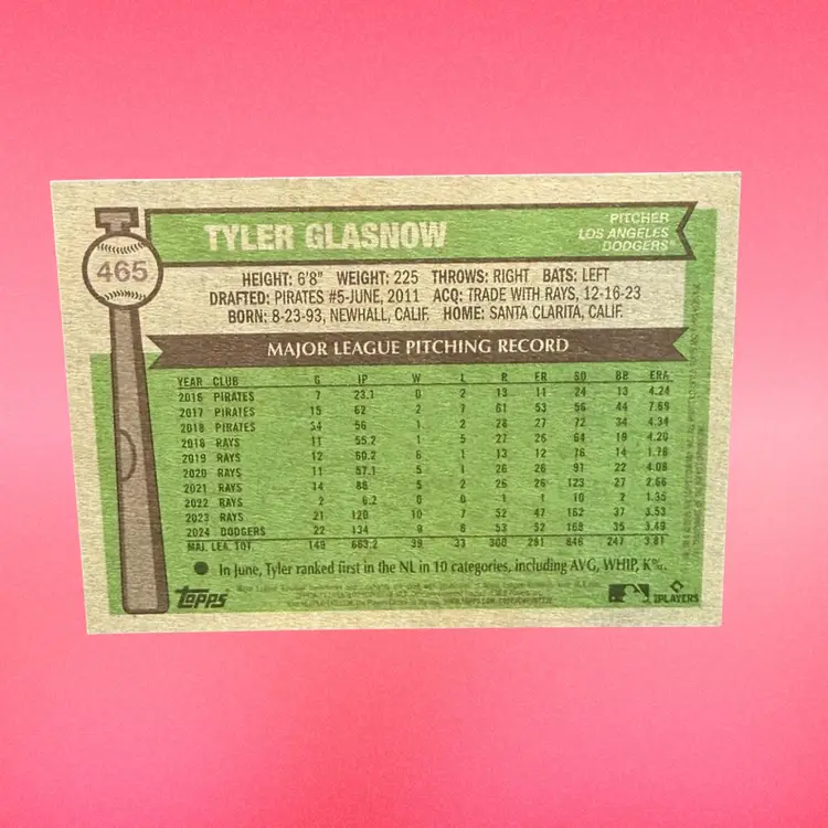 Tyler Glasnow 2025 Topps Heritage Pink #465 plus 5 2020 Prizm Pink Prospect Lot