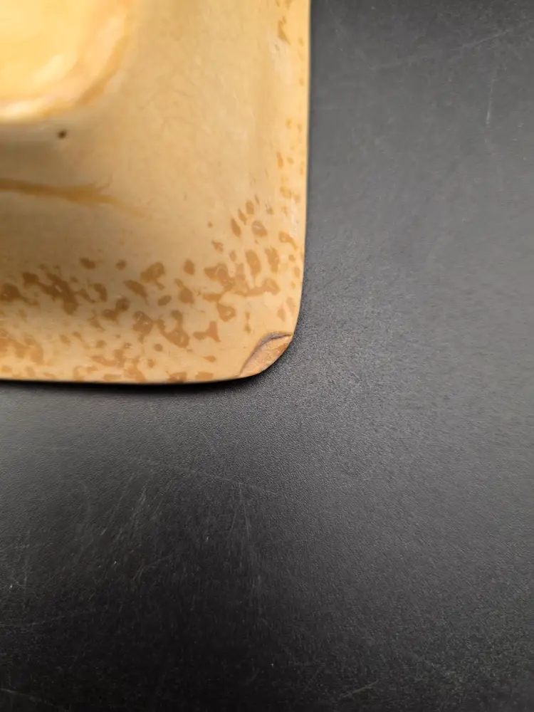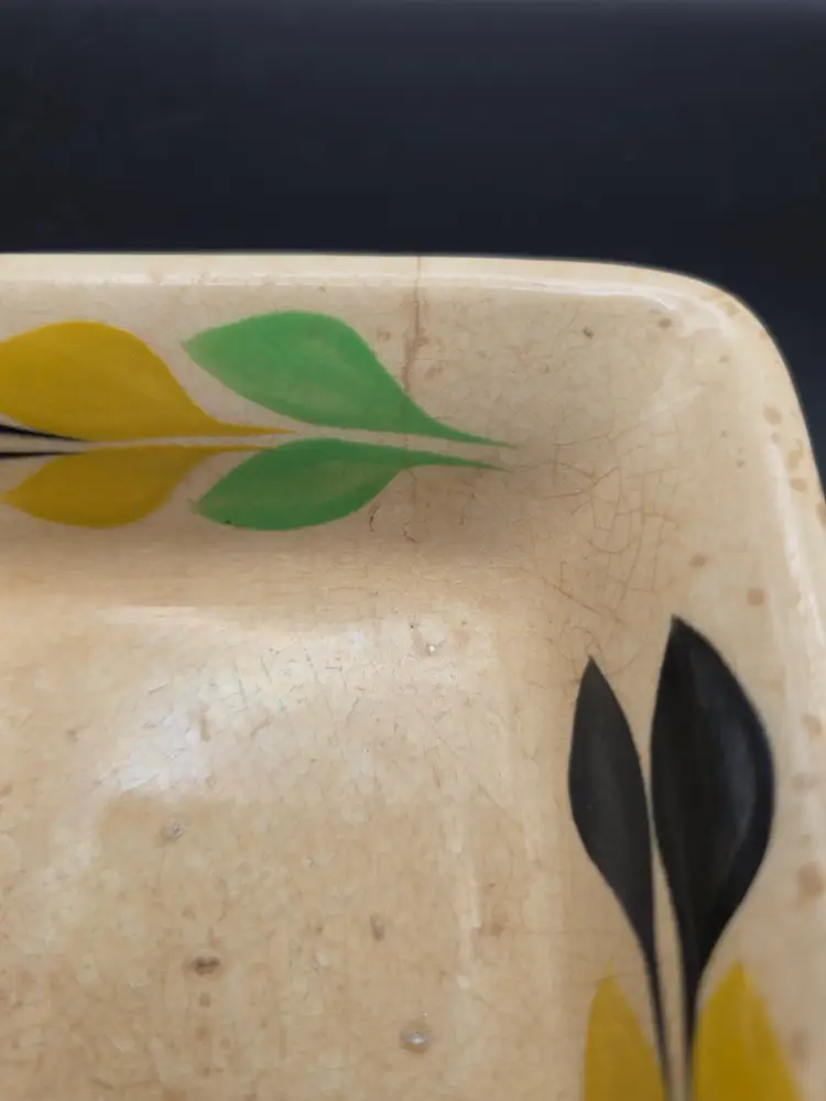 This dish has a chip and a crack. Please see photos.