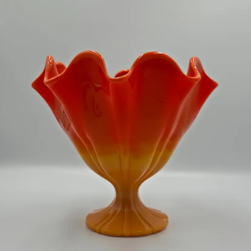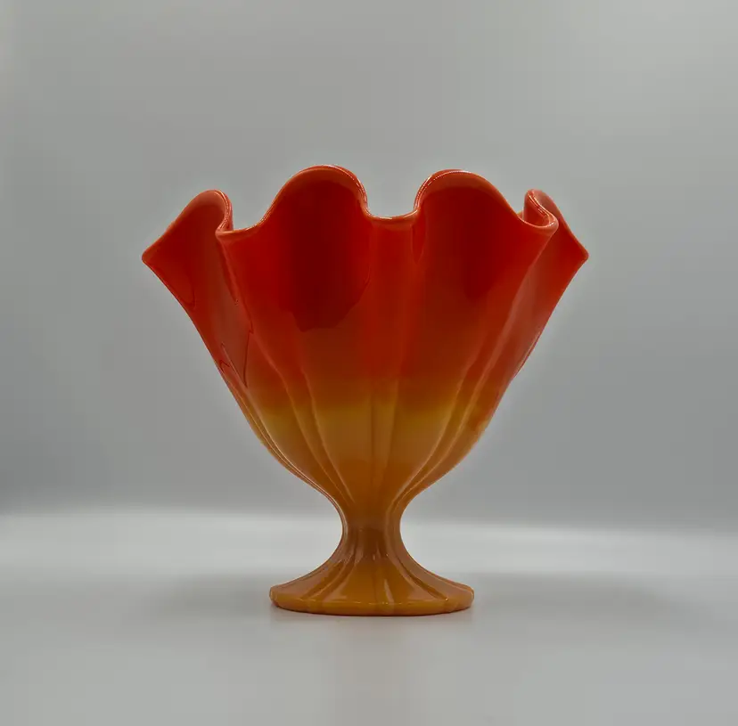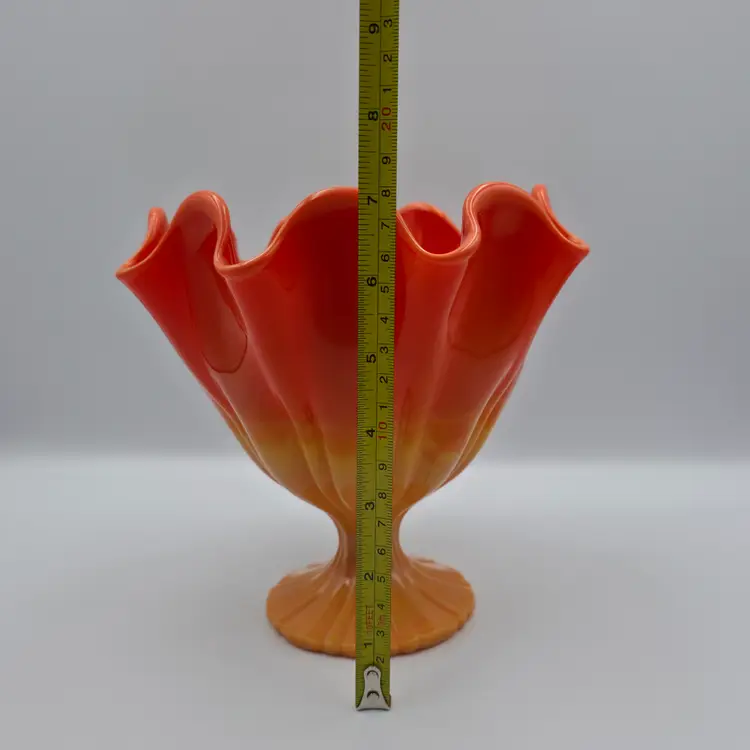 This piece has a beautiful variation of dark orange to light orange. It is in very good condition with no chips or cracks. Measures approximately 7.25 inches tall and 8 inches at the widest point. Thank you for looking and have a great day!