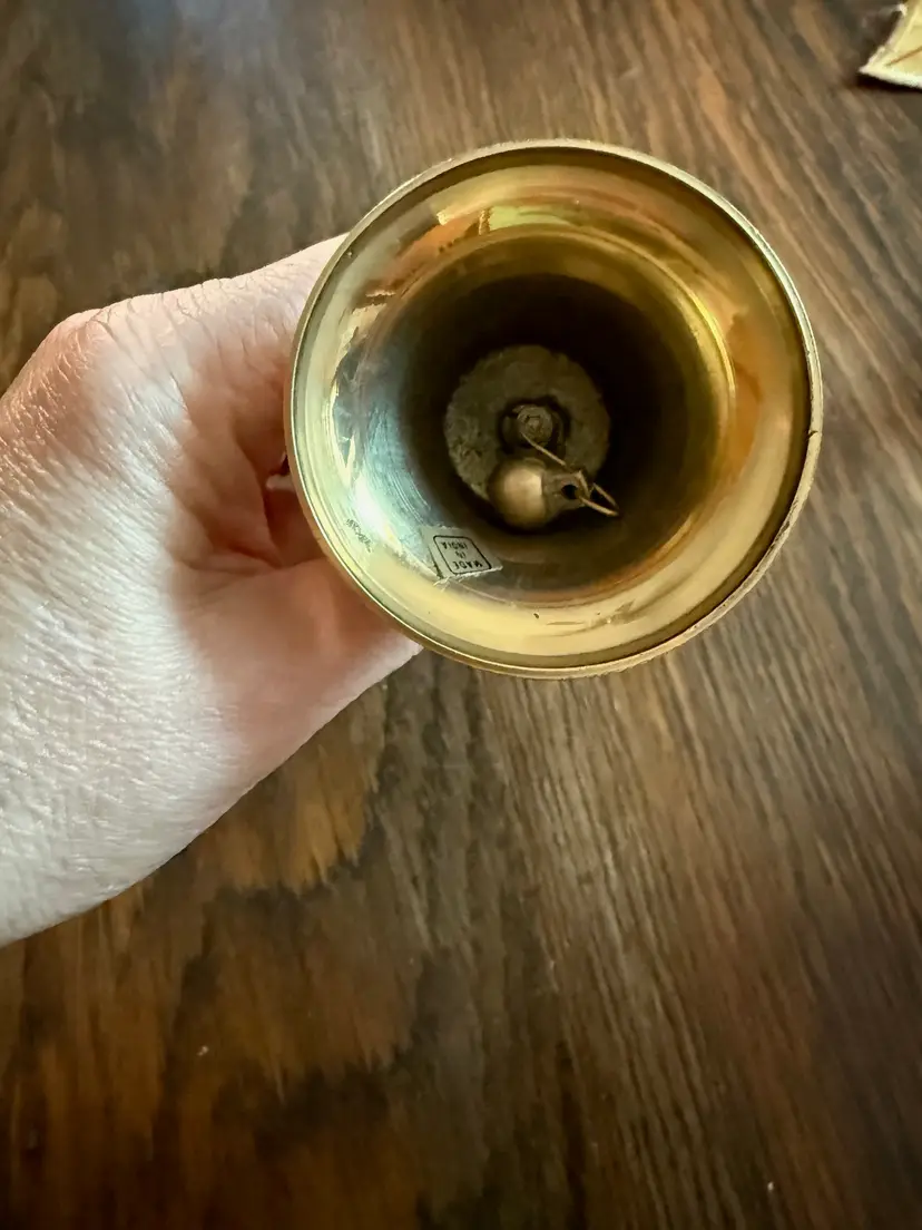 ✨ Details: Material: Solid brass Height: 6 inches Finish: Polished gold tone Clapper: Brass ball clapper, strong tone Origin: Likely Indian export, circa 1980s–1990s Includes original box
