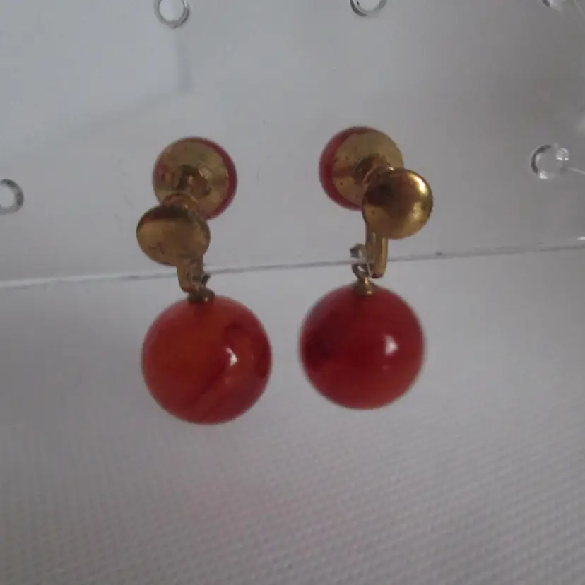 Vintage amber Lucite ball and chain dangle screw back earrings. The Lucite does have the swirly darker veins in it. They measure 5/8" across and dangle 1 1/4" down.