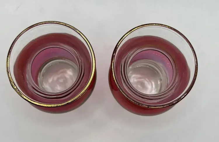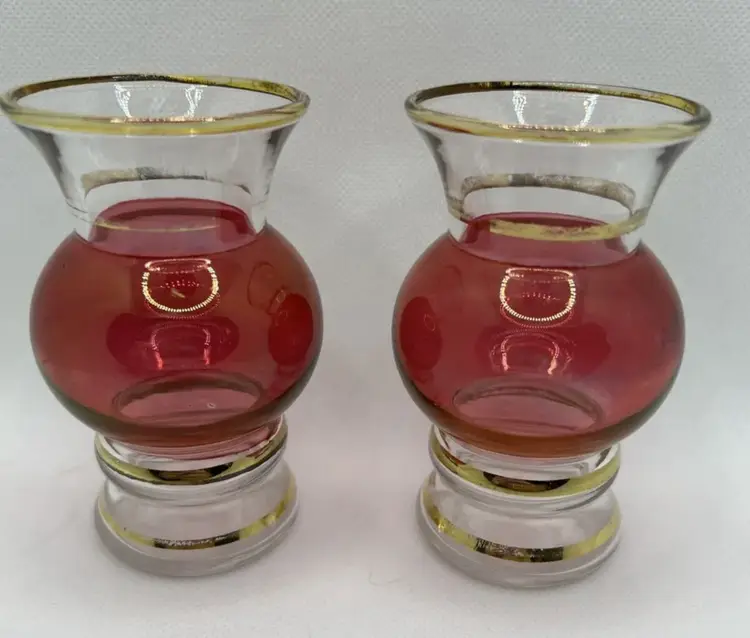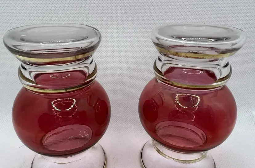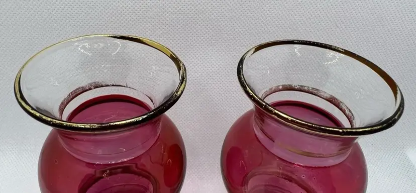 Vintage Bartlett Collins Bud Vases (2) Cranberry Ruby Red Flash Glass Gold Trim