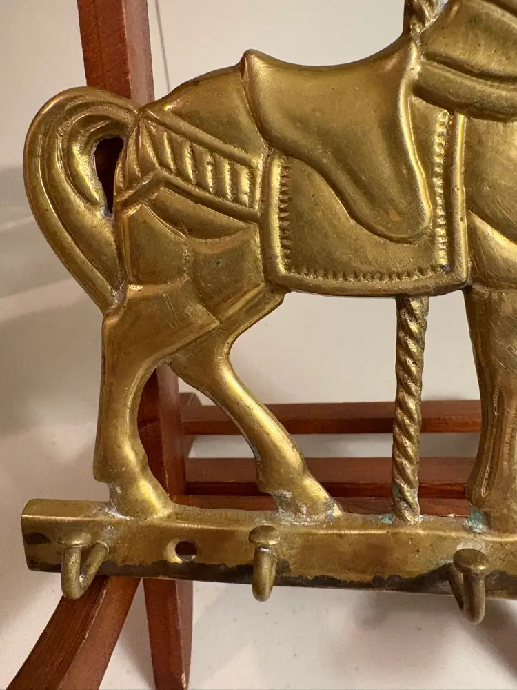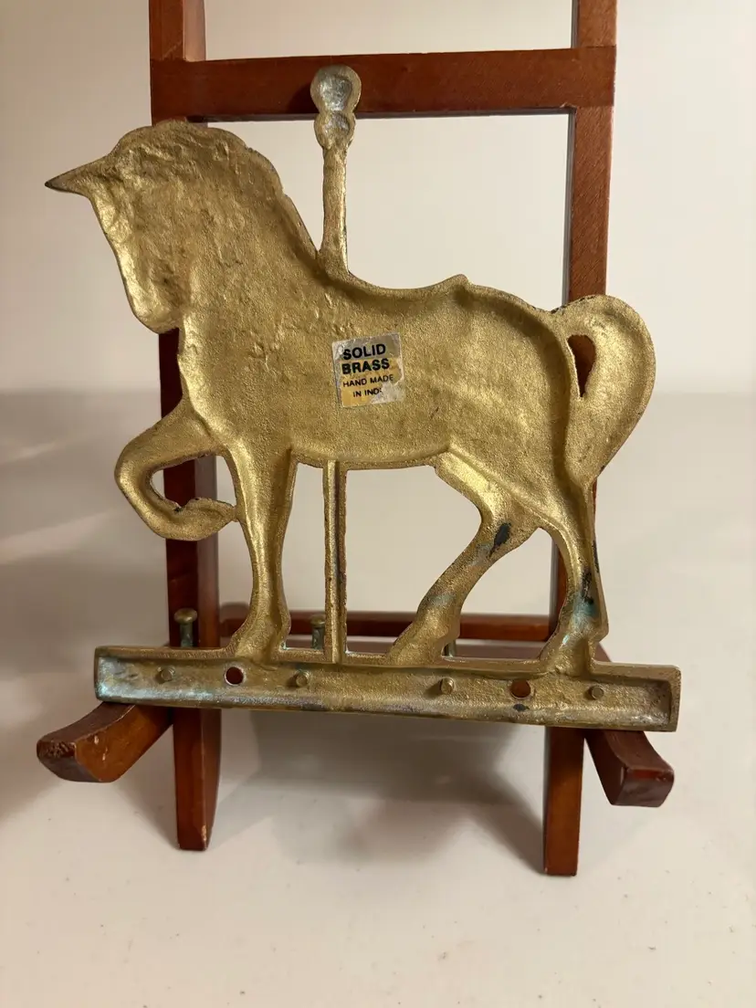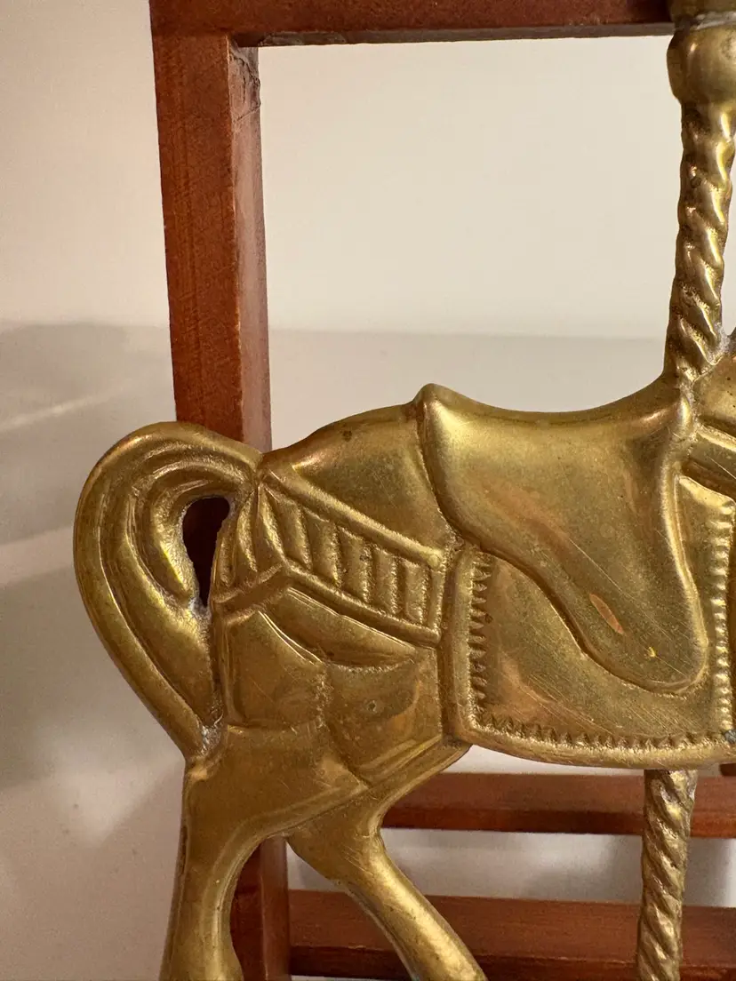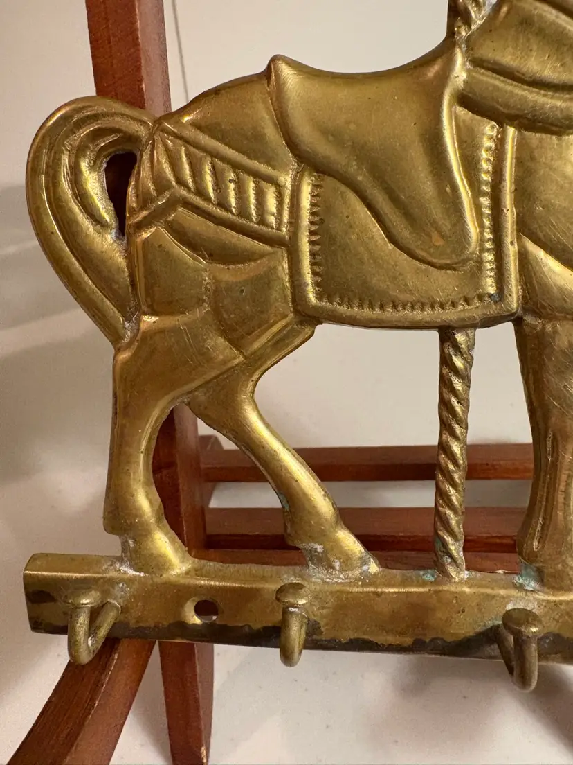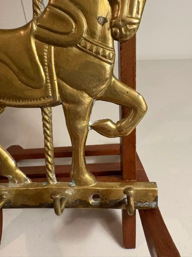 This Vintage Brass Carousel Merry Go Round Horse Key Holder Rack Wall Hook Hanger is a charming and functional decorative accessory for your home. With a round shape and brass material, this key rack adds a touch of nostalgia to your space. It is wall-mounted and requires no assembly, making it easy to install and use. The item is less than 6 inches in height and 6 inches in length, making it a versatile piece that can fit in various rooms. Perfect for organizing keys and adding a unique touch to your home decor.