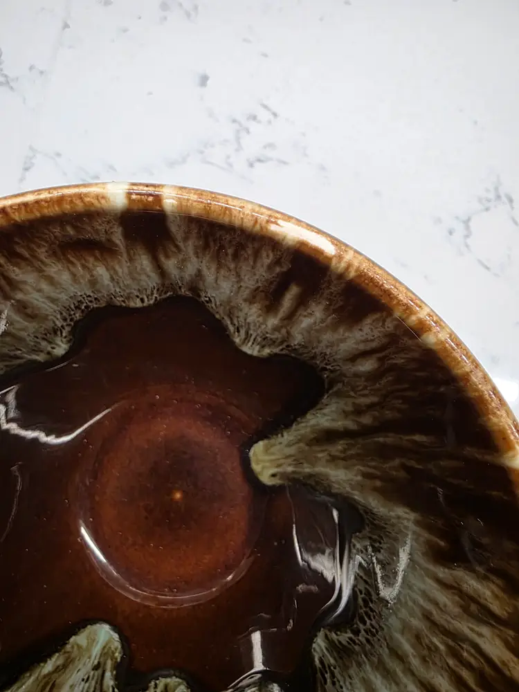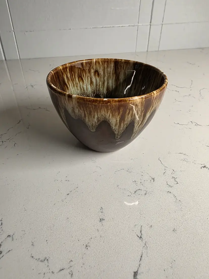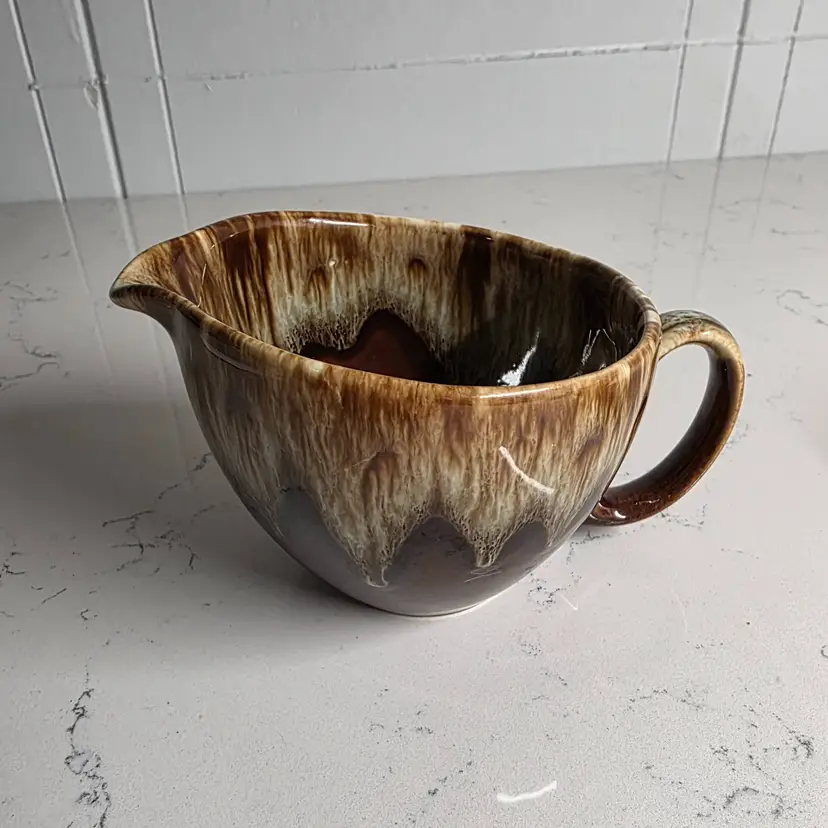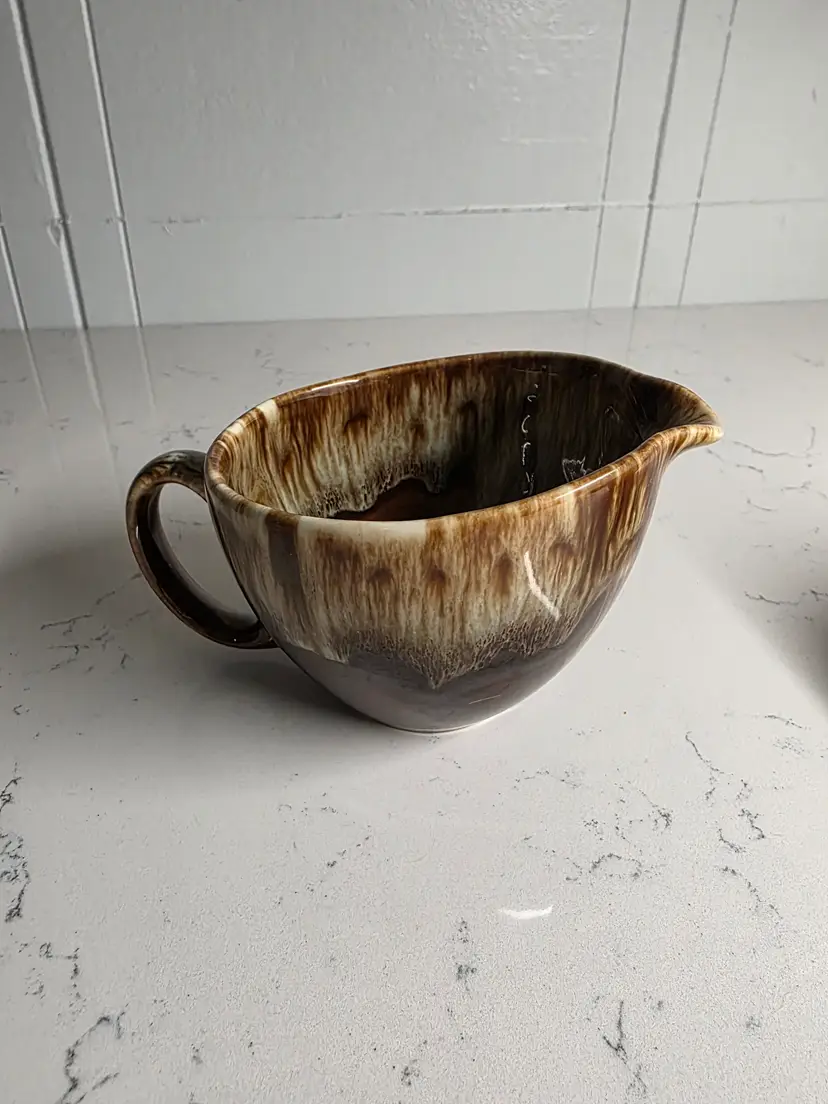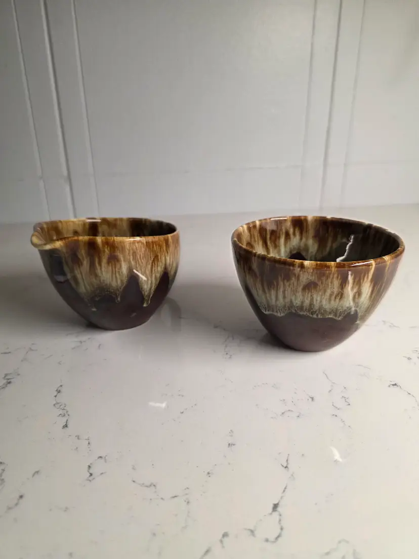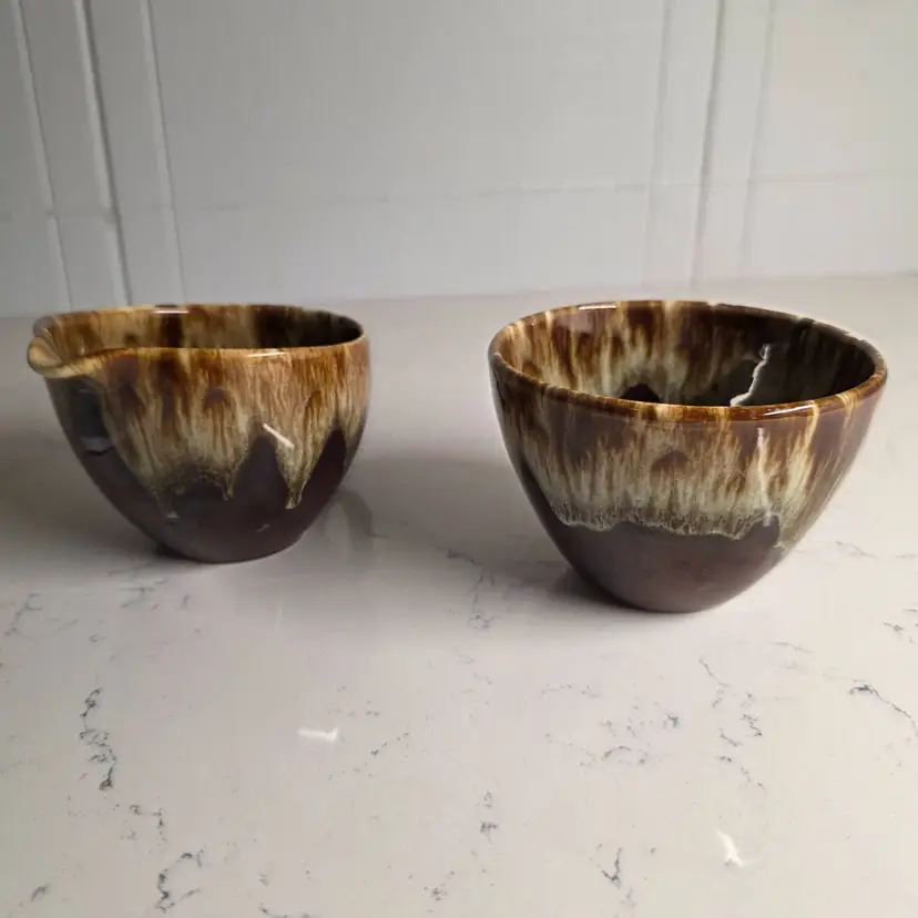 This set features the signature brown drip glaze with rich, earthy tones and unique variations in the finish, this set adds warmth and character to any kitchen or display. Perfect for collectors or lovers of rustic, vintage-inspired decor. Very small chip (which looks like part of paint) on edge of bowl- see in photos.