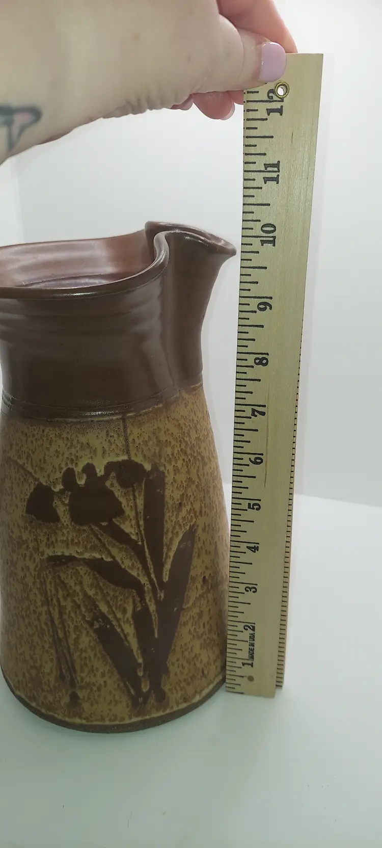 This is an ABSOLUTELY GORGEOUS Vintage studio pottery jug or pitcher. It is made of stoneware with a speckled, glazed finish. It features a brown, abstract floral leaf motif on a lighter, speckled background. Measurement is 10 inches tall and 6 inches wide at the bottom. This pitcher is well made and heavy. There is a maker's mark on the bottom that I'm not able to identify. It is a mystery BUT this is a VERY #RARE item!! This item is cross-posted on other apps so if you love it grab it now! Also please see our other items for sale as we love to bundle to save on shipping! All of our packages are packed with love and care so rest assured it will arrive safely. Please send serious offers as we usually accept ones that are lower than competitive priced!