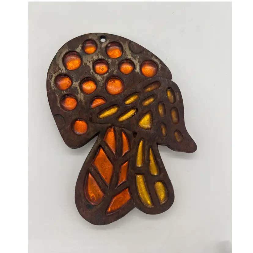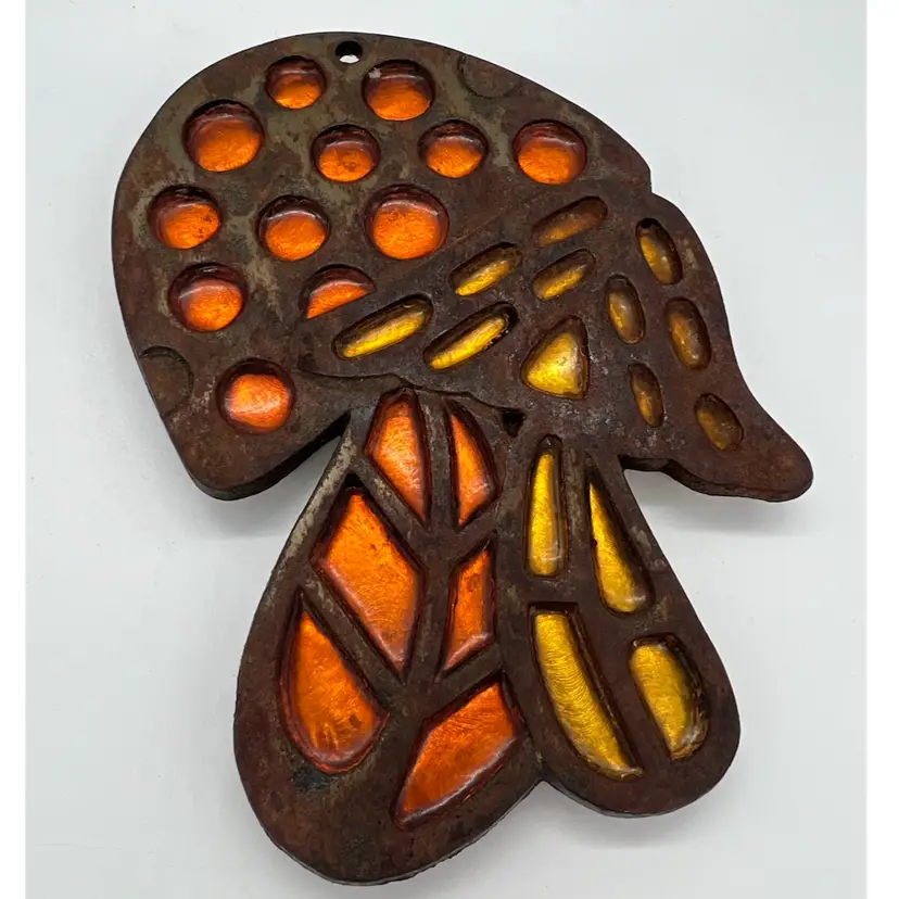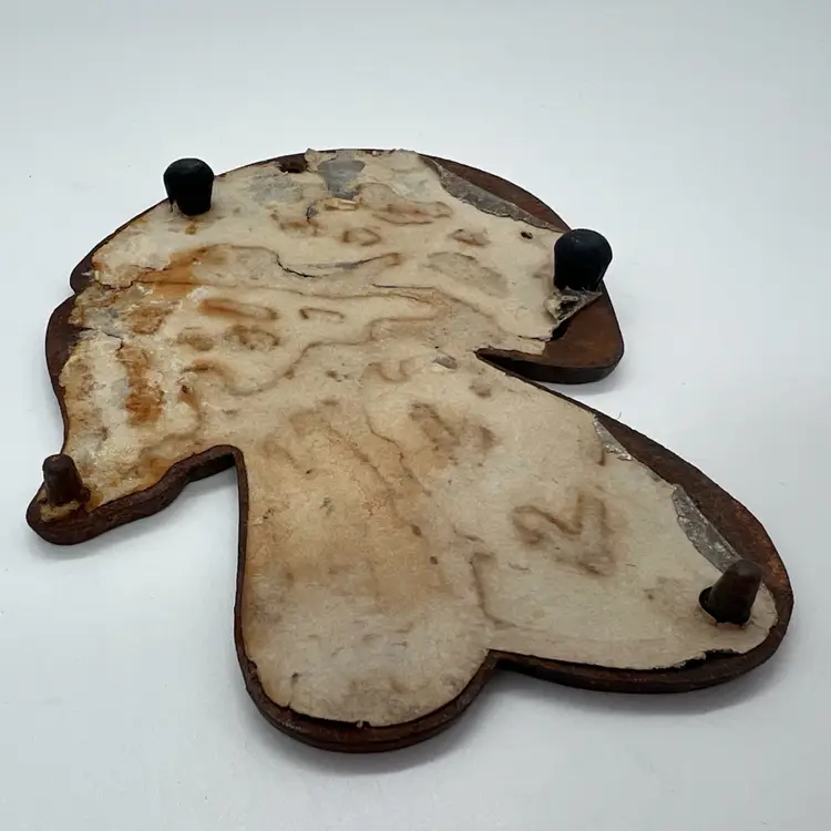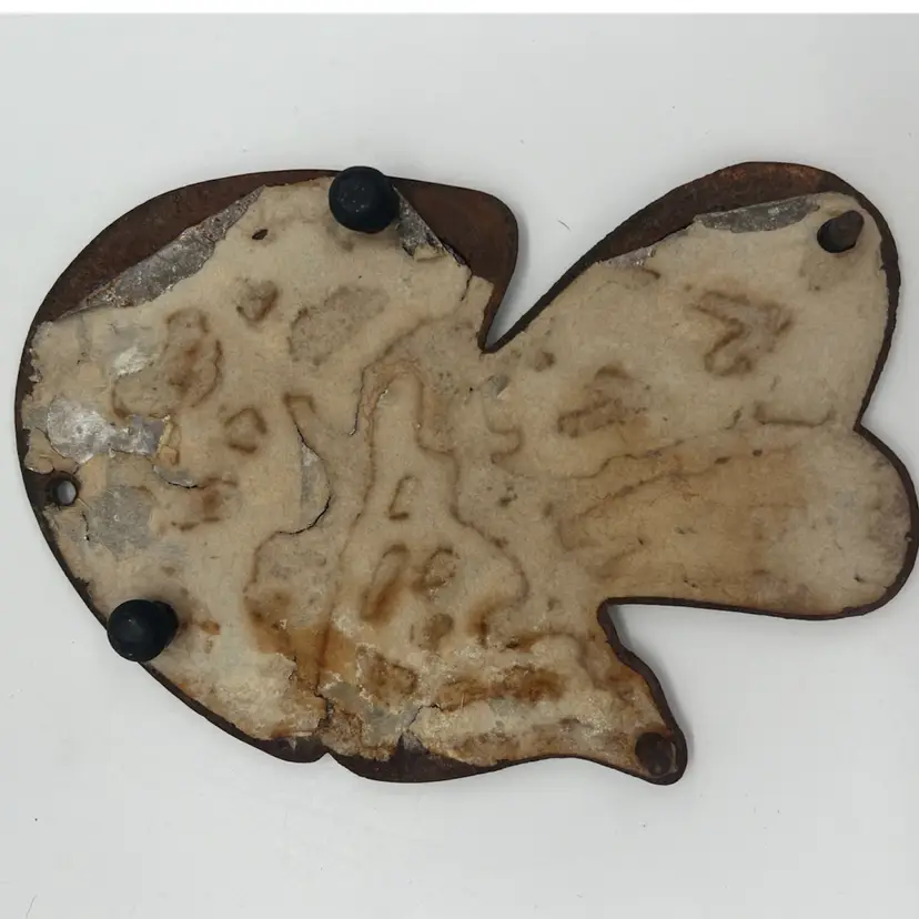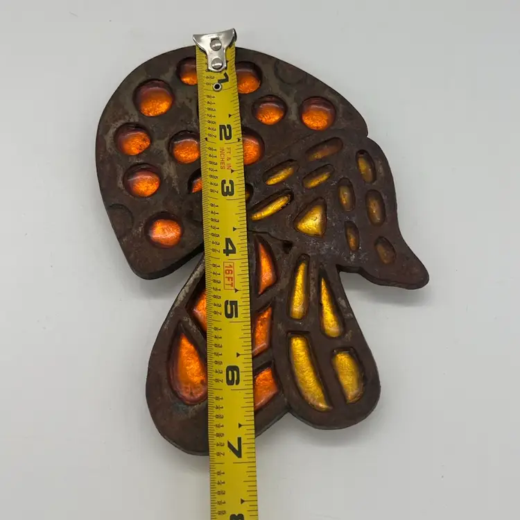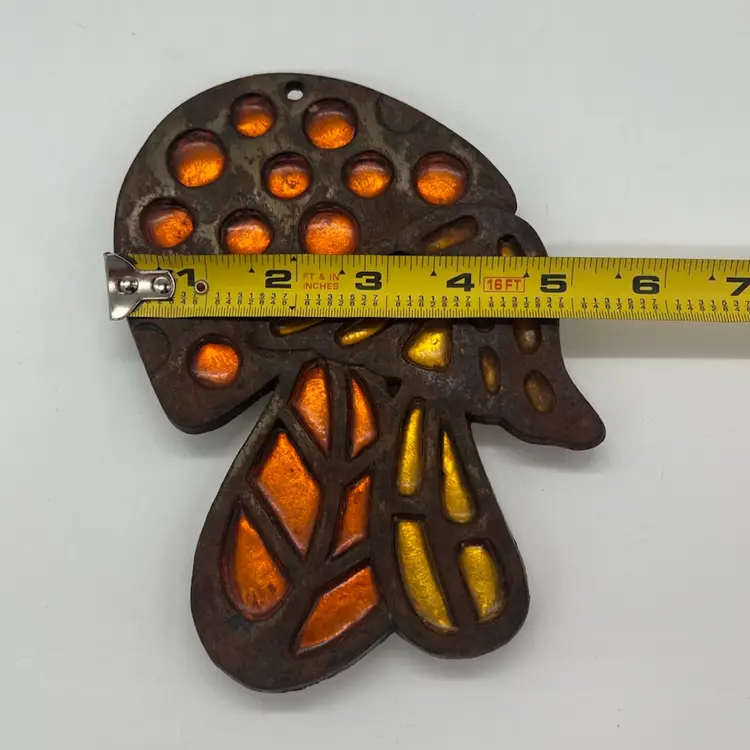 This piece shows its age, but the color is in great shape. Two of the rubber feet are missing. It would still be great as a trivet or hung on a wall. See pictures for measurements.