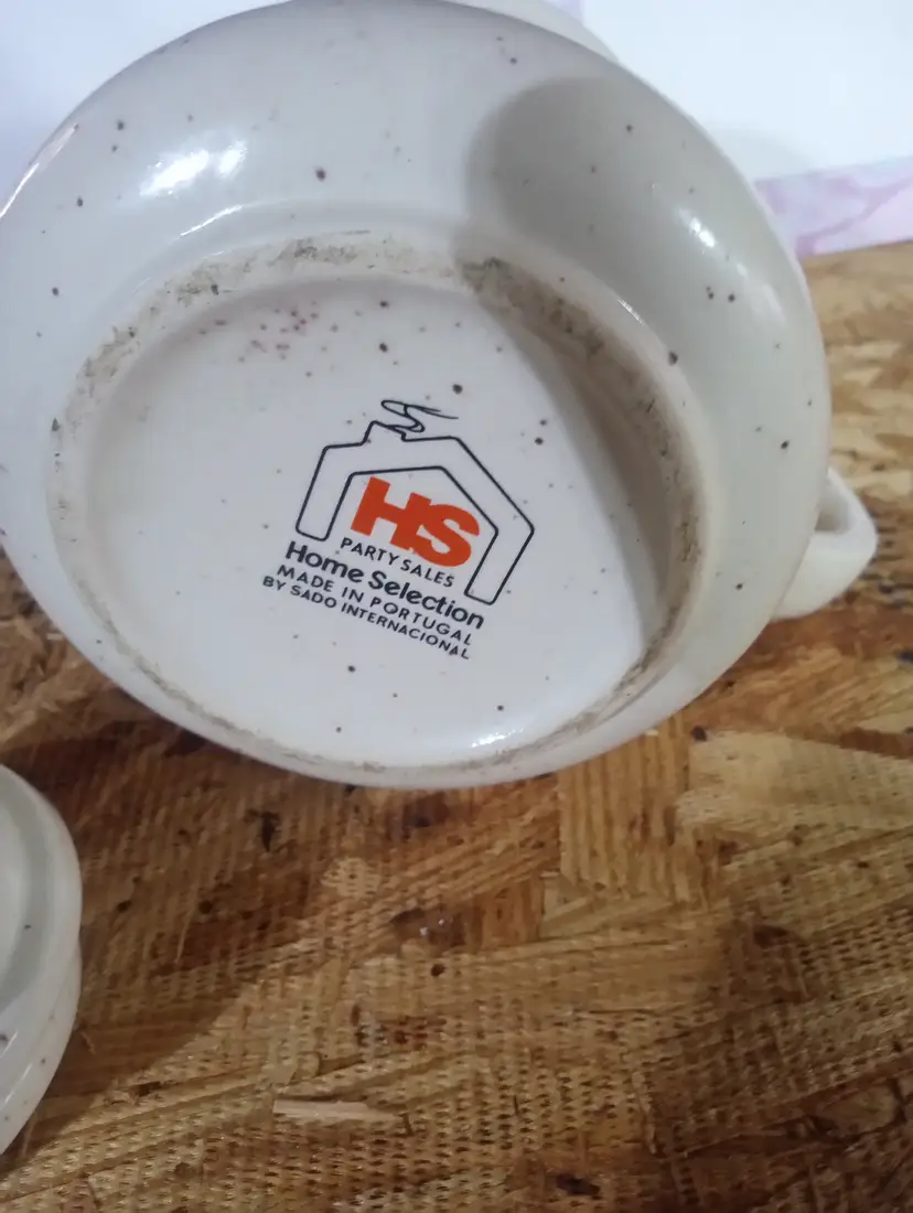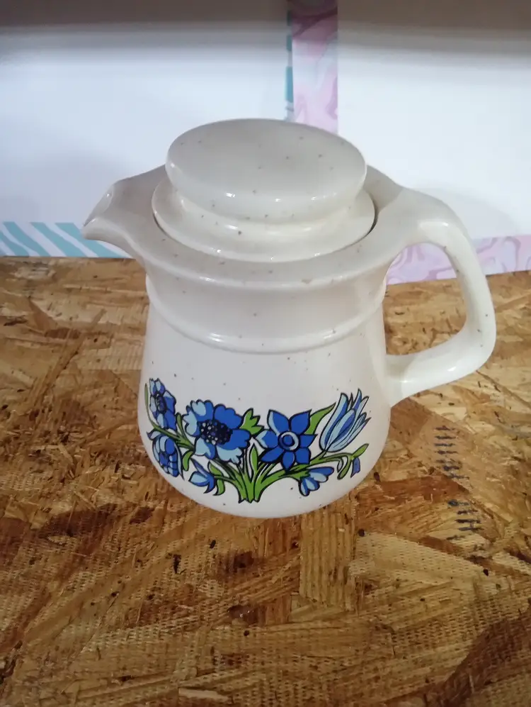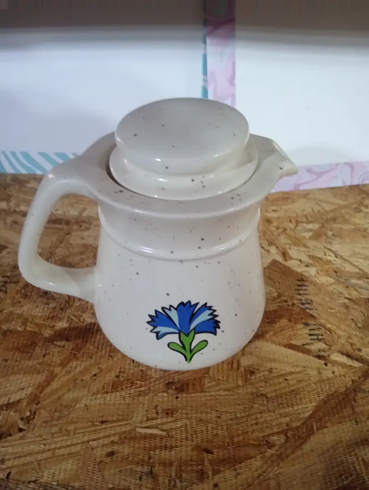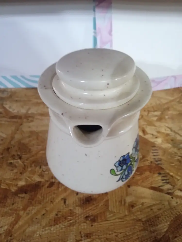 Vintage cream-colored ceramic mini pitcher with a speckled finish and a bold blue floral design on the front. Comes with matching lid. Cute farmhouse style — perfect for display, creamer, syrup, or kitchen decor