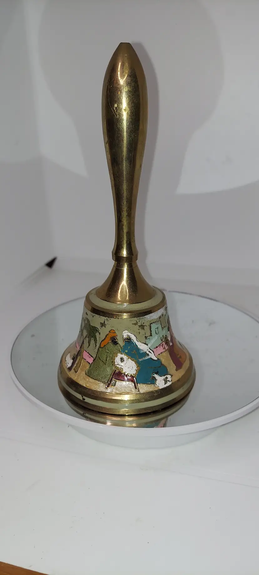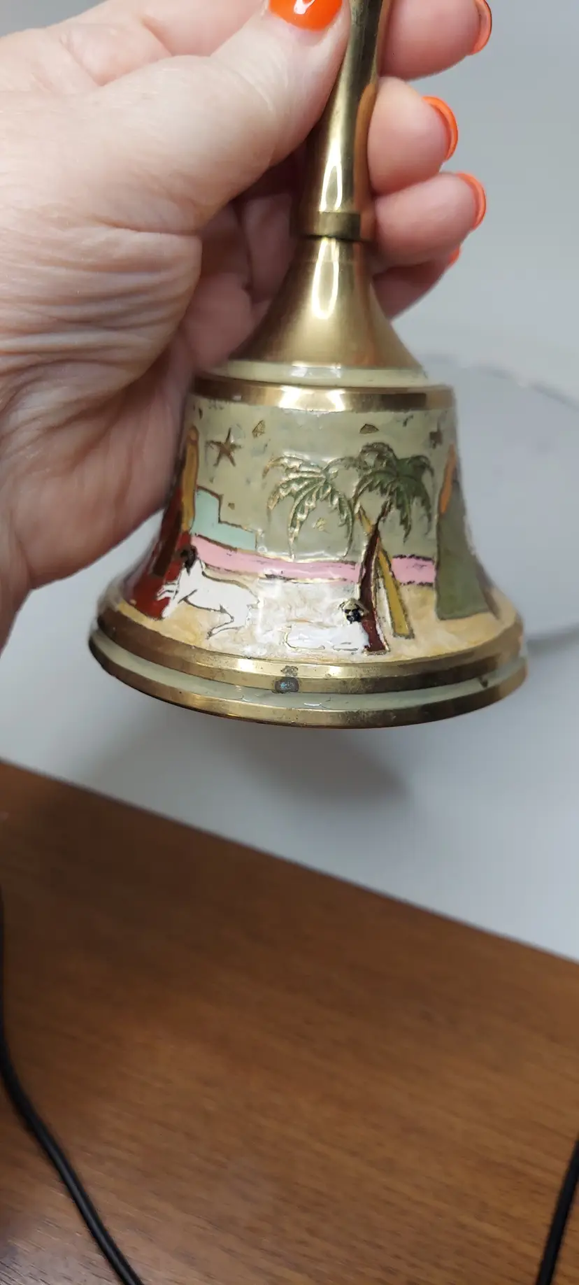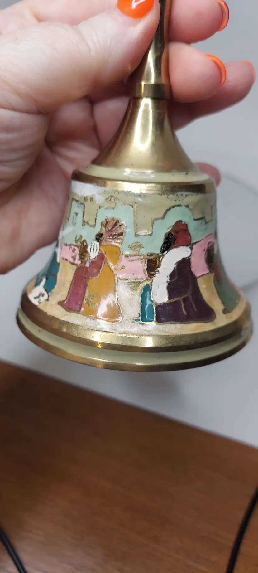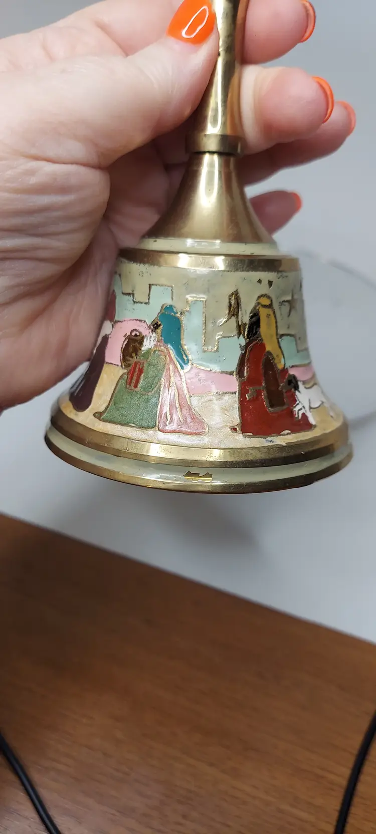 This lovely brass bell with a hand painted nativity scene is the perfect addition to your collection. Measuring 8 inches in height and featuring a cloisonné style, this vintage Christmas bell is sure to impress. The multicolor design includes wise men and is made of brass. It would be a great addition to any holiday decor and is perfect for collectors of decorative bells. Good Preowned condition, with a few little dings here and there. Please look at all pictures as they are part of the description. This item is cross-posted on other apps so if you love it grab it now! Also please see our other items for sale as we love to bundle to save on shipping! All of our packages are packed with love and care so rest assured it will arrive safely. Please send serious offers--as we usually accept ones that are lower than competitive prices! We are easy going and Happy to work with you ❤️