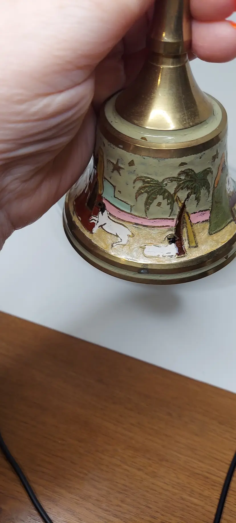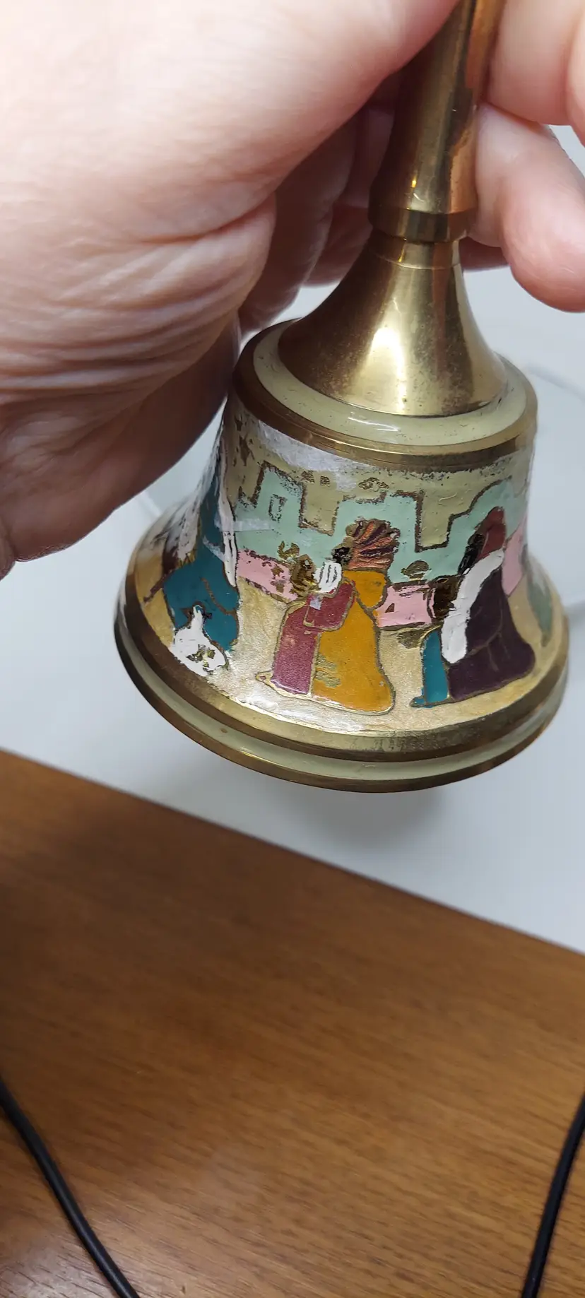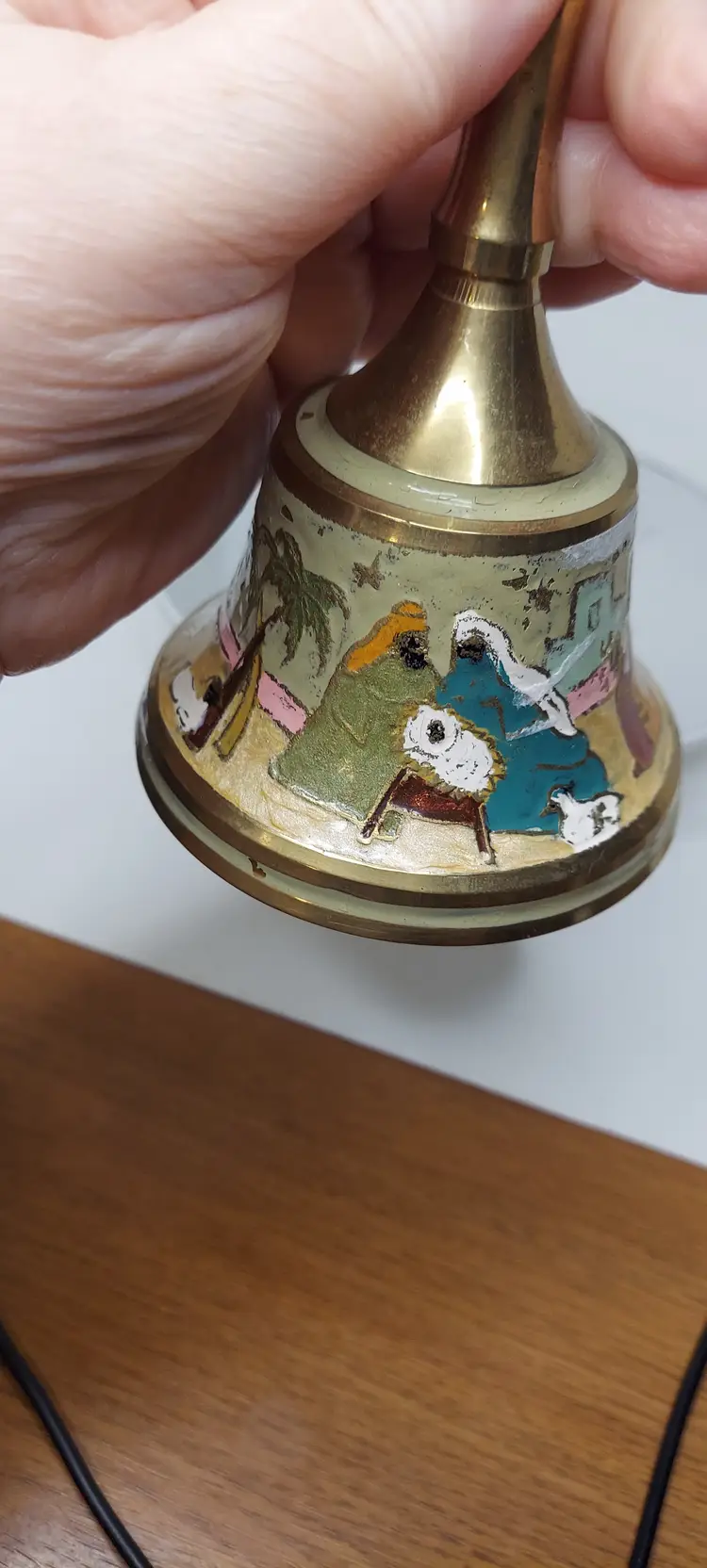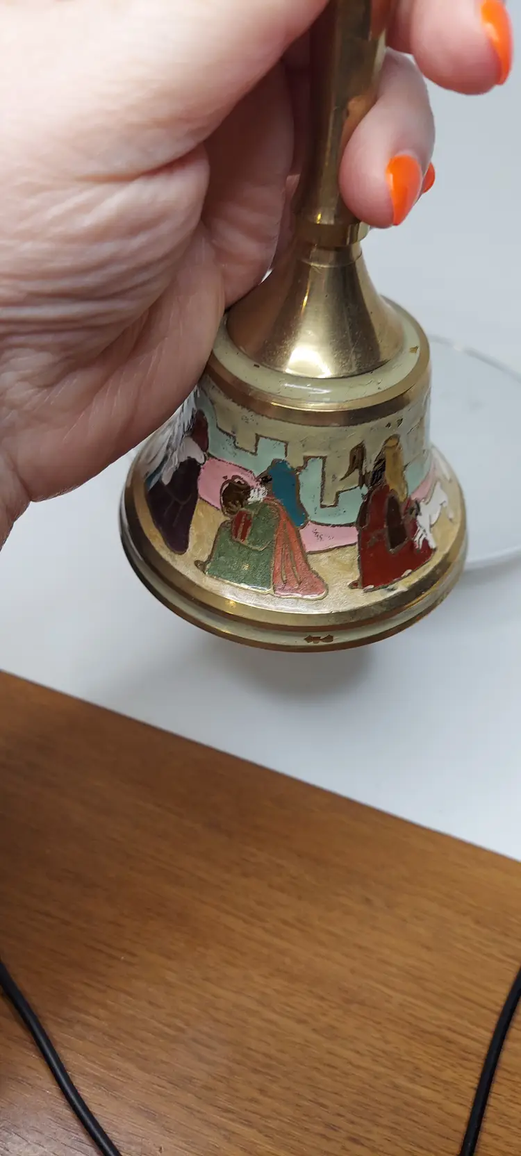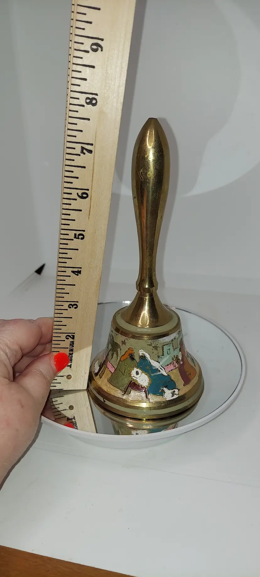 This lovely brass bell with a hand painted nativity scene is the perfect addition to your collection. Measuring 8 inches in height and featuring a cloisonné style, this vintage Christmas bell is sure to impress. The multicolor design includes wise men and is made of brass. It would be a great addition to any holiday decor and is perfect for collectors of decorative bells. Good Preowned condition, with a few little dings here and there. Please look at all pictures as they are part of the description. This item is cross-posted on other apps so if you love it grab it now! Also please see our other items for sale as we love to bundle to save on shipping! All of our packages are packed with love and care so rest assured it will arrive safely. Please send serious offers--as we usually accept ones that are lower than competitive prices! We are easy going and Happy to work with you ❤️